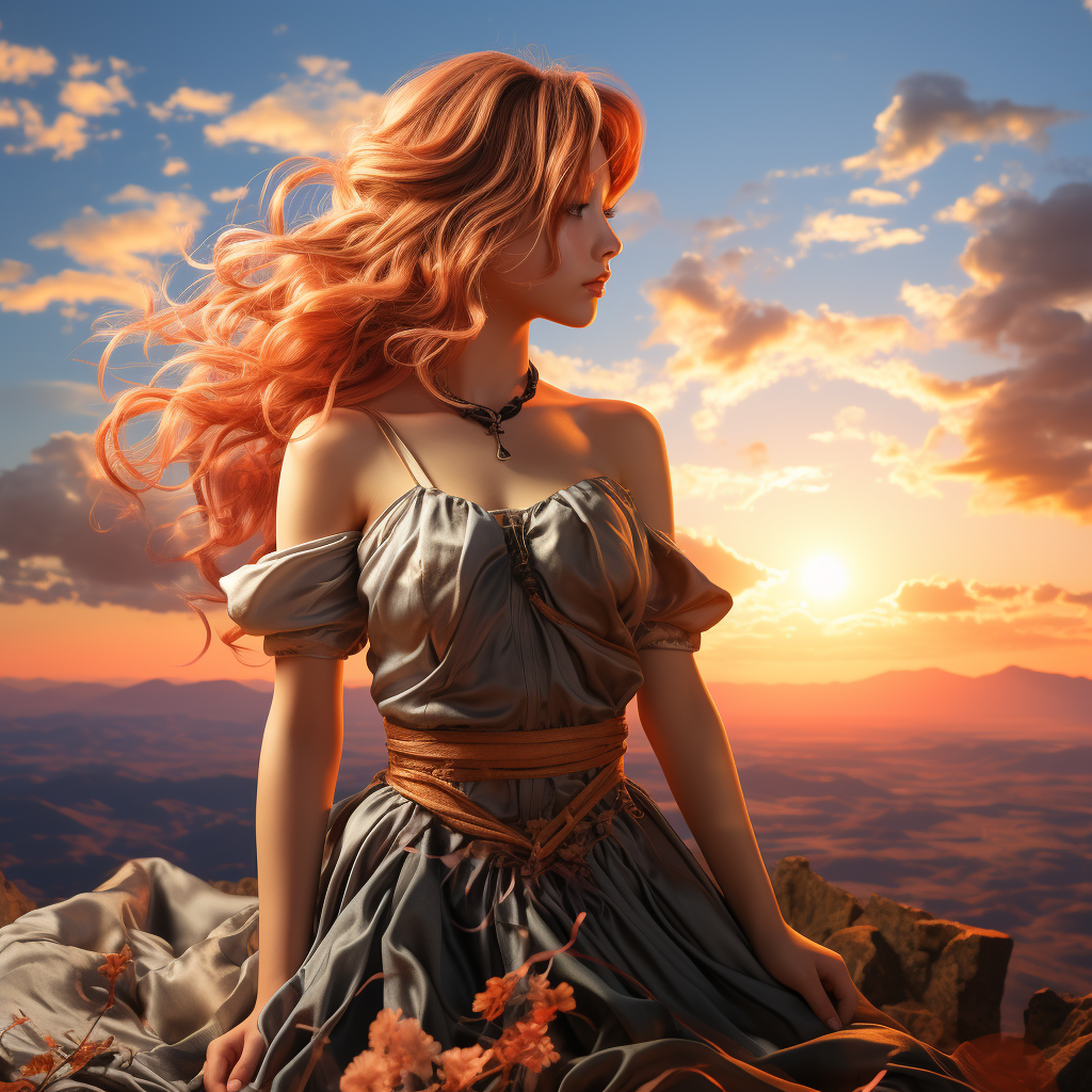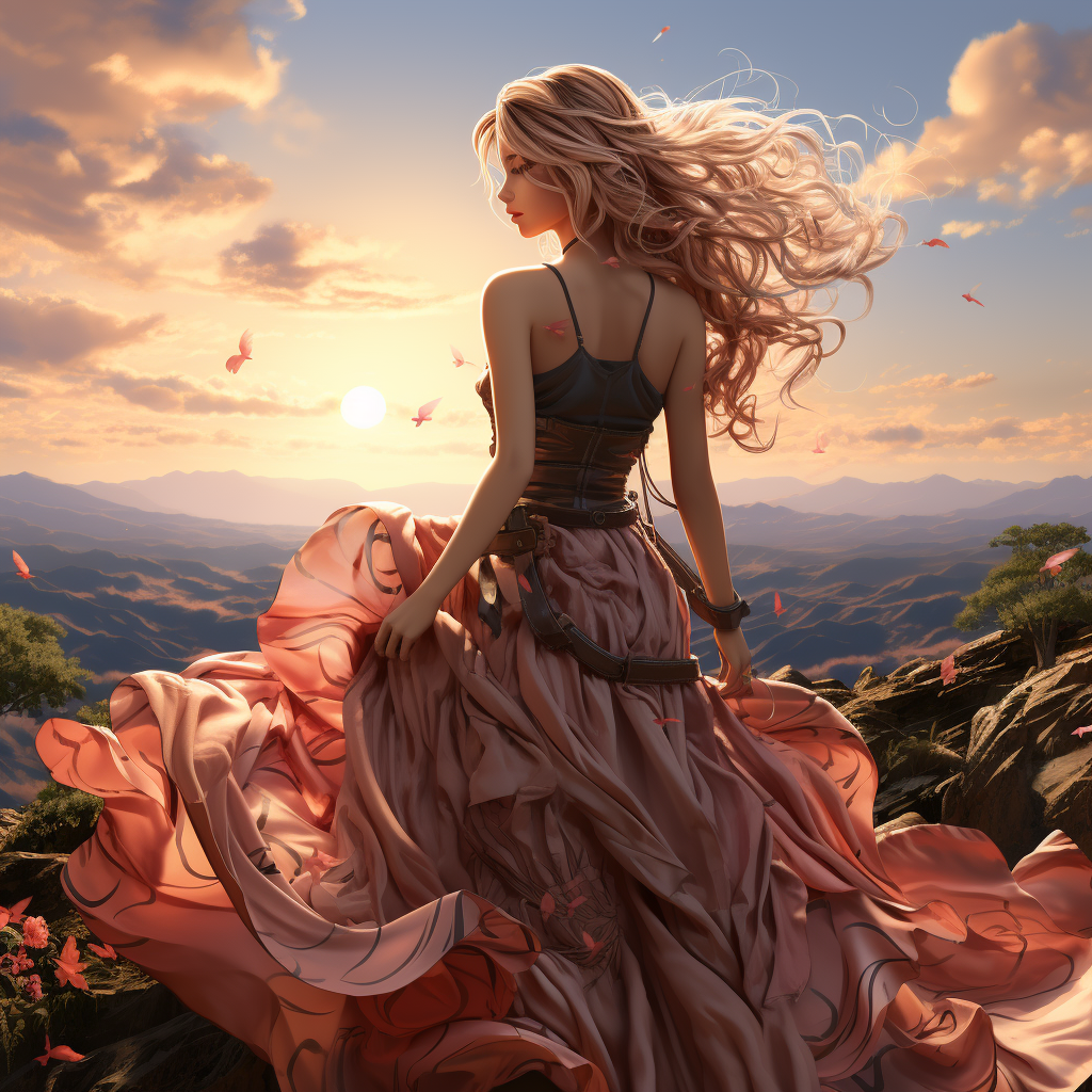 An anime girl with vibrant pink hair, wearing a flowing dress, standing on a mountaintop with a majestic sunset in the background. (Vibrant, ethereal, adventurous, sunset, mountainous, dreamlike, windswept), Mirrorless, Wide-angle lens, Golden hour, Dramatic and cinematic, N/A (digital)
