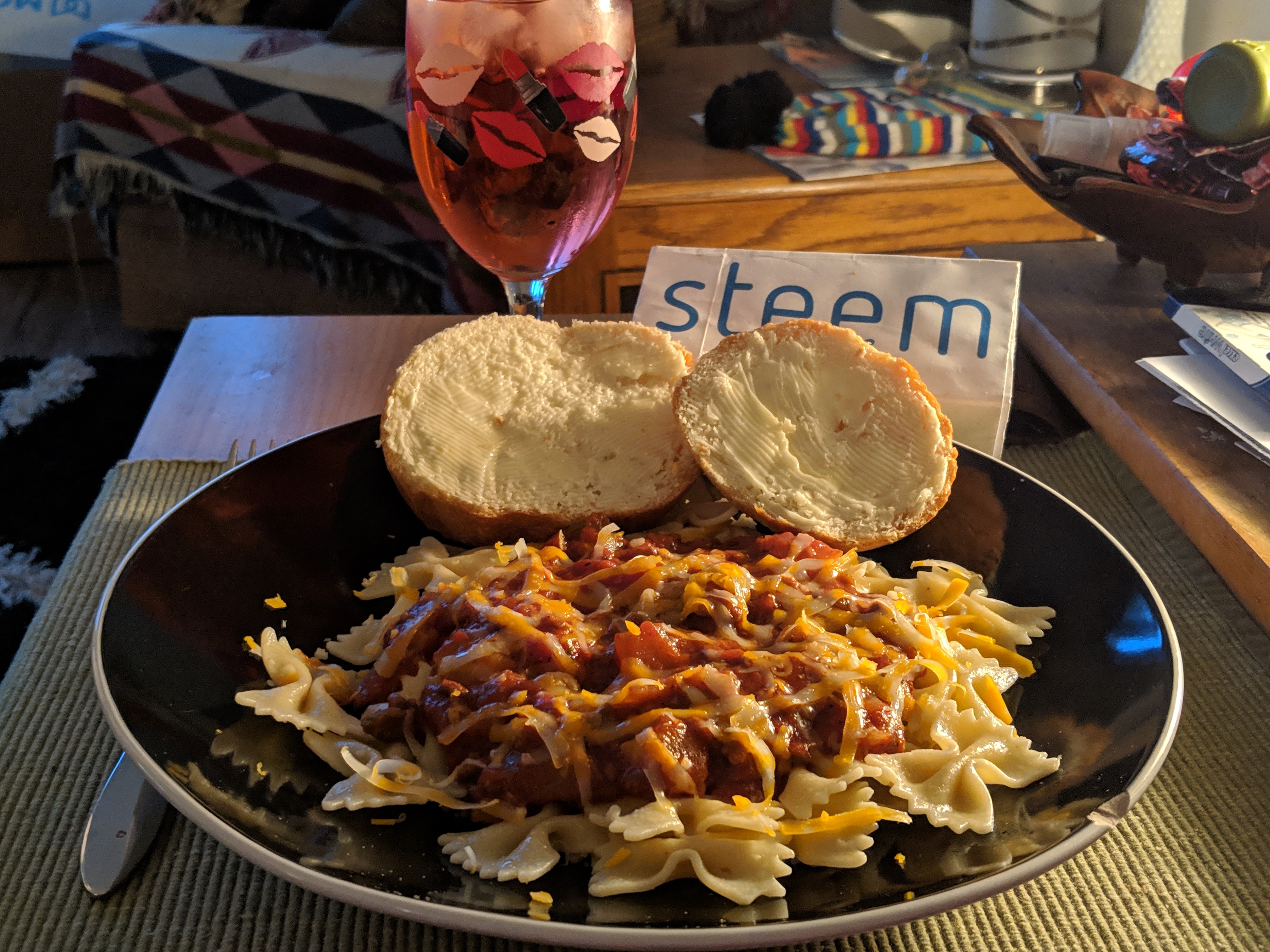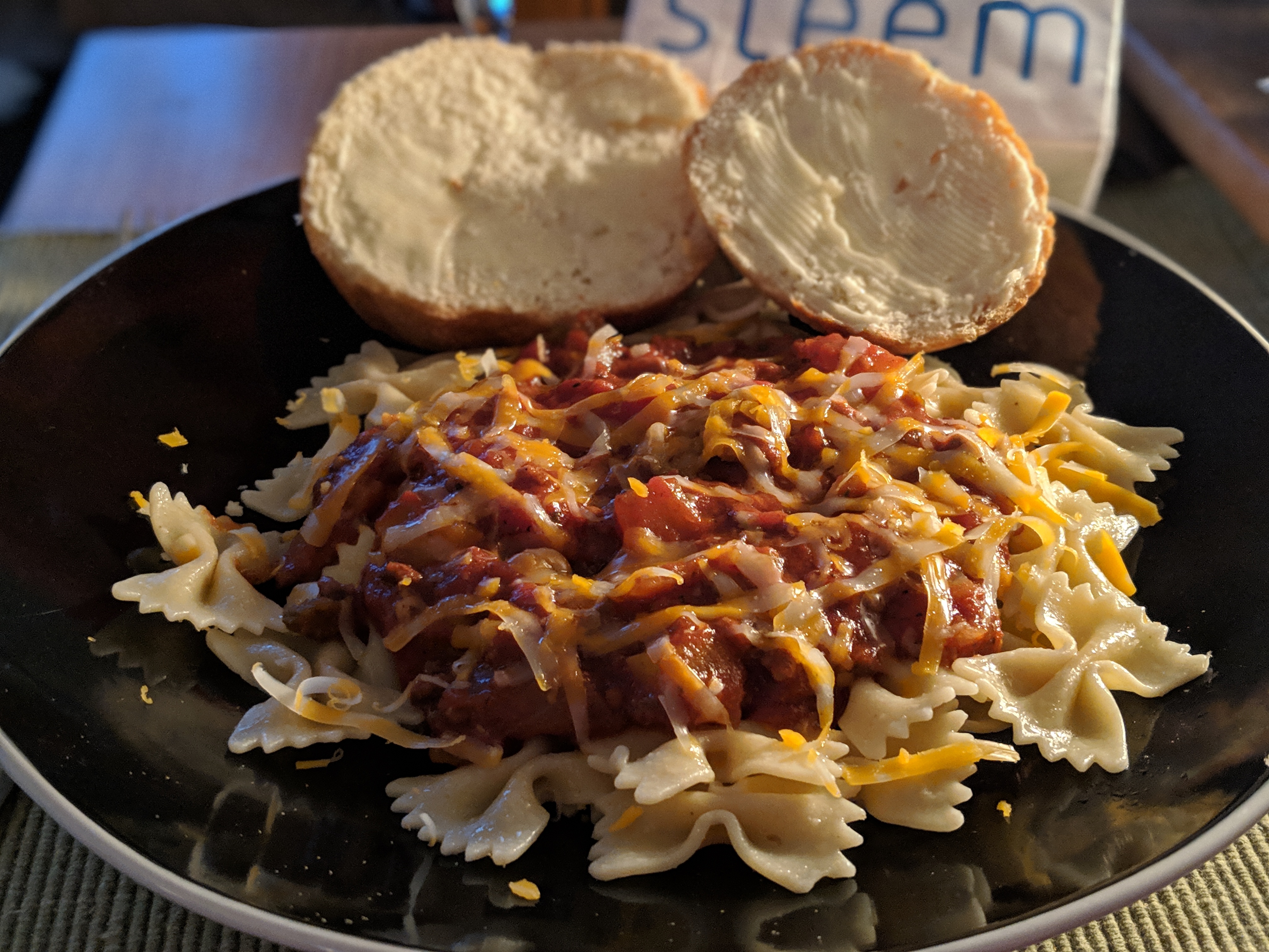 🍝Bow Tie Pasta & Tom. Sauce Topped with Grated Cheddar!...