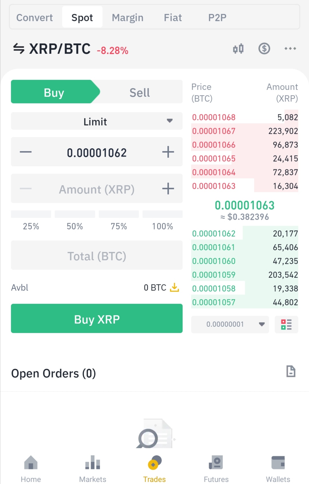 6 Below is the Open Orders section. If there is none already, it means you have bought XRP using your BTC. If not, then you can either wait or cancel the order and change the price again.