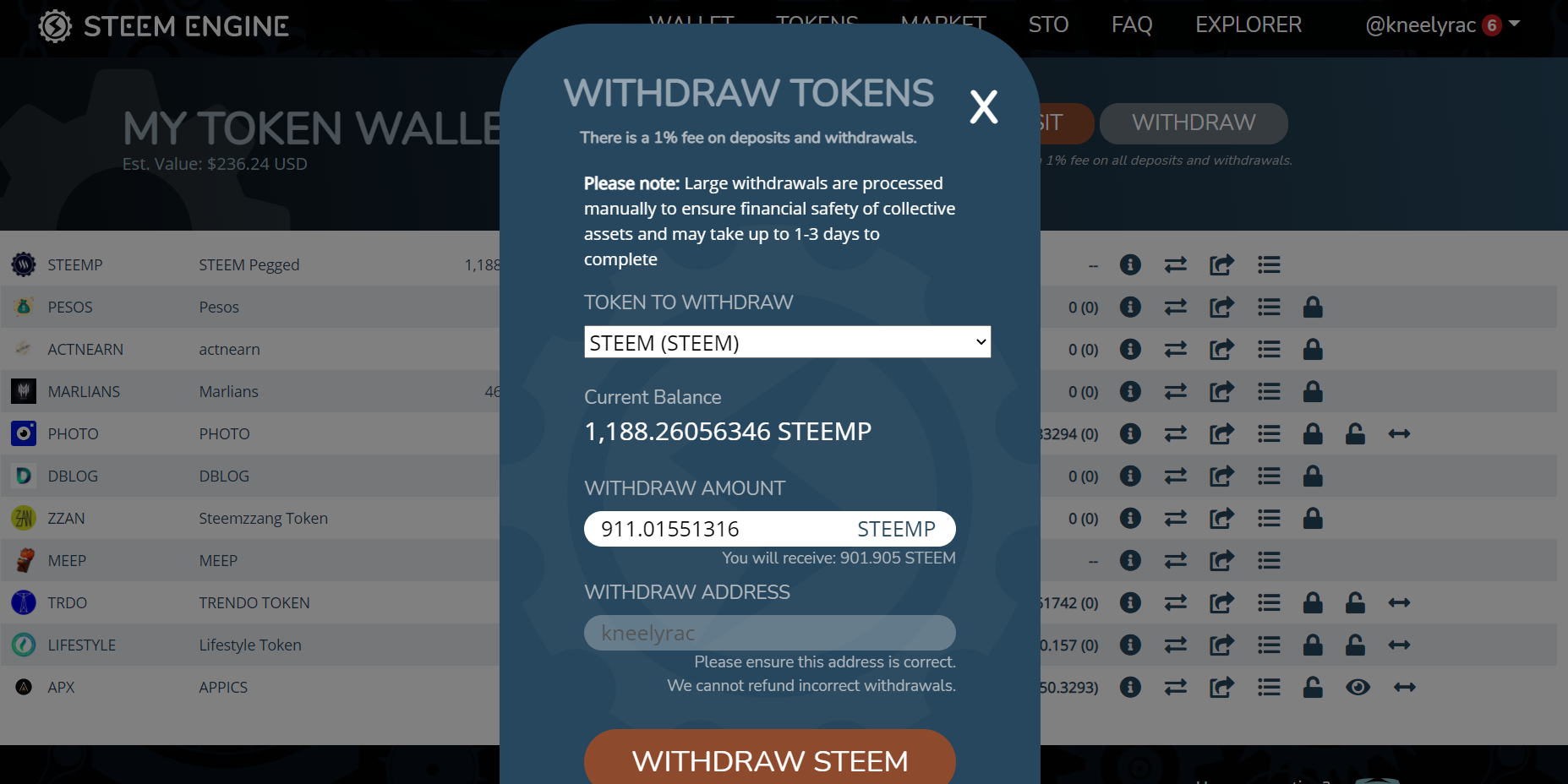 2 A pop-up window will appear and choose STEEM as the TOKEN TO WITHDRAW.