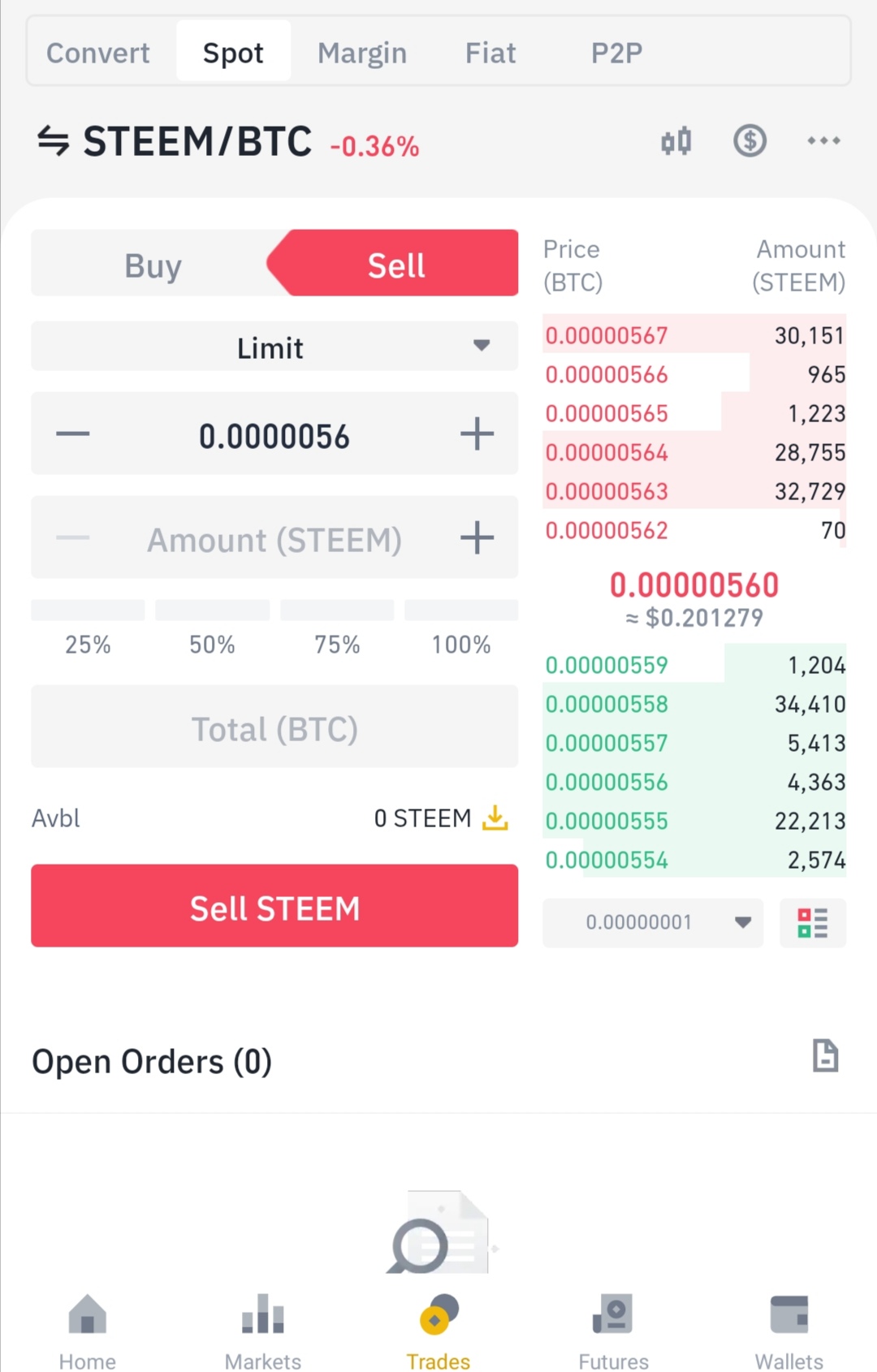3 Choose STEEM/BTC. You will then see Buy/Sell Tab and Price/Amount Table.