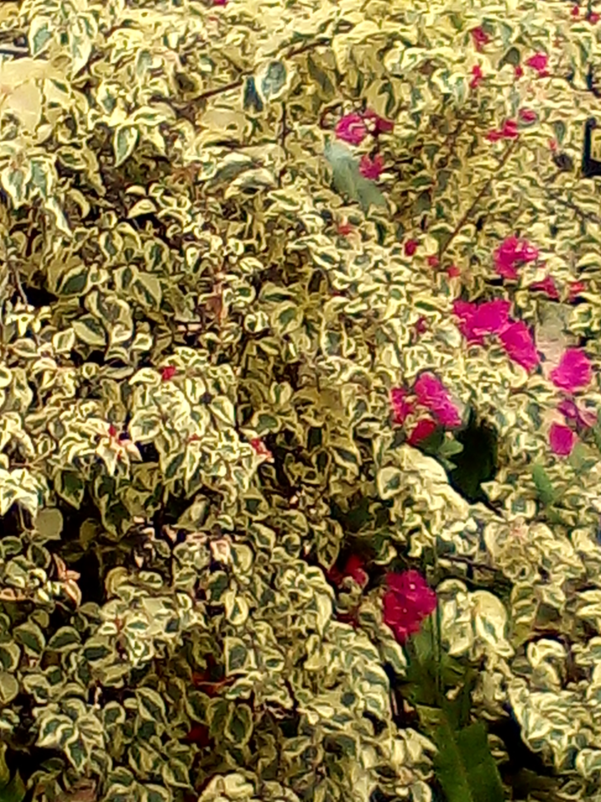 Sus hojas tienen forma elíptica puntiaguda y existen variedades de hojas y sus flores son muy variadas y abundantes y ocultan casi por completo sus hojas, aquí en mi país venezuela existen diferentes colores de esta planta su floración ocurre casi todo el año debido nuestro clima y permanente sol, que la hace florecer exuberadame.