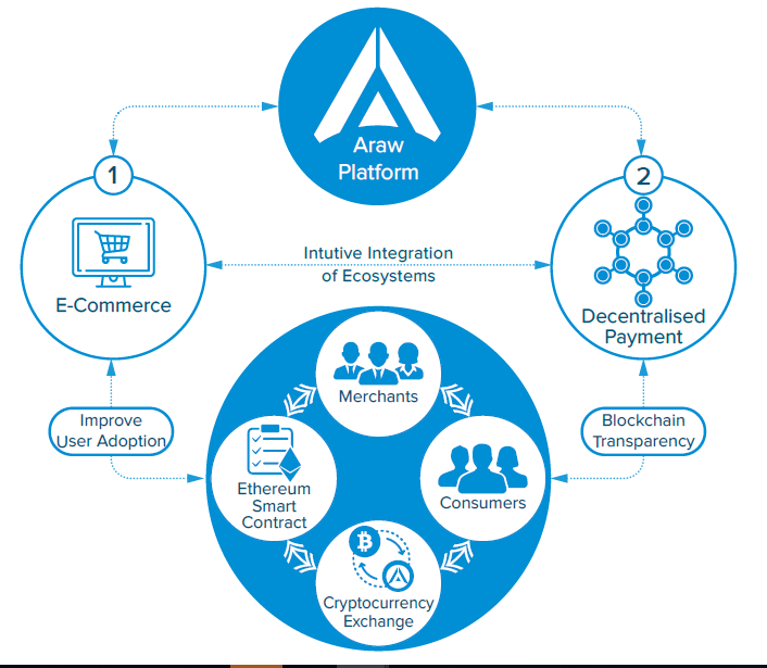 Semua transaksi di pasar e-commerce dapat dilakukan menggunakan token ARAW, yang harus diteruskan ke atau disimpan dalam dompet ERC20 yang kompatibel. Kartu ARAW bertindak sebagai transaksi yang sah untuk bertransaksi di platform. Ini dapat digunakan untuk membayar barang atau melakukan pembayaran. Ini juga dapat digunakan untuk mengkonfirmasi bahwa kesepakatan tertentu telah selesai.