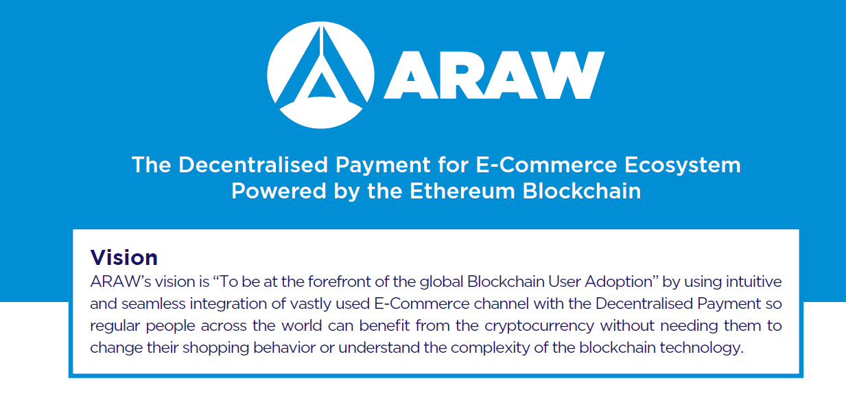 Dengan memperkenalkan kode ARAW, inti dari komunitas biologi terdesentralisasi dikendalikan oleh rantai Ethereum Blockchain, kami bermaksud meningkatkan pilihan blockchain untuk individu normal di dunia. Kami adalah organisasi utama di Inggris yang misinya adalah untuk mengkonsolidasikan keuntungan dari bisnis e-commerce dan pembayaran; Memberikan jawaban end-to-end untuk Pasar E-commerce, Sentuhan E-Niaga dan Kartu Pembayaran, Pembayaran E Online, dan Sistem Klaim Bersatu Unifiedum Blockchain yang didukung oleh ARAW Token. Tujuan dari notasi ARAW adalah untuk menjadi bagian dari belanja online dan belanja di toko sehari-hari masyarakat.