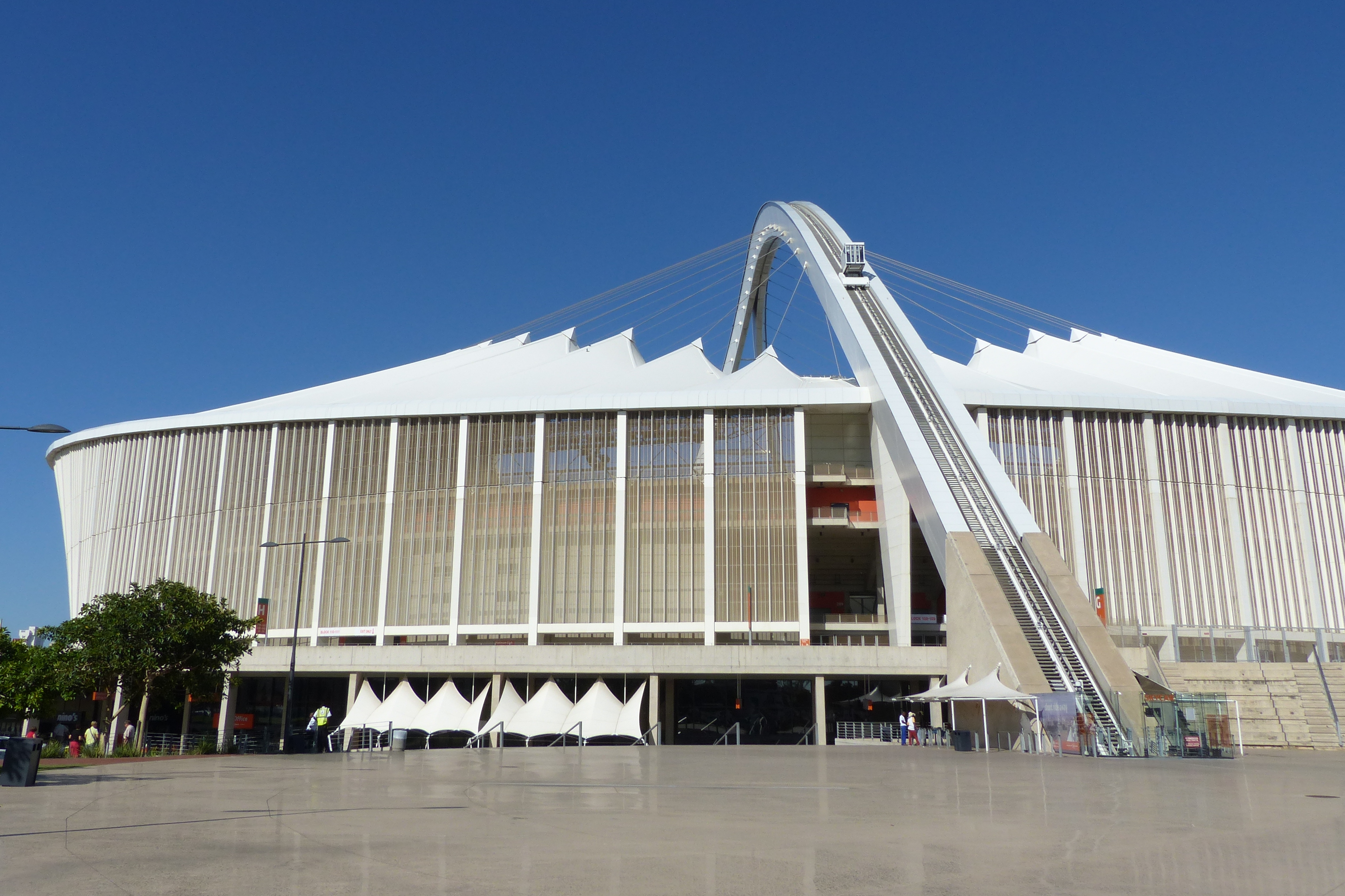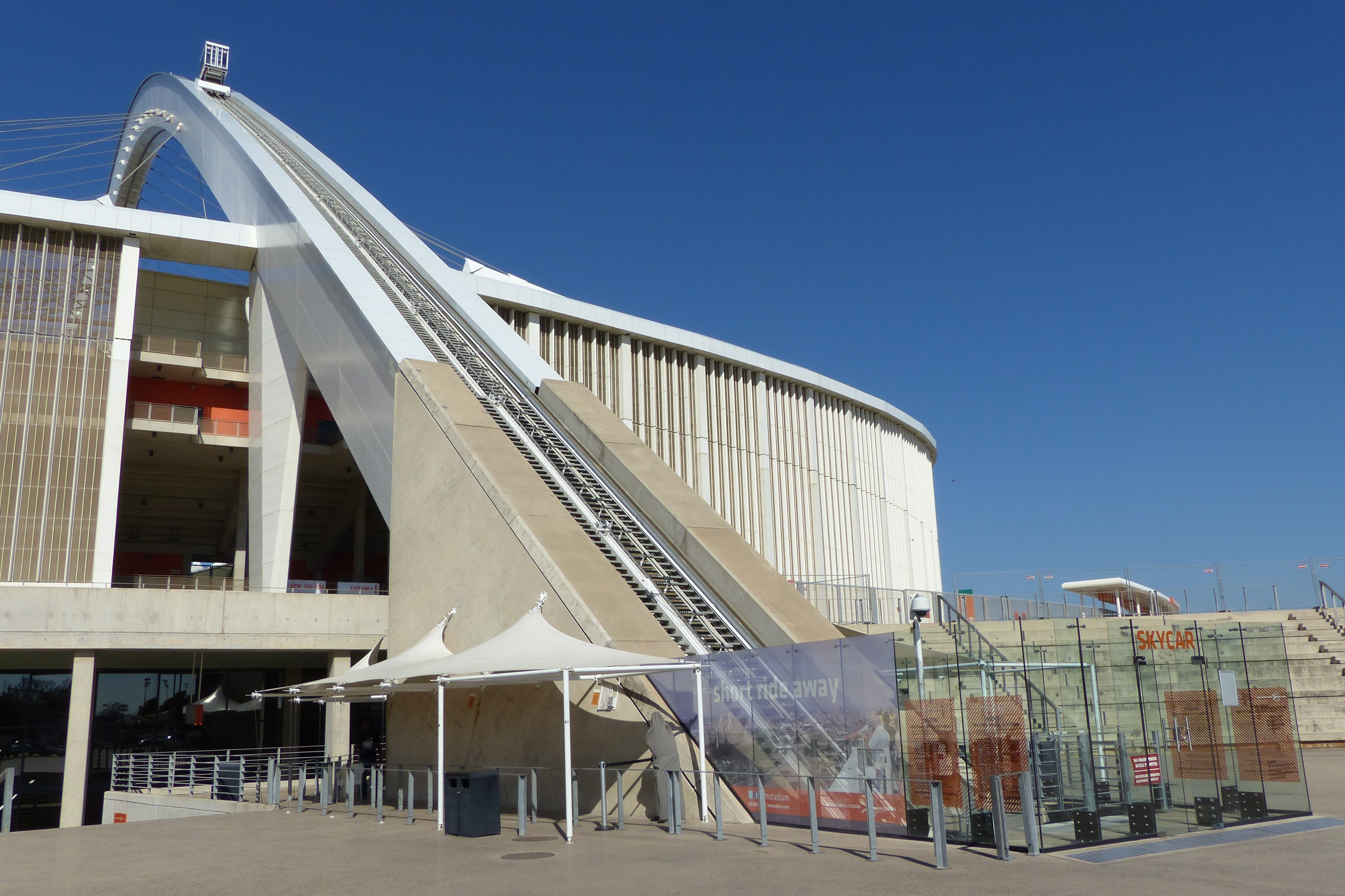 The Moses Mabhida Stadium is a football stadium in the South African city of Durban. The stadium had a total capacity of around 70,000 spectators, making it the second largest of the five newly built football arenas of the 2010 World Cup in South Africa. After the 2010 World Cup, the capacity was reduced to 56,000 spectators. The stadium is one of three stadiums designed by the Hamburg architects Gerkan, Marg and Partner (gmp) for the 2010 FIFA World Cup. The stadium, jokingly called "carnivorous flower", is now considered the landmark of Durban. With attractions already planned during construction, such as bungee jumping and the "Skycar", a train that runs to an observation platform on the carrier, attempts are made to dampen the annual loss of millions after the World Cup.