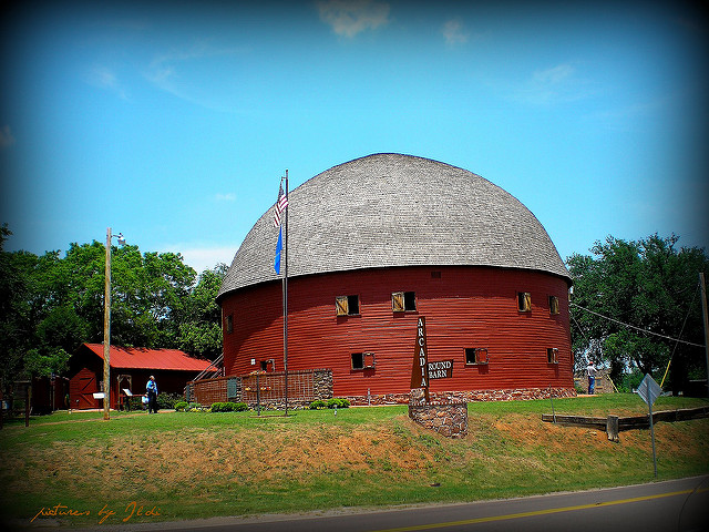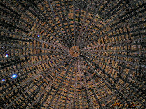 Located on Route 66 in the heart of Arcadia,OK. The Round Barn is one of our nation's unique landmarks. Built in 1898, it originally served of course, as a home for livestock and also as a place where dances were held for the local townspeople. We visited this place Memorial Day, the lower level is full of memorabilia and gifts, the upstairs is just one big open round room which is used for parties and weddings. The next picture is the ceiling, which looks like a big basket. A pretty cool place.