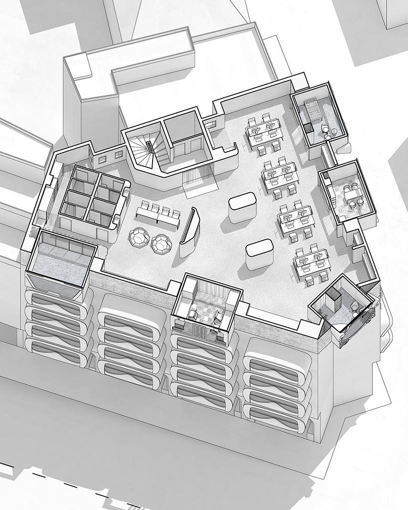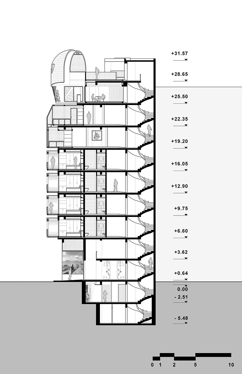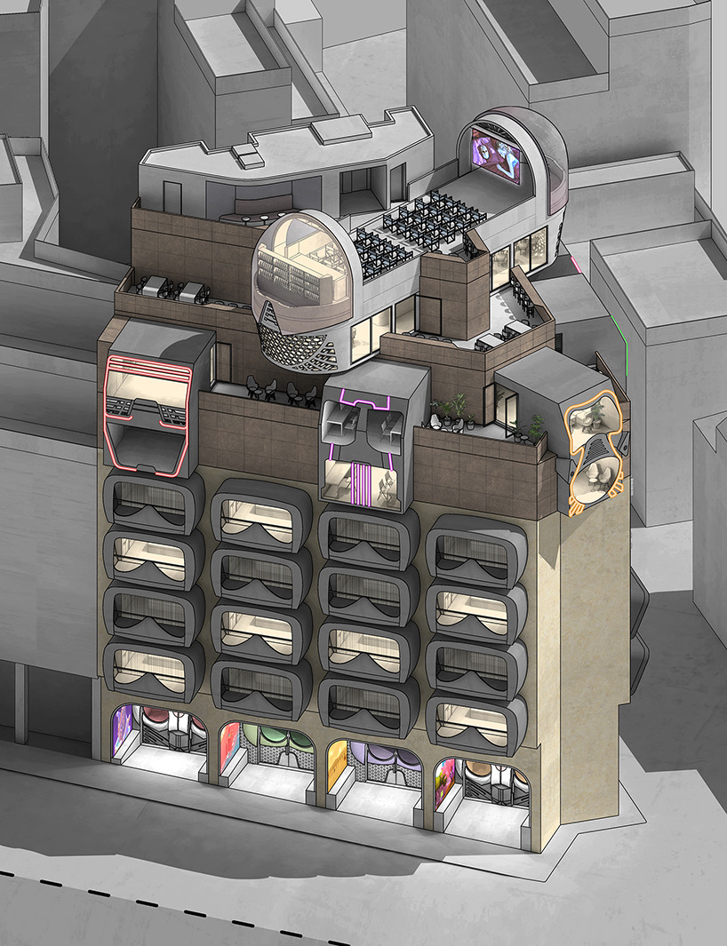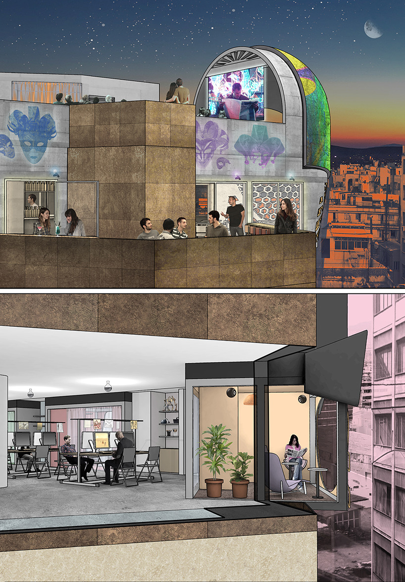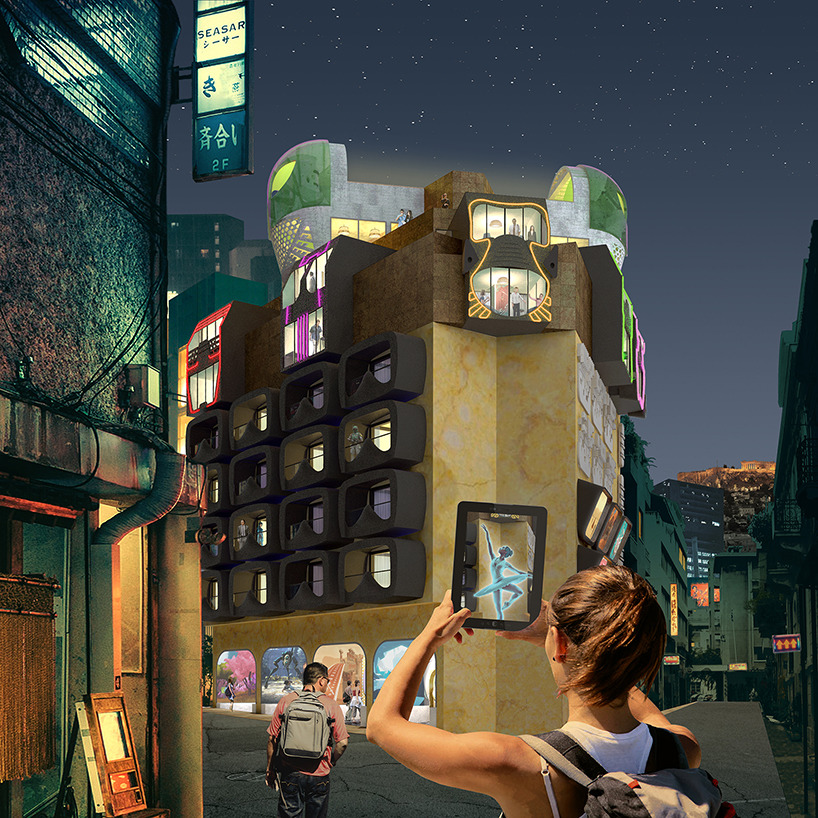 stathis stylidis가 제안한 이 건물은 "특정한 목적을 가진 호텔"이라고 할수있겠다. 그리고 그 특정한 목적은 당연히 "증강현실"이다. 이 호텔은 증강현실을 경험하고 싶은 방문객은 물론 연구자들을 위한 다양한 시설도 동시에 제공한다. 이 새로운 공간 안에는 연구 및 창조 활동을 위해 적절하게 준비된 워크샵 공간이 있으며 호텔은 새로운 기술을 탐구하고 설계하는 데 필요한 장비를 제공하는 대여실도 구비되어있다. 전시 공간, 작은 식사 공간 / 바 및 야외 영화관도 포함되어 있다