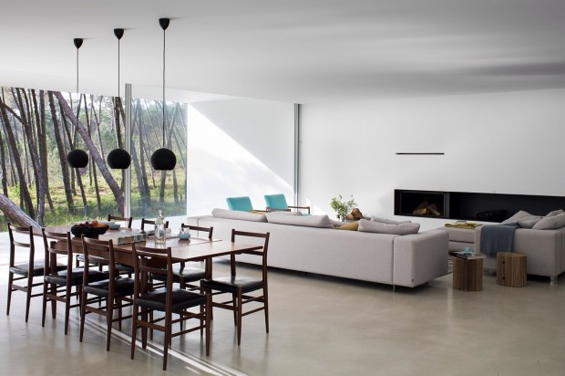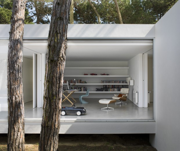 The architects opted for a single volume with two distinct faces: one more closed and another more exuberant and exposed. The entrance is marked by a ramp that gently transports its owners inside the house, merging unexpectedly with the outside. All spaces in the house have independent access with the outside. Thus, all the different environments establish a strong relationship with the pine forest, the patio is born of this desire and serves as a hinge between social space and private space. The few materials of the house create a unique atmosphere. The outer porch due to its elevation in relation to the ground appears suspended above the pine forest. The large glazed windows allow the entrance of the natural light during a big part of the day and thus the heating of the space. Minimizing the effects on the natural landscape of the site, the pine forest was left as it was before construction.