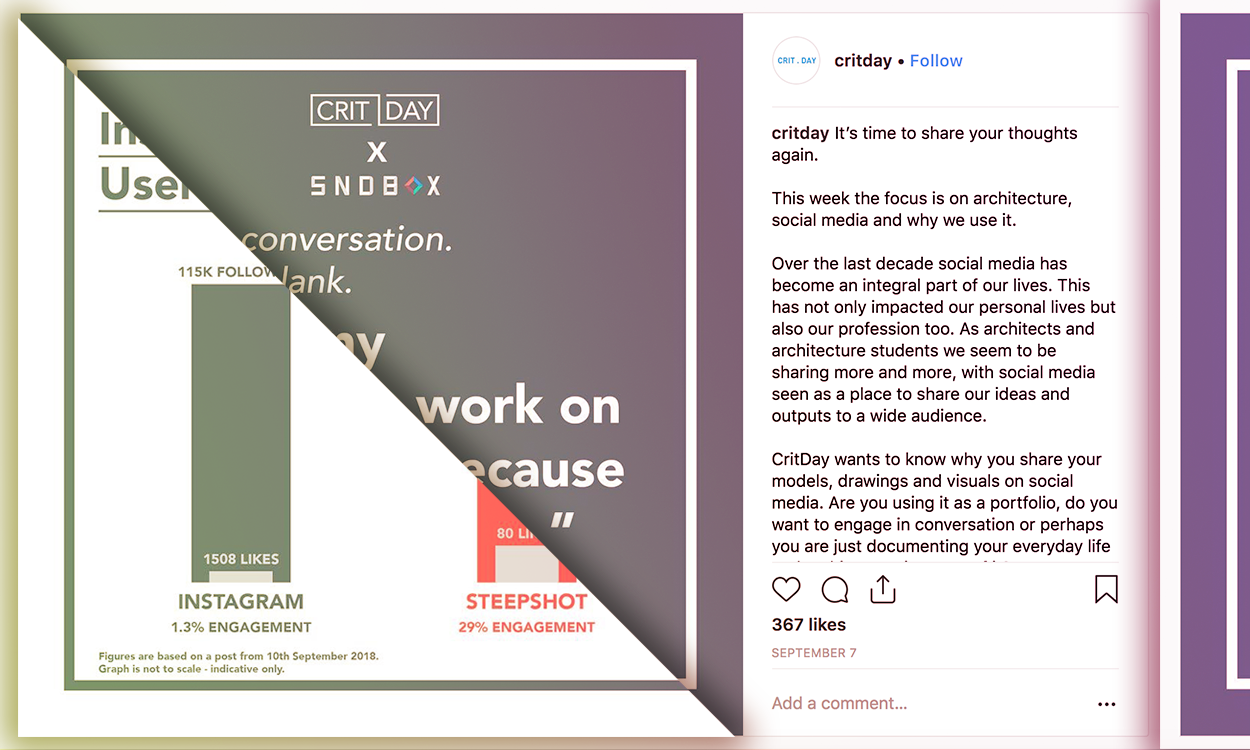 Over this time, Instagram has become saturated with similar accounts, to the point where there must be 100s, if not 1000s of these accounts. By no means was CritDay the first, however, with such an abundance it has encouraged me to question what is the purpose (and relevance) of curation pages and social media on the whole. What do pages such as CritDay offer? Why do architecture students share work on social media?