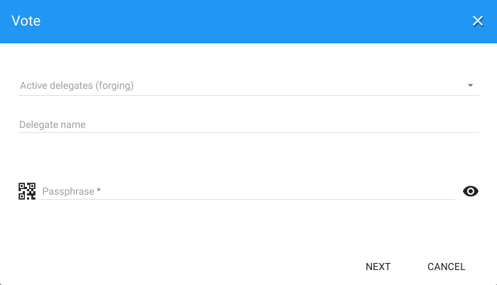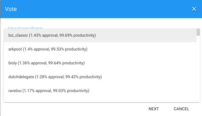 - Cliquez sur “Active delegates(forging)” et sélectionnez un délégué pour lequel vous souhaitez voter et le deuxième champ sera rempli avec son nom.