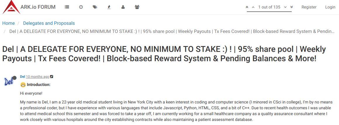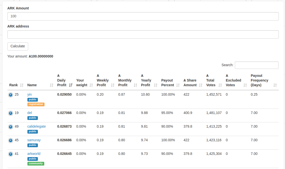 Entrez votre adresse ou une quantité d’Ark. Et vous avez accès a un tableau de rentabilité où vous pouvez estimer combien vous gagneriez par jour / mois / an pour chaque délégué.