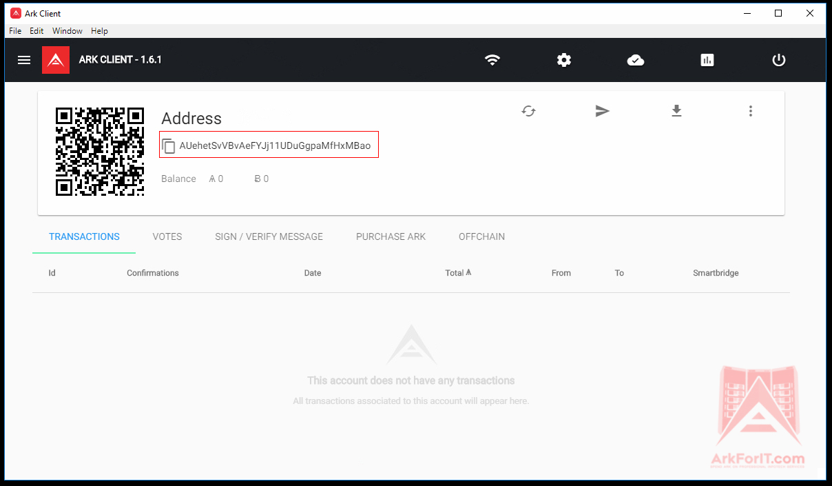 The red boxed section should contain your new ARK address. It is where you send your ARK to from an Exchange or another user. You can also head over to the PURCHASE ARK section inside the wallet and buy them from within.