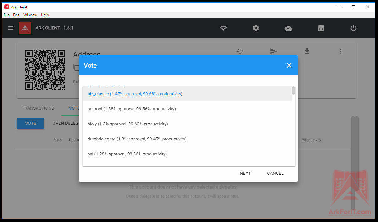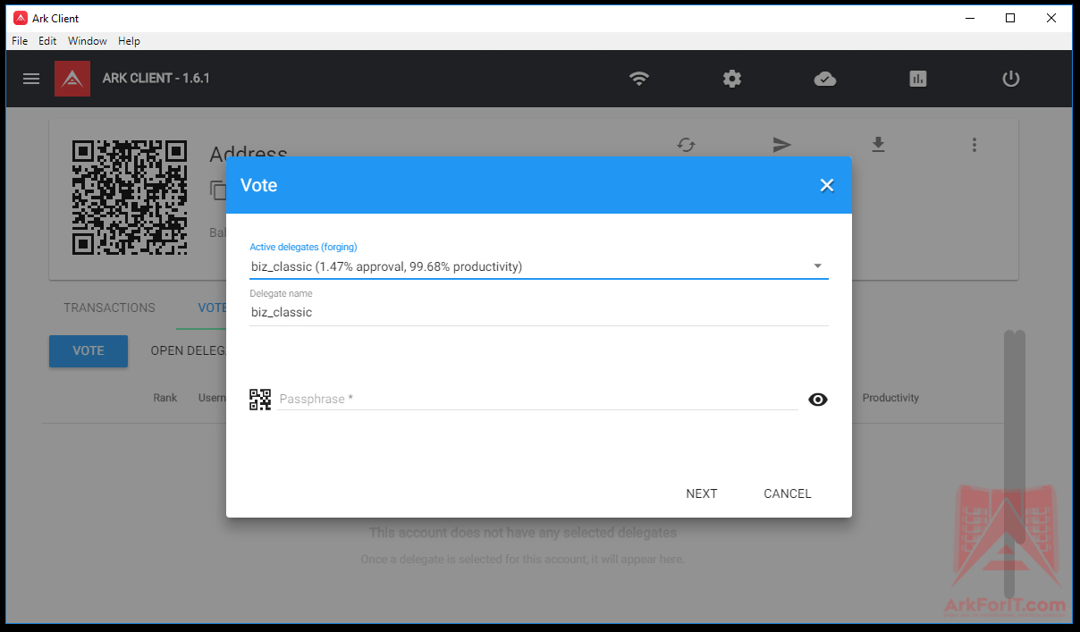 Once you click on a delegate from the drop down. It will populate the name and now you just enter your passphrase and click NEXT. The wallet will tell you that it will deduct 1 ARK to cast your vote. After you confirm the deduction, you are now voted for a delegate and staking ARK. Reward payouts will be based on the delegate you voted for, the amount of ARK you have and overall network.