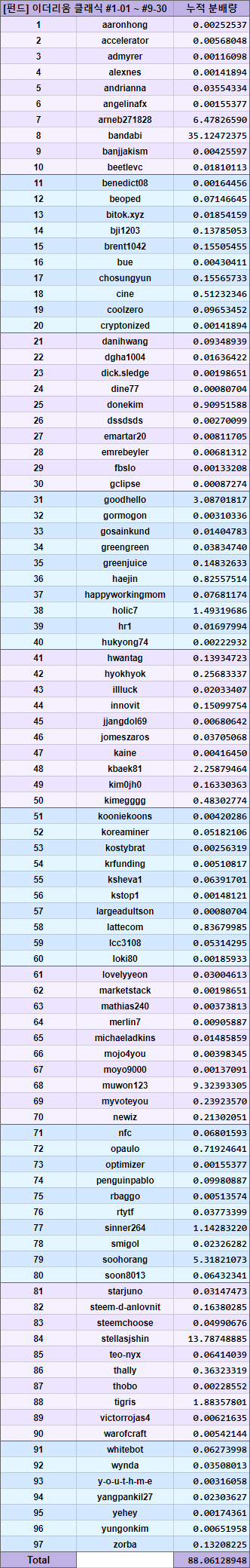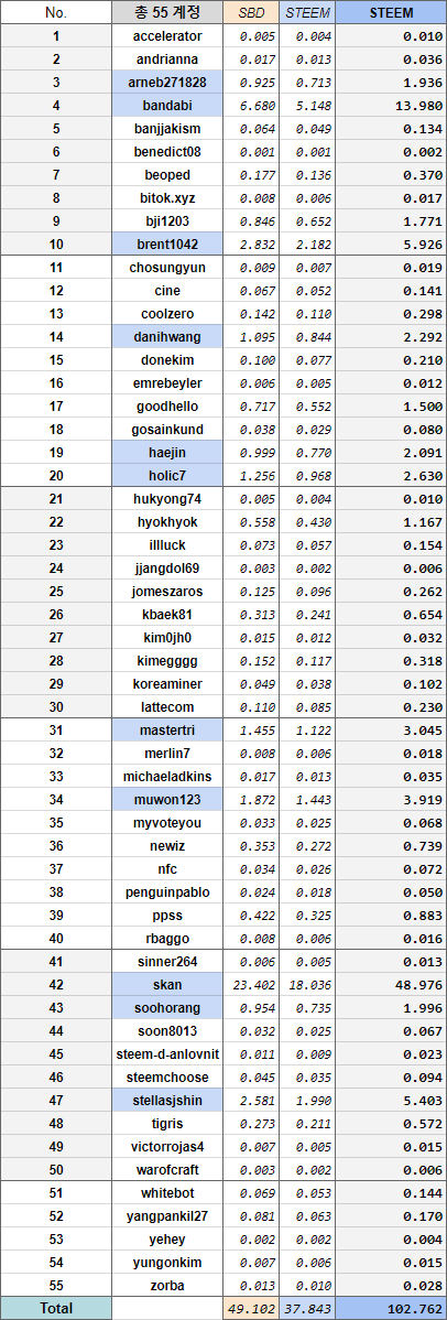 위와 마찬가지로, 맨 우측의 굵은 숫자로 표시한 STEEM 수량을 마지막 분배 기한 이내에 전송해드립니다.