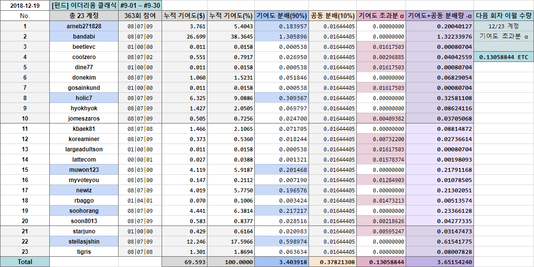 지난 회차 이월 수량 0.32356094 ETC 를 포함하여 총 3.78213084 ETC 중 참여한 23계정에게 3.65154240 ETC를 분배하고, 공동 분배 분량 중 기여도 초과분에 해당하는 0.13058844 ETC는 다음 정산 회차로 이월합니다.