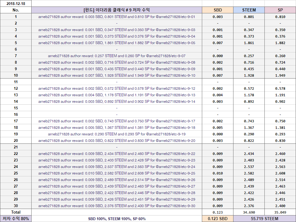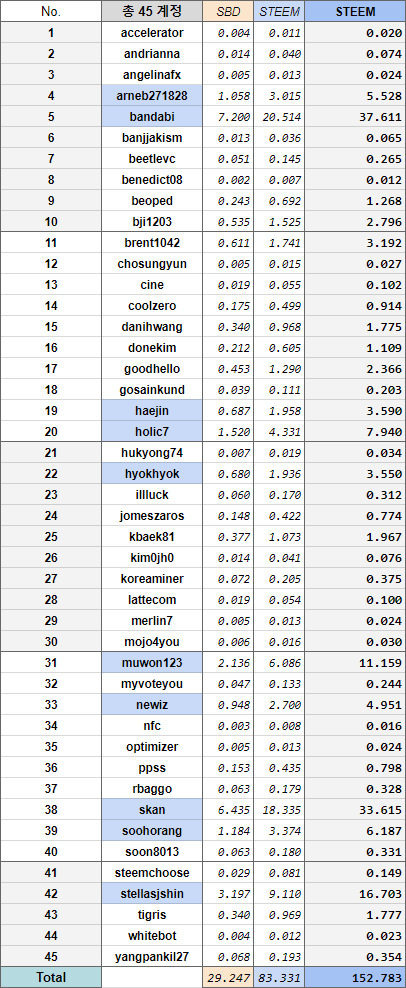 바로 위의 두 표에 기재한 STEEM 수량은 미리 알려드리는 차원에서 포함했습니다. 이번 분배 회차에서 바로 전송해드리지는 않습니다.