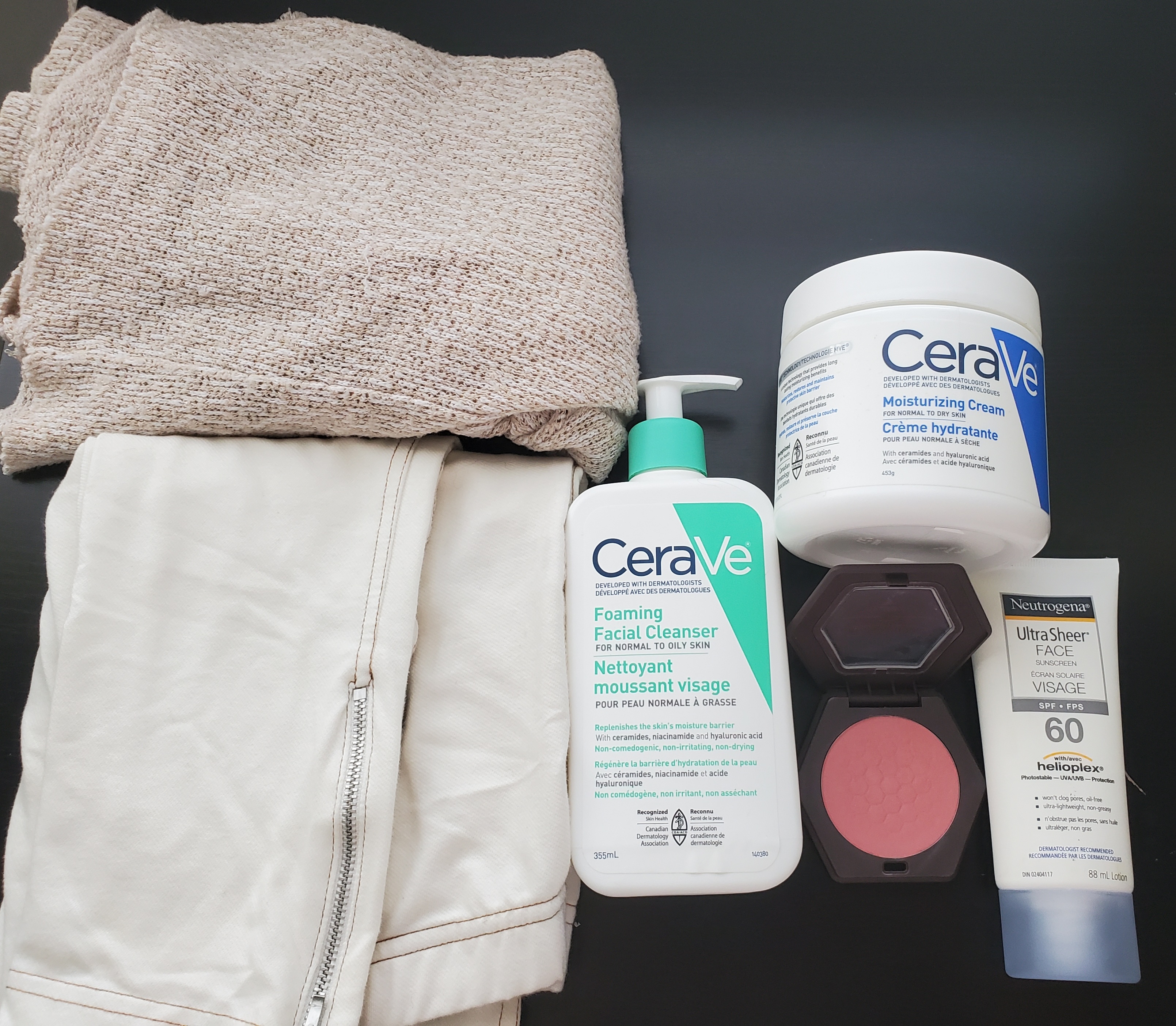 I first started out with a quick skincare routine with a face wash and a moisturizer and then wore my favorite white light pants and a cream colored light sweater to get ready for my walk. I put on some sunscreen and light blush to top the look.