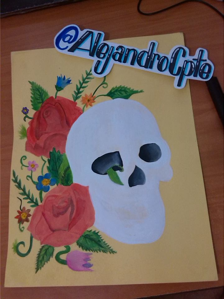 After having painted add some details with black marker and I added more plants and small flowers, also some cracks in the skull with black color to give them shadows, that is to say decorations to the drawing