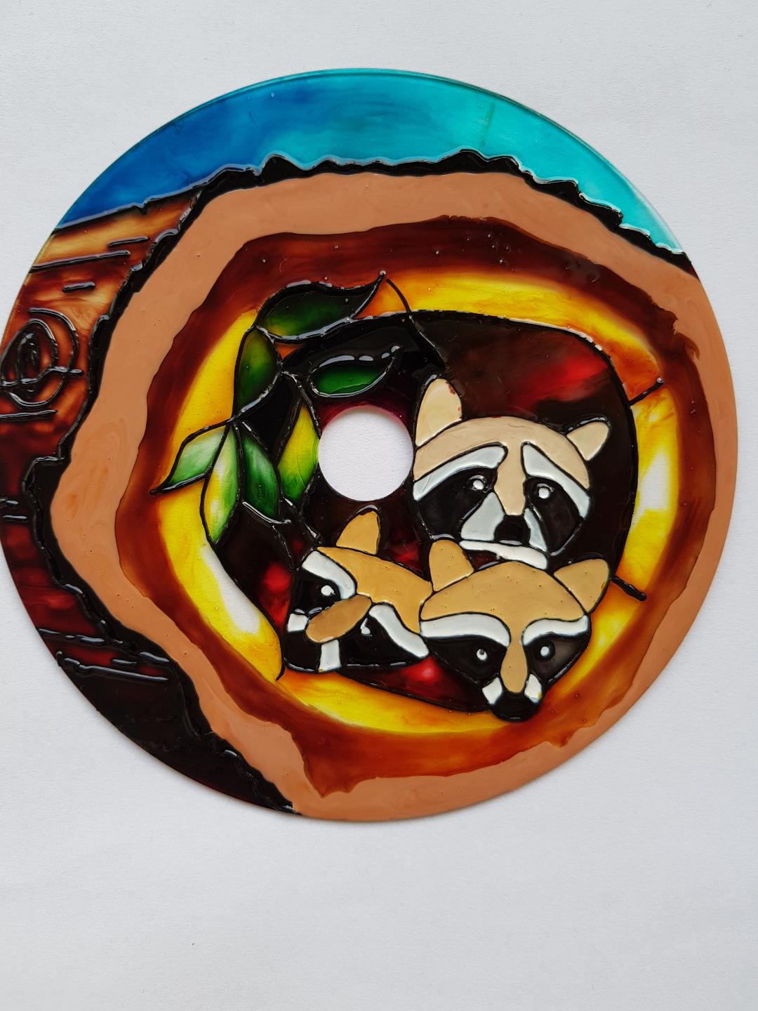 This piece was made with colors used for stained glass with cold drying process, and it was painted on CDs ( the classic ones we all used one day for movies, projects etc).