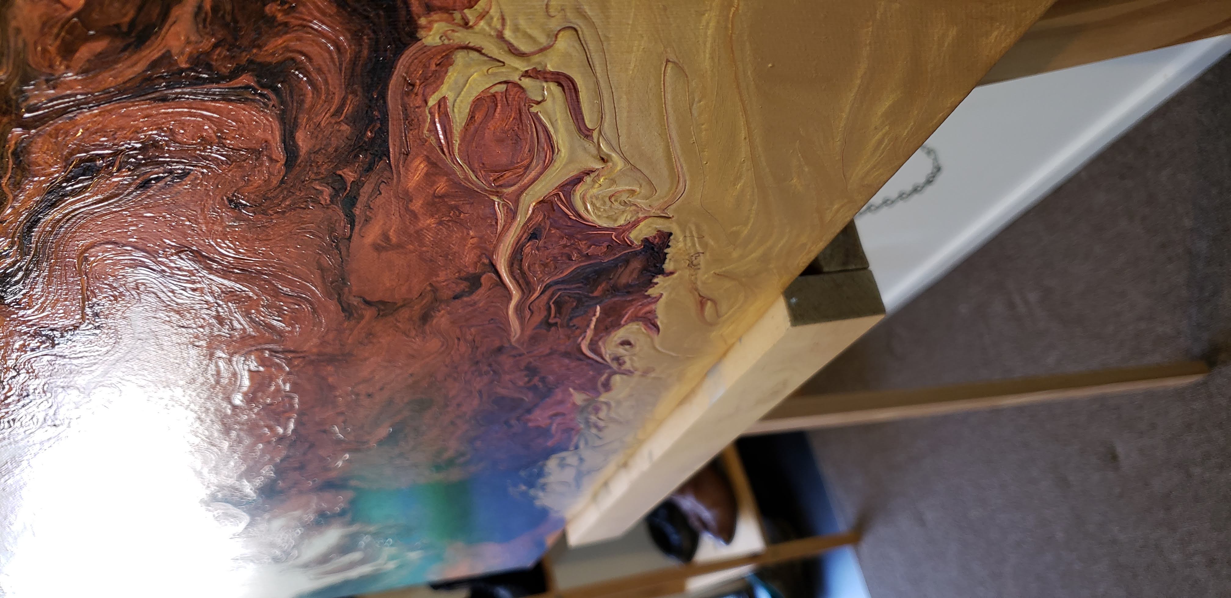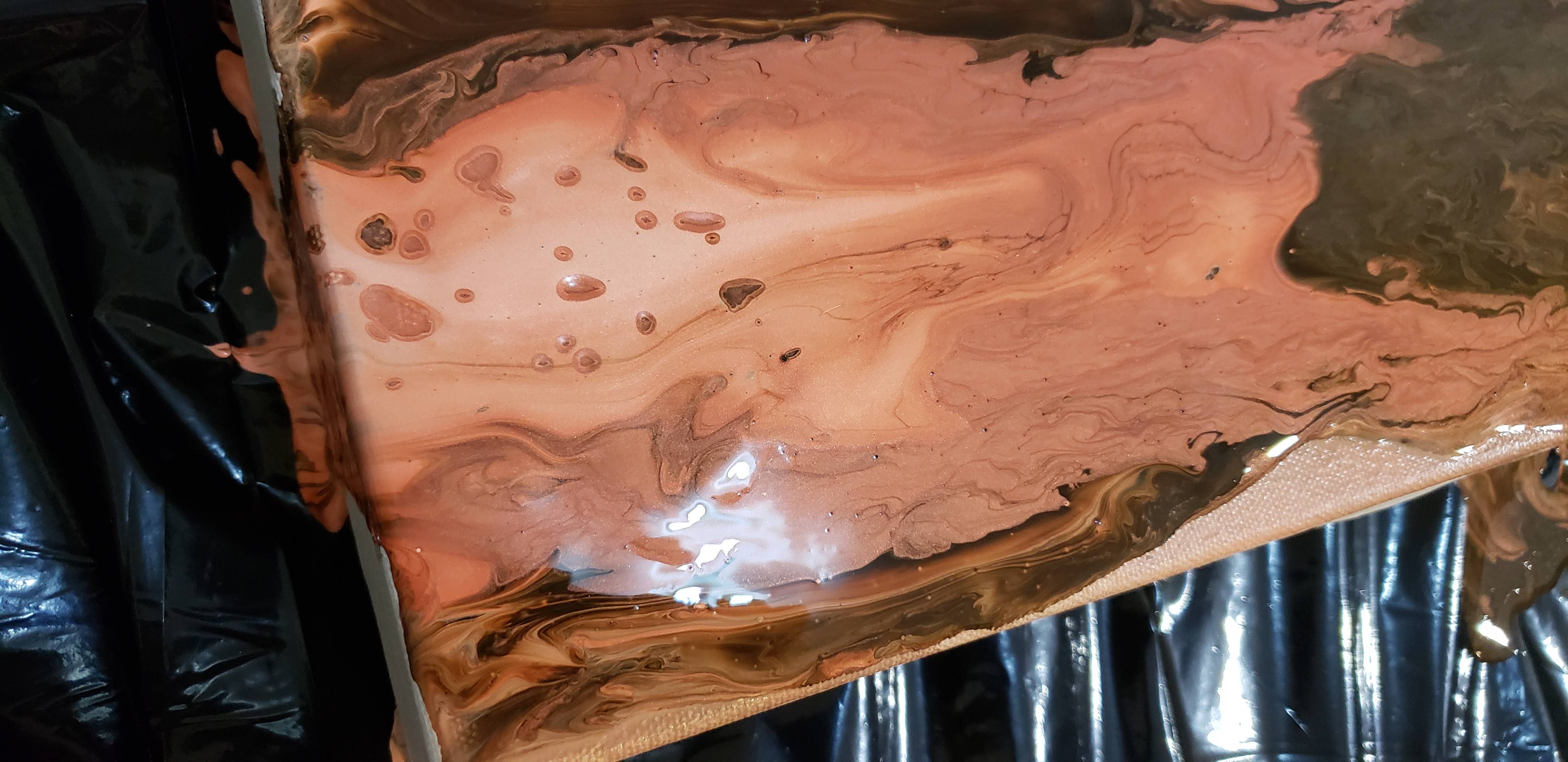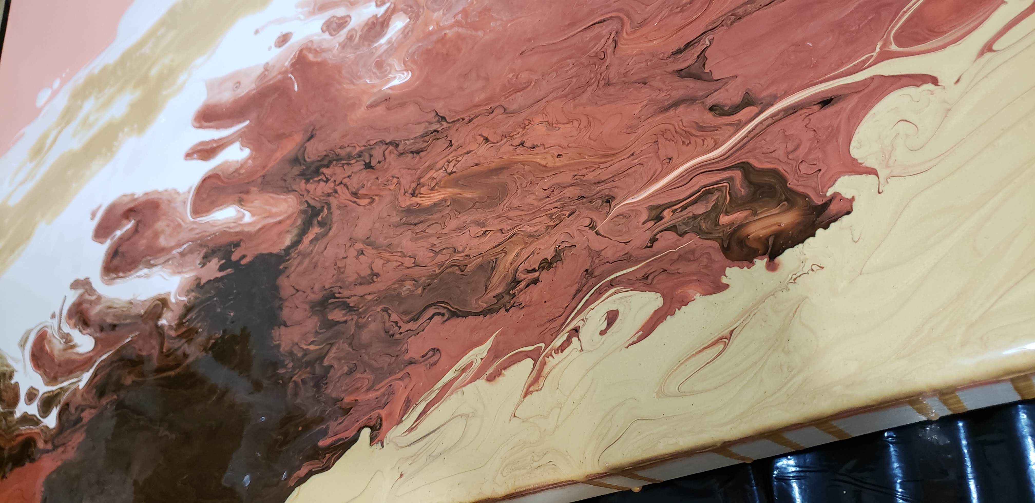 준비해놓은 물감을 한테 나누어서 붓고 캔버스 위에 뿌려서 작품을 완성합니다. 예쁜 마블형성을 위해 가급적 손을 대지않고 천천히 캔버스를 기울여서 물감을 퍼지게 하는것이 좋습니다. 갈 색갈의 경계는 나무막대로 적절히 분배해줍니다.