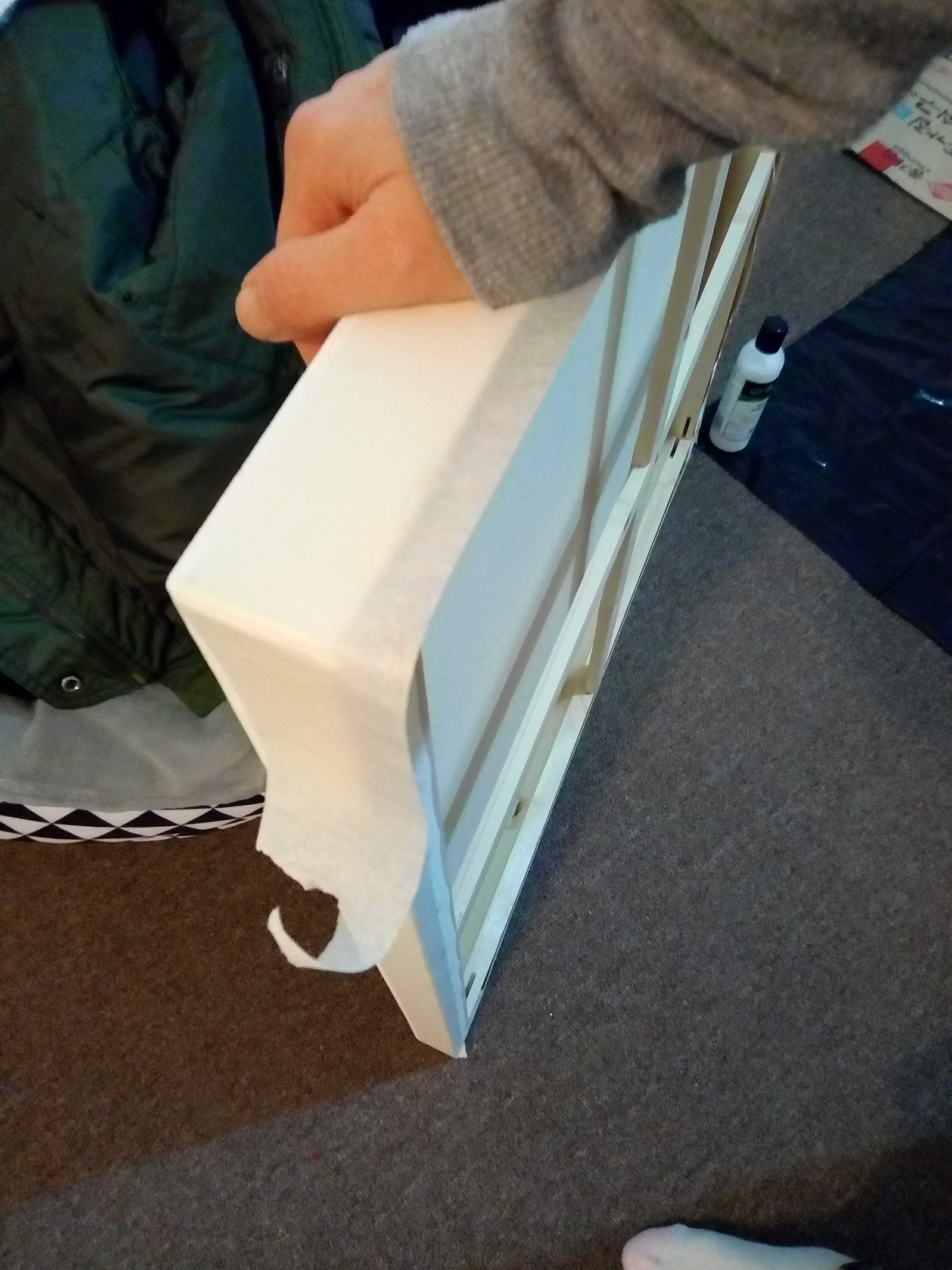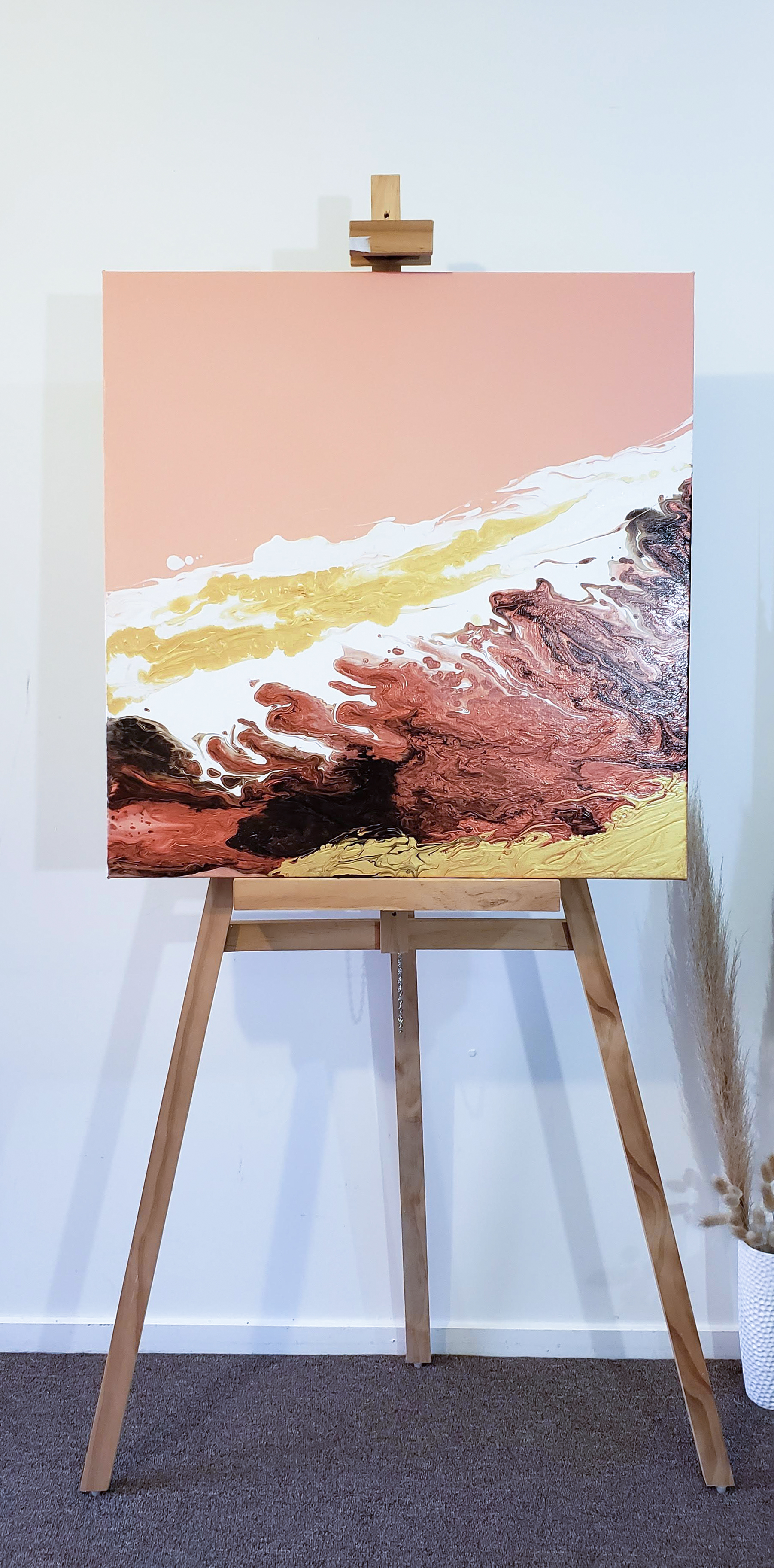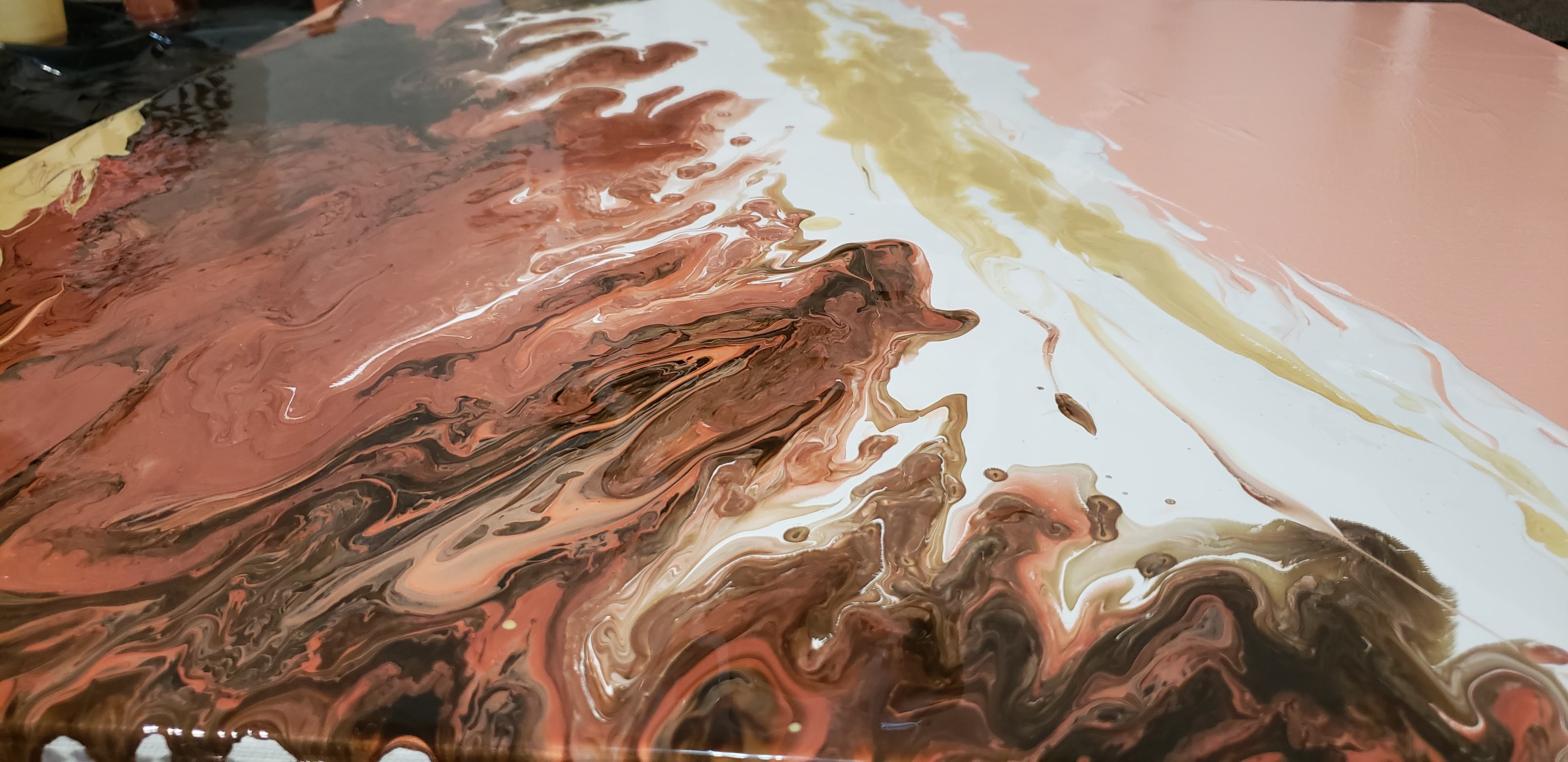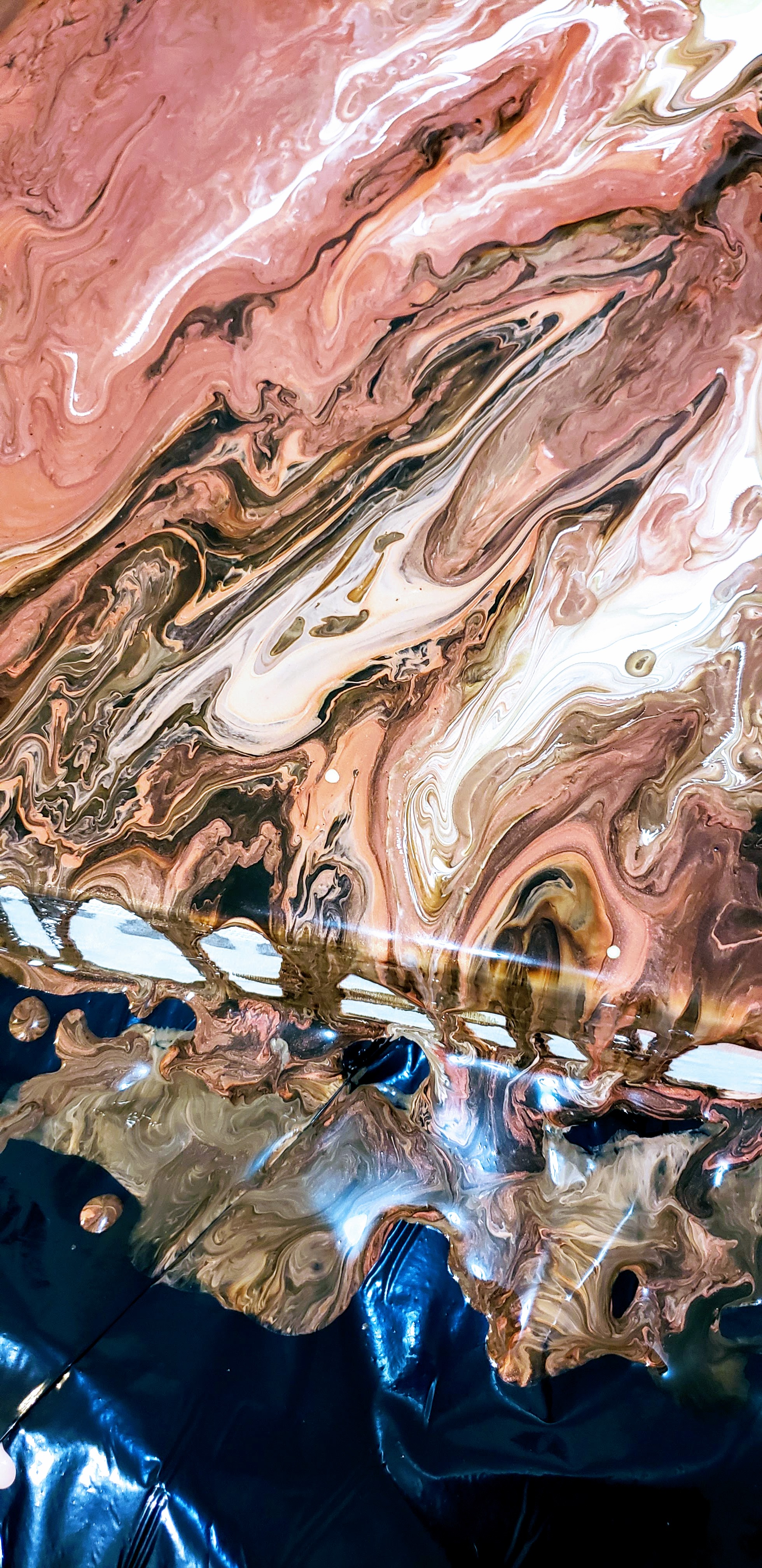 준비해놓은 물감을 한테 나누어서 붓고 캔버스 위에 뿌려서 작품을 완성합니다. 예쁜 마블형성을 위해 가급적 손을 대지않고 천천히 캔버스를 기울여서 물감을 퍼지게 하는것이 좋습니다. 갈 색갈의 경계는 나무막대로 적절히 분배해줍니다.