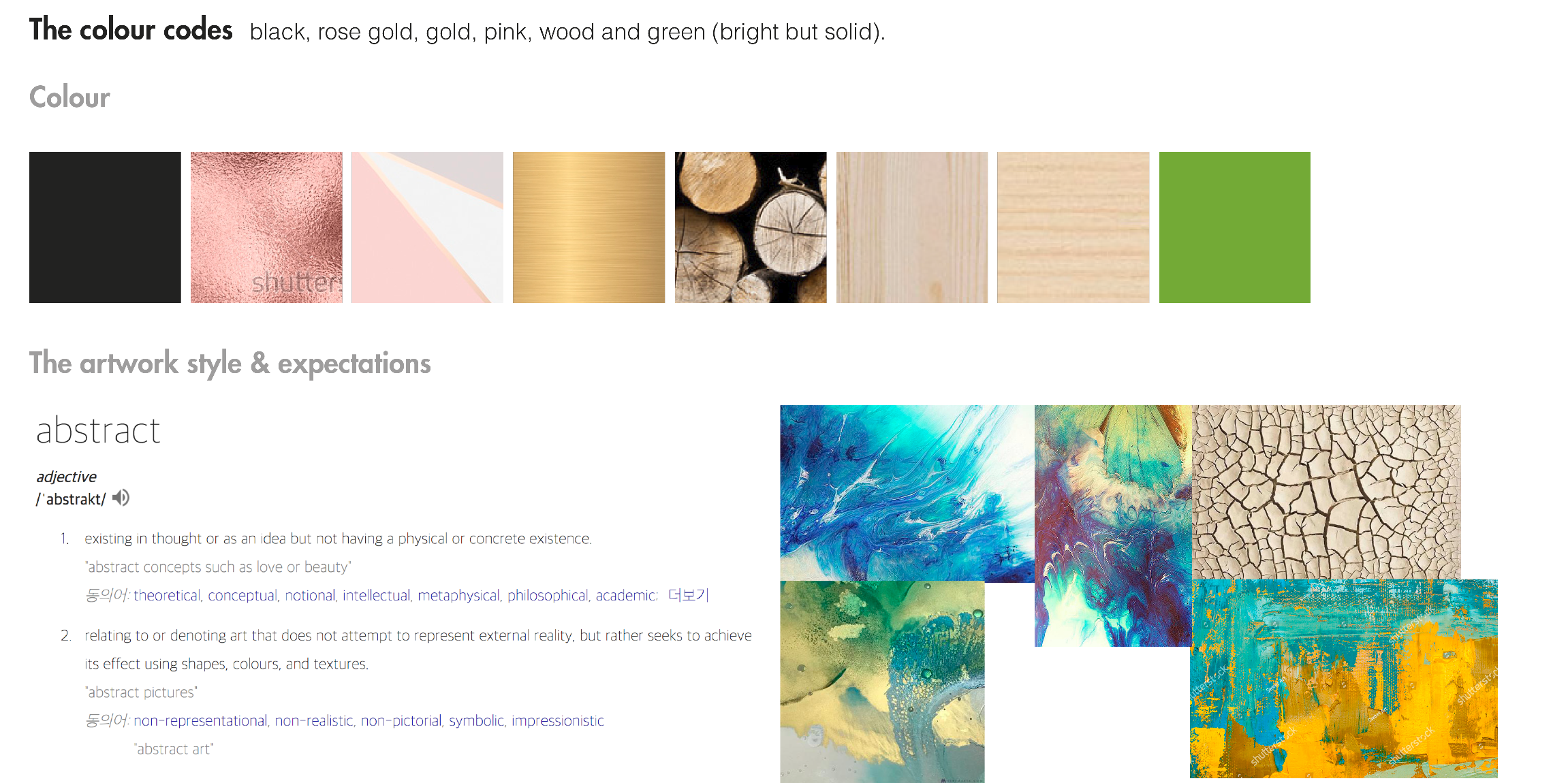 최종 스타일과 컬러에 맞는 자료만 검색해서 무드보드를 꾸며봅니다. 대부분 의뢰주는 자기가 무엇을 원하는지 모르고 뭉뚱그려서 말하는 경우가 많기 때문에 몇가지의 키워드와 단서로 이렇게 디테일한 비쥬얼로 무엇을 그릴것인지 보여줍니다.