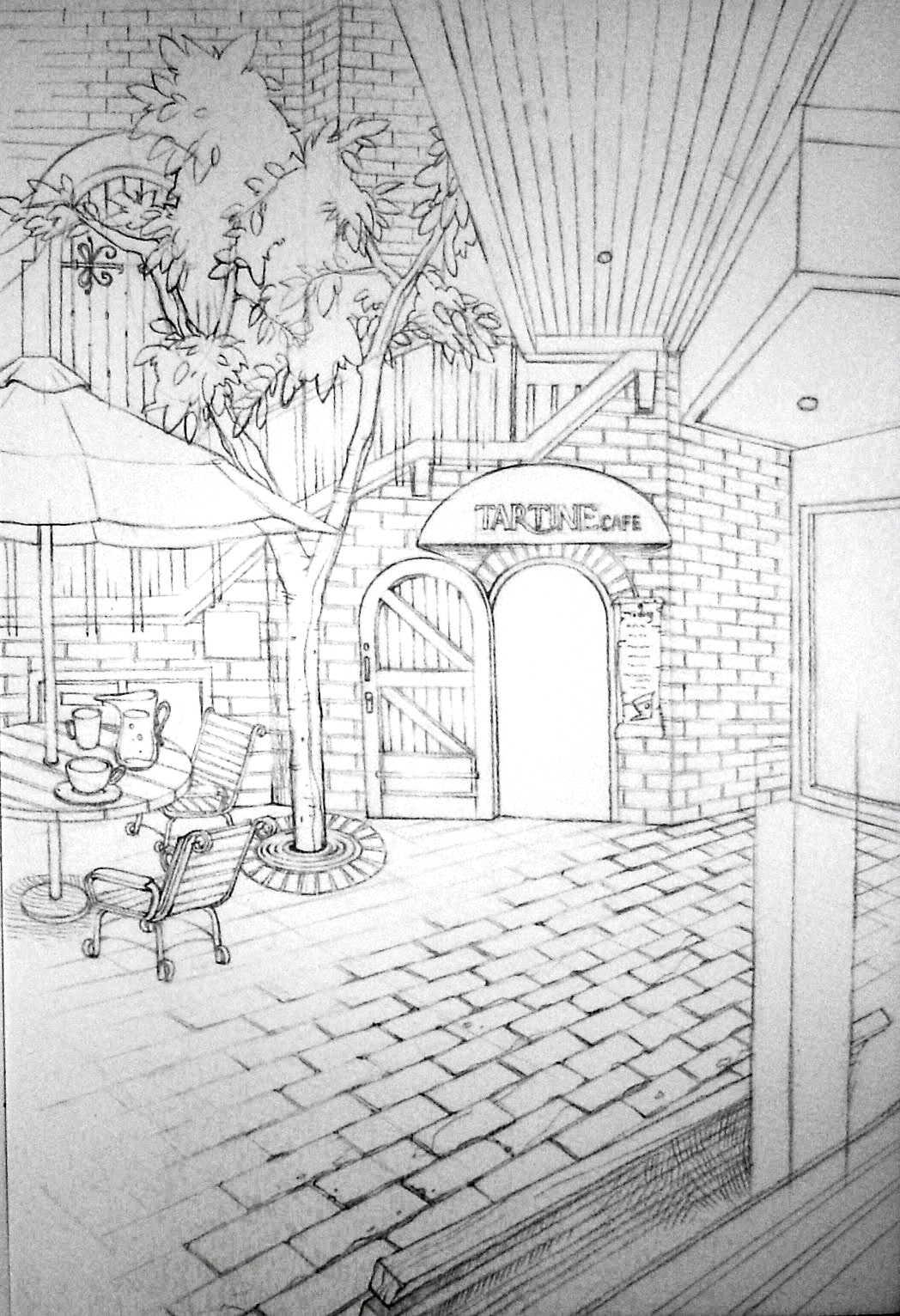 First sketch. The client requested a couple of changing things. He wanted to change the angle of the view and make the cafe's entry bigger.