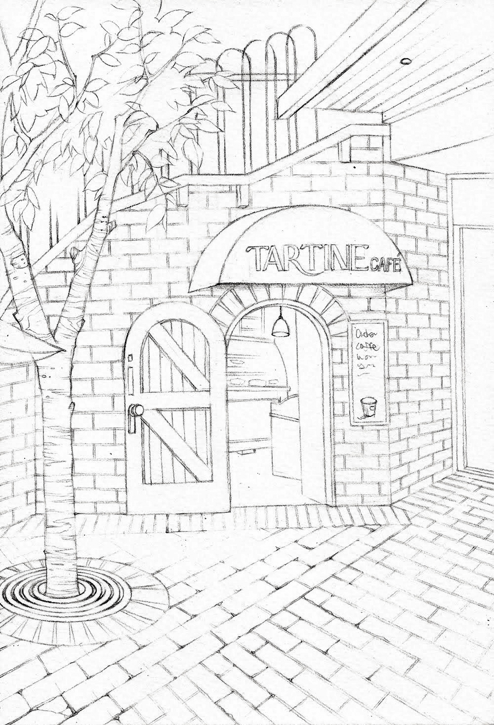 The second sketch. As the client requested, the entrance and cafe's name is bigger, and the angle is from the left side.