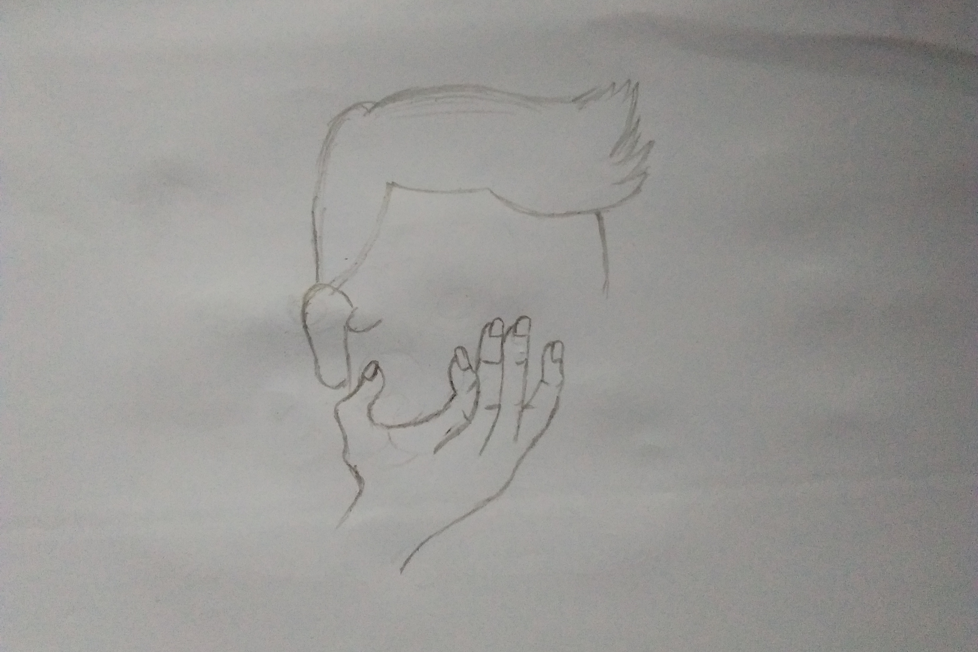Next draw the left hand, and position it right in front of the left face and left hand as if holding the camera from the top.
