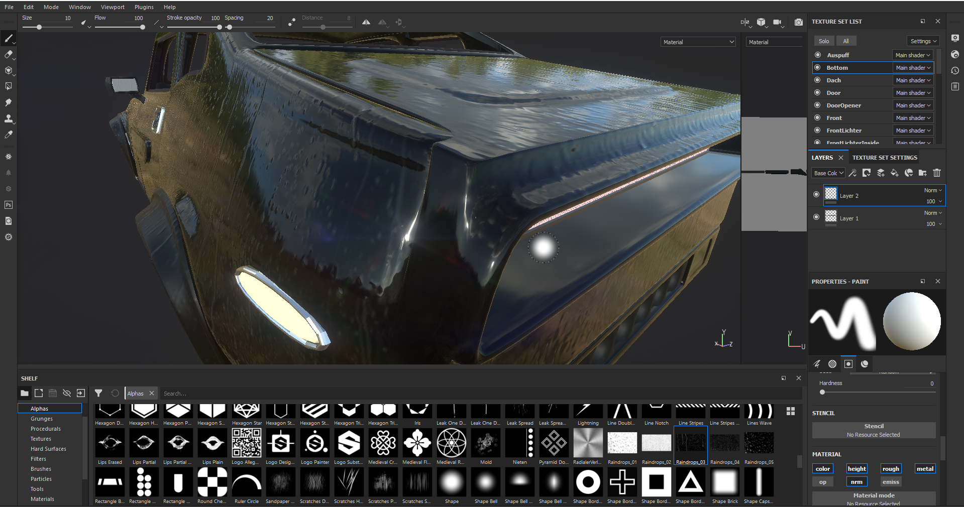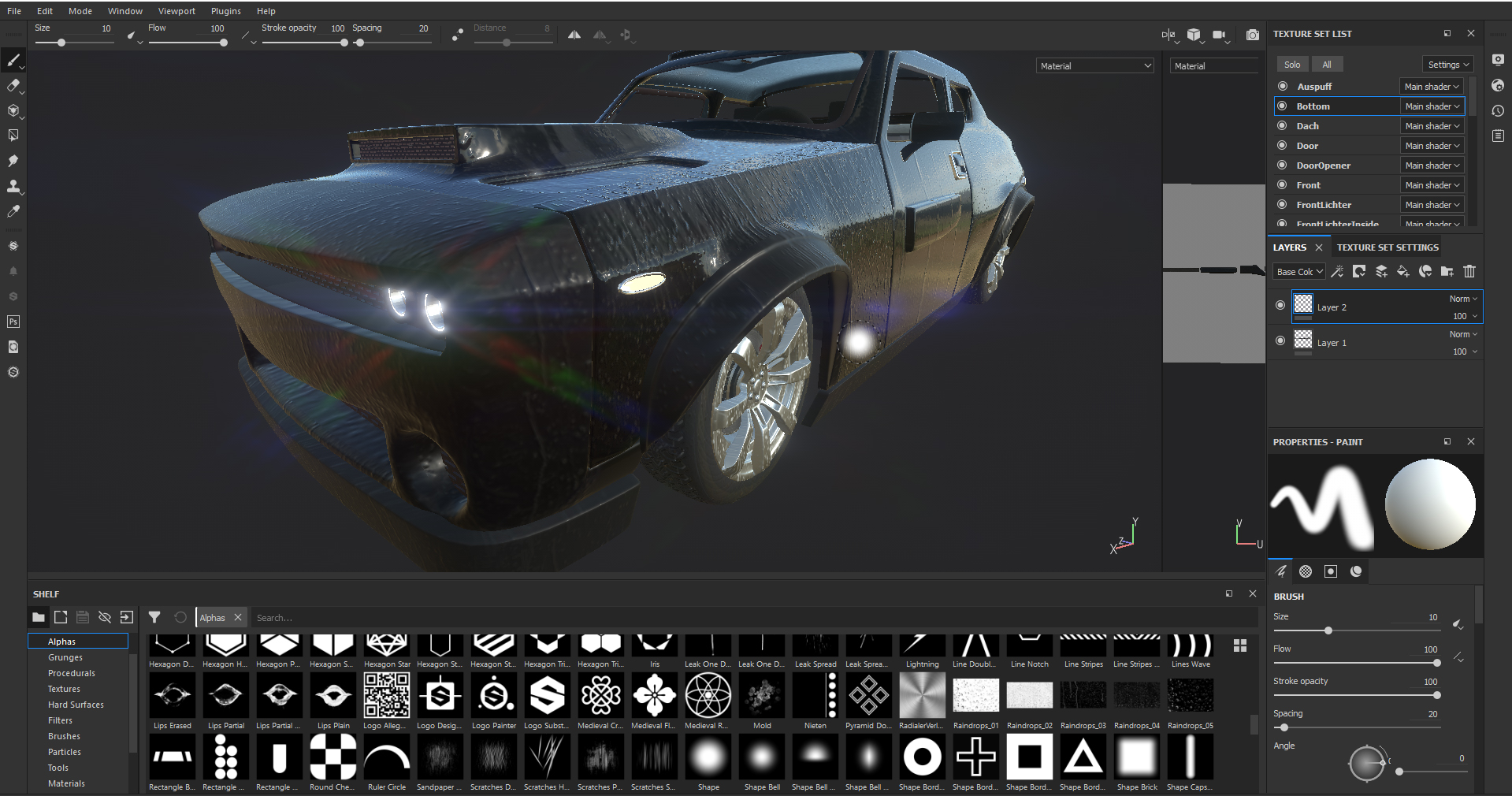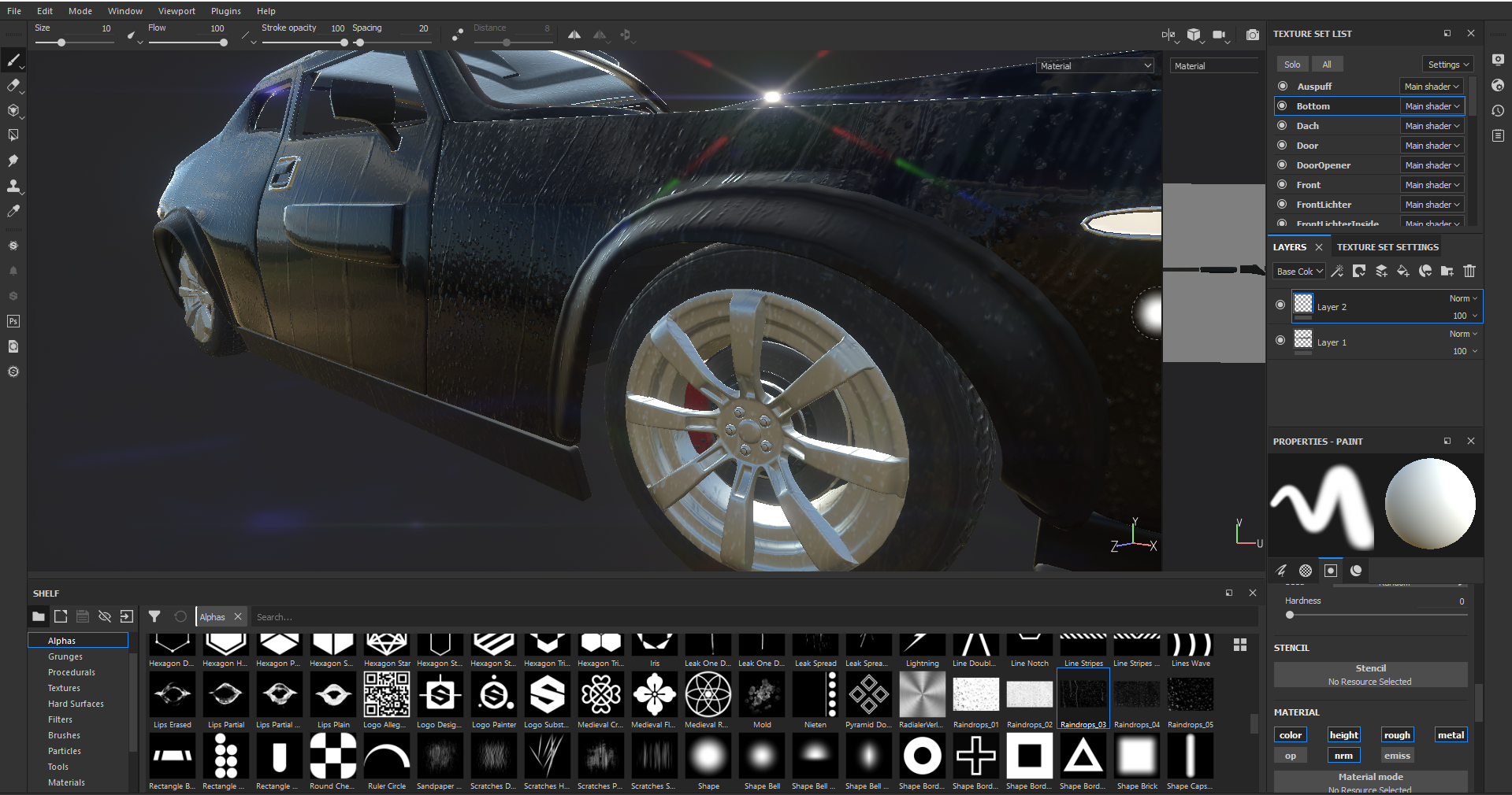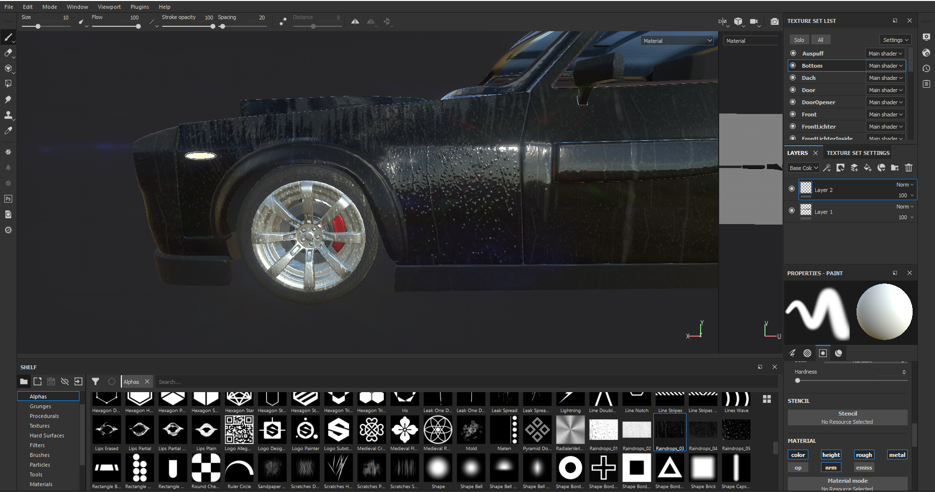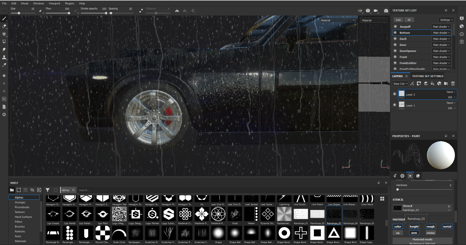 Today I made some cool rain effects. I used alpha textures, which I made in Photoshop. With these I made water drops on the surface of the car. My next step is to model some simple geometries and use alphas for raindrops!