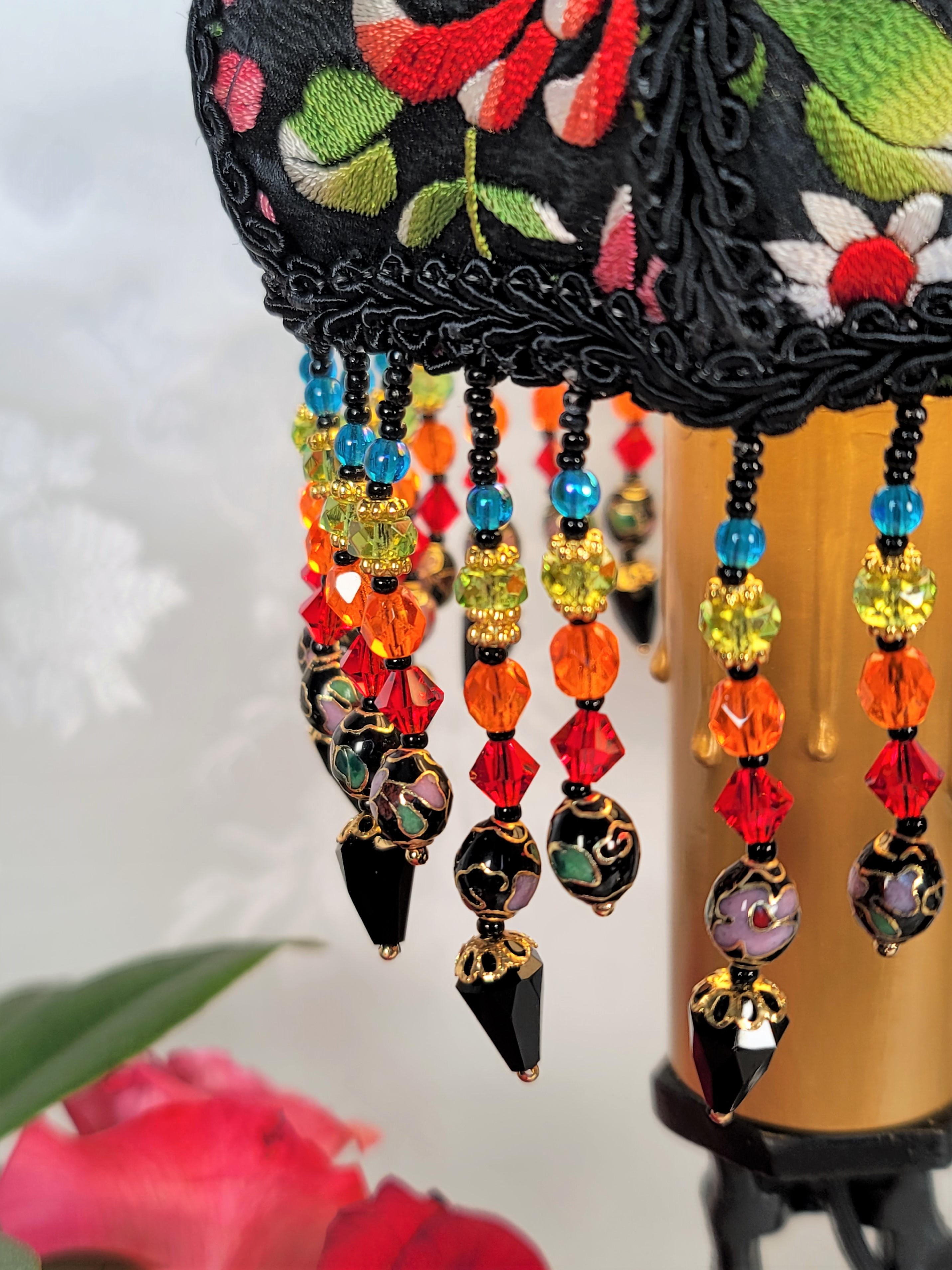 A stunning black antique silk embroidery surrounds the outside of the shades, and a bright white silk lining drives the light downward, where you need it. In doing so, the handstrung beads light up like a stained-glass window. The beadwork includes 1,216 handstrung pieces of Swarovski crystals, Czech glass, and vintage heavy cloisonné beads. The shades attach to a chandelier or torpedo shaped bulb with built in clips.