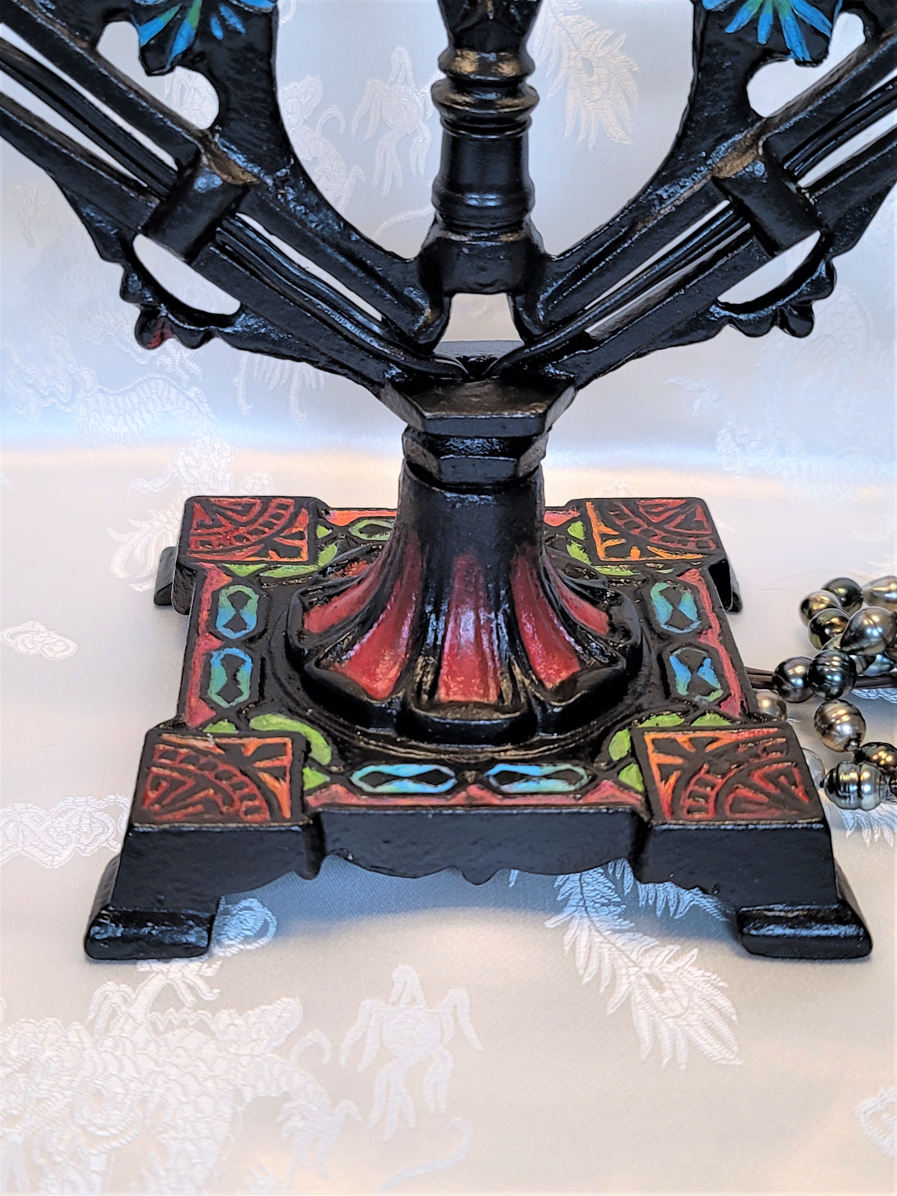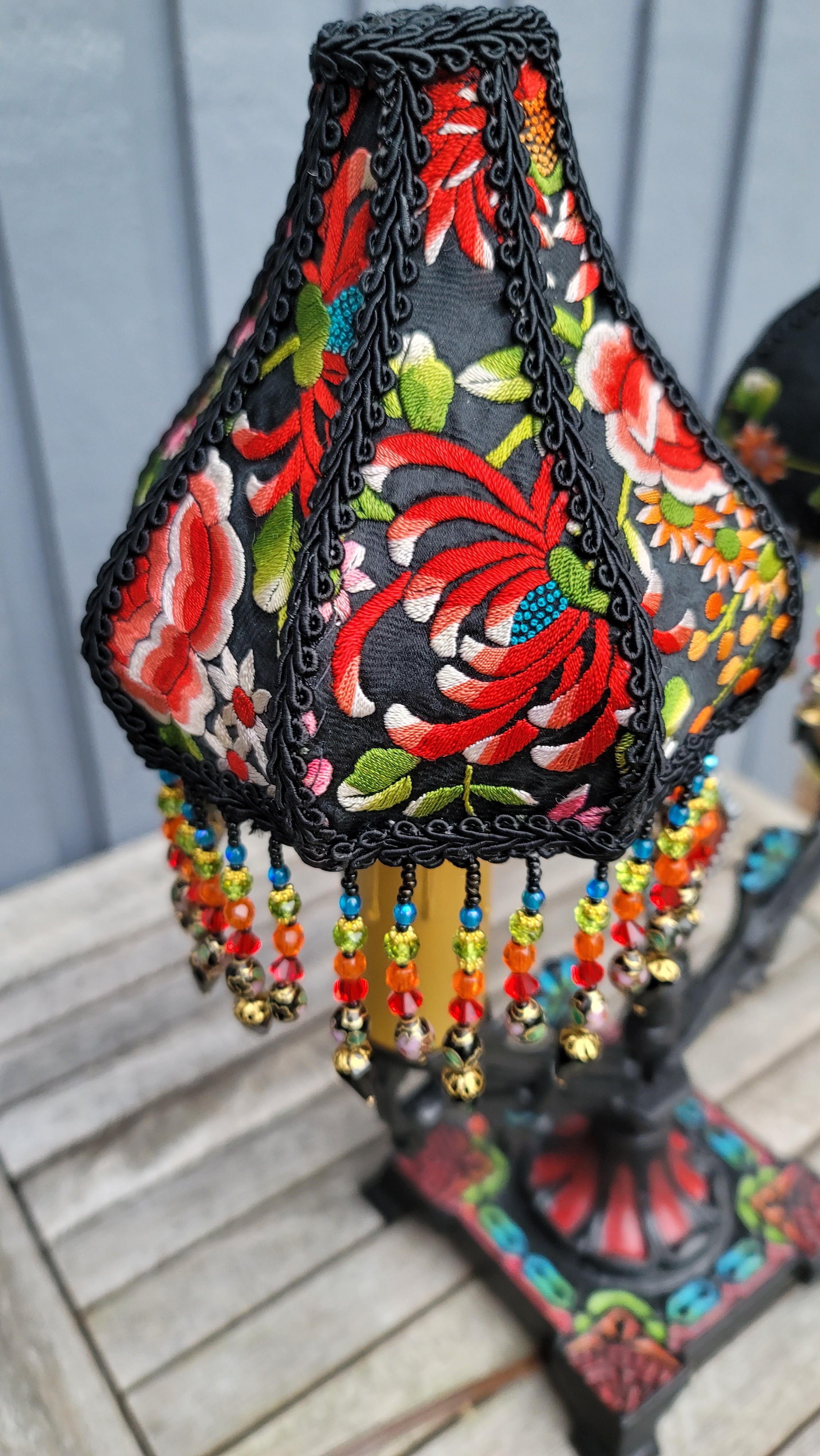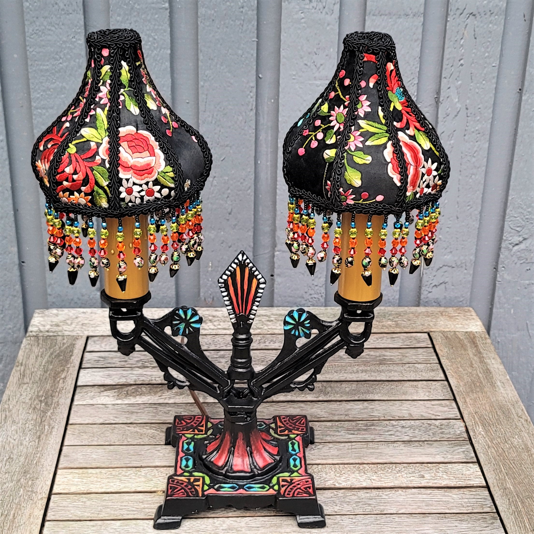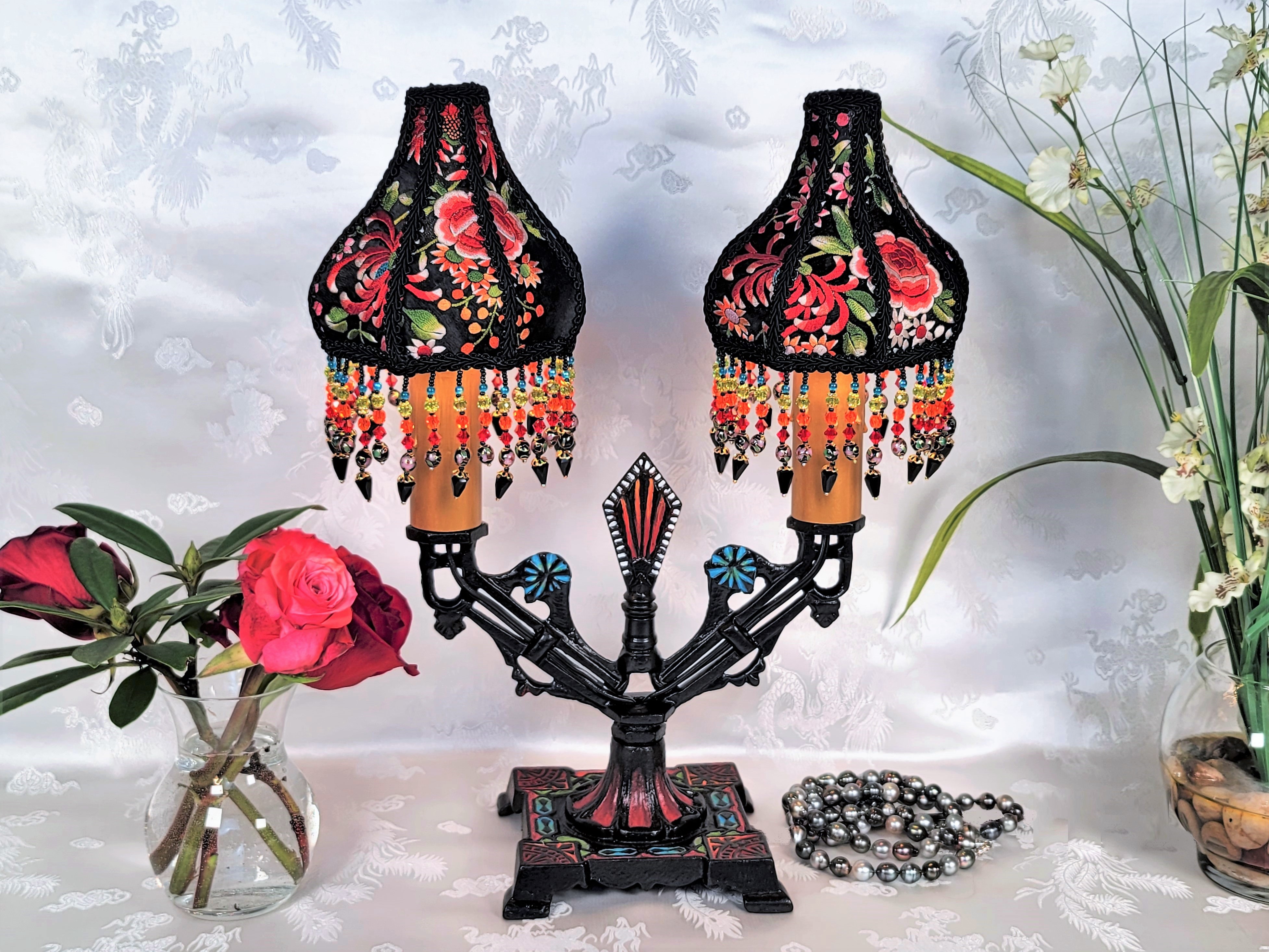 Take a trip back in time with this striking 1930’s Art Deco antique candelabra lamp! A dark chinoiserie piece, “Noir” by Elegance Lamps blends American metalwork craftsmanship, Eastern embroidery, and a Bohemian color palette. One-of-a-kind, handmade in Seattle.