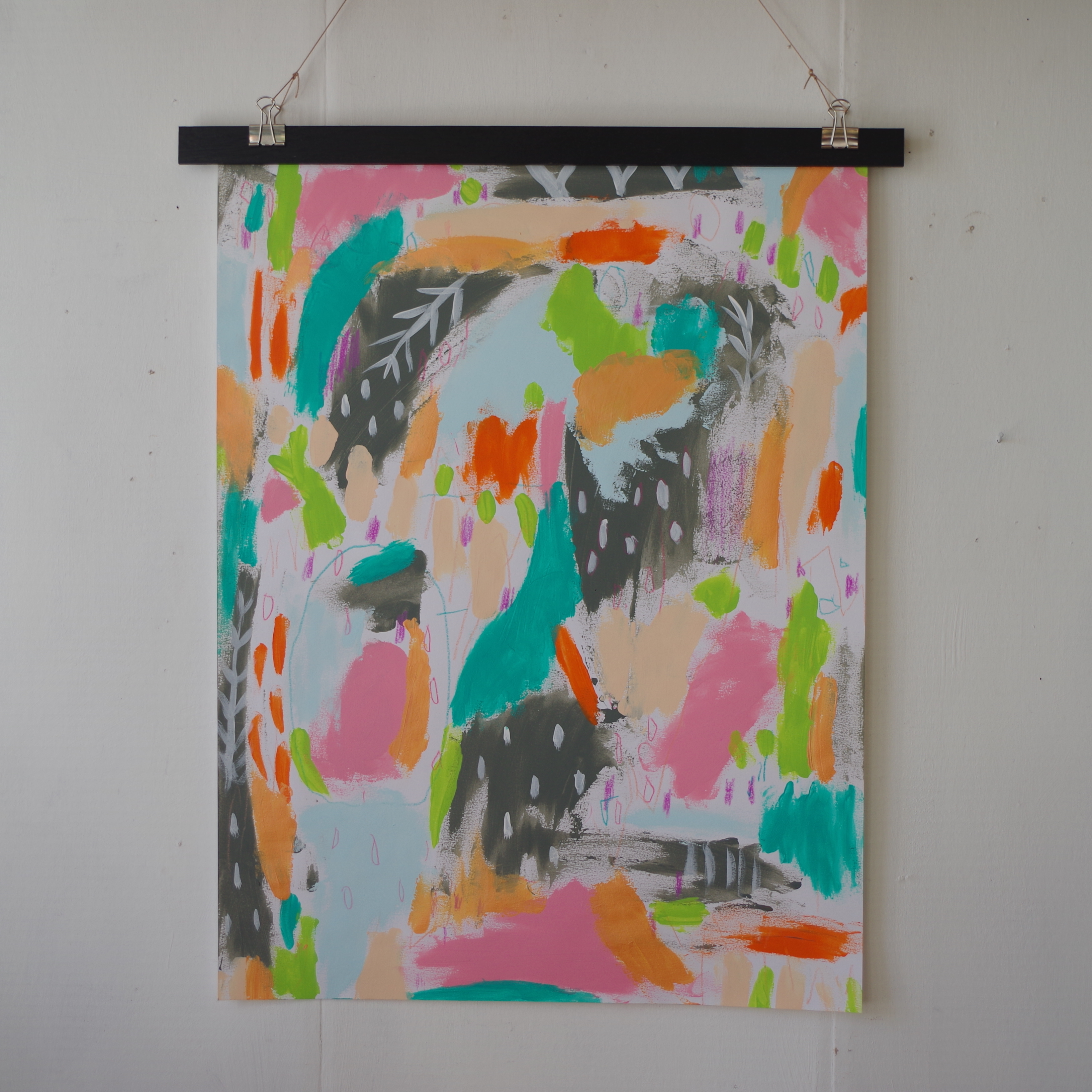 This colorful abstract mixed media painting is 18 X 24 inches and done on mixed media paper. It is signed on the back and ships rolled up in a tube. It would look great matted and framed or I can include the wood strip hanger for no extra charge upon request and it can be hung poster style. I feel the piece has a bright uplifting energy to it as well as an interesting composition.
