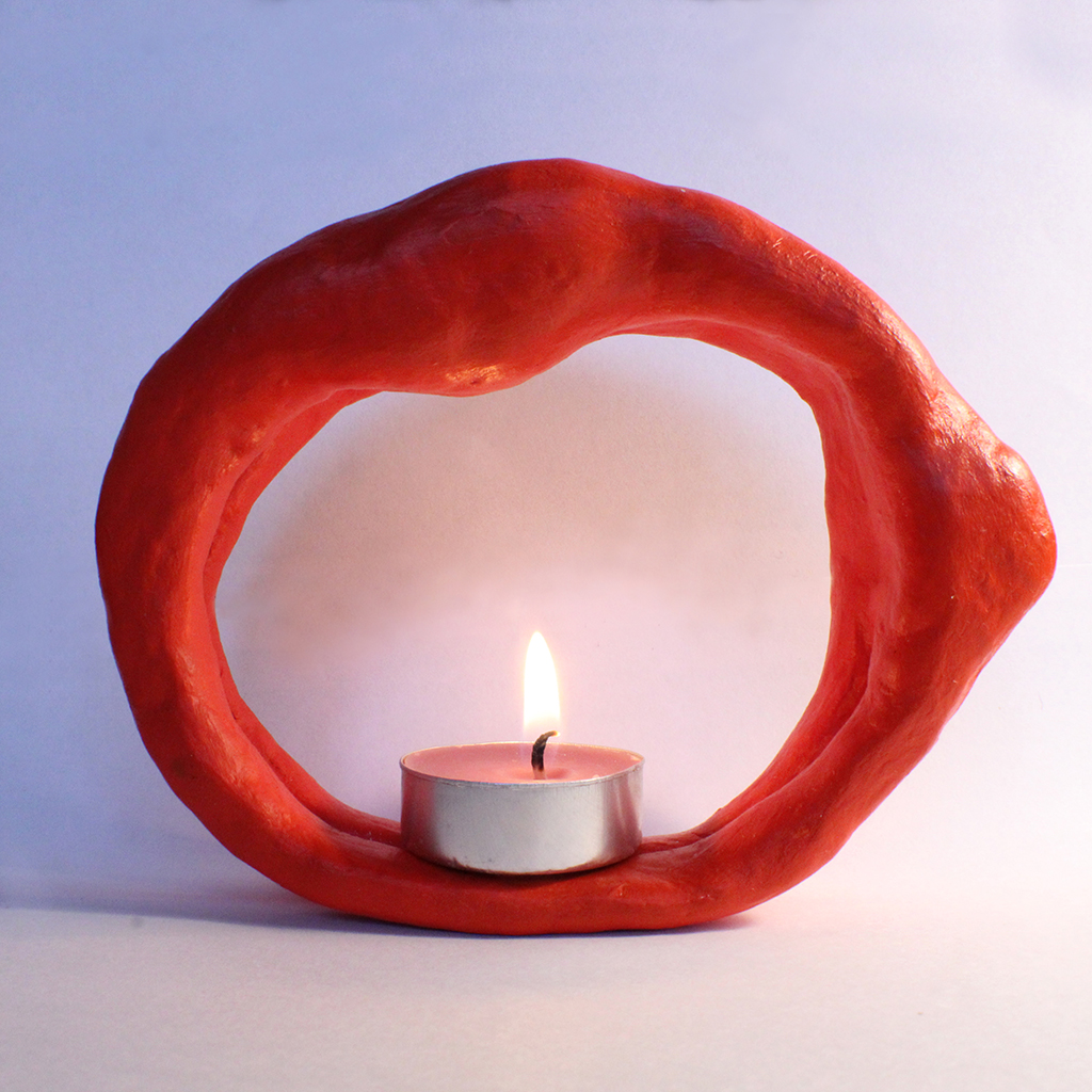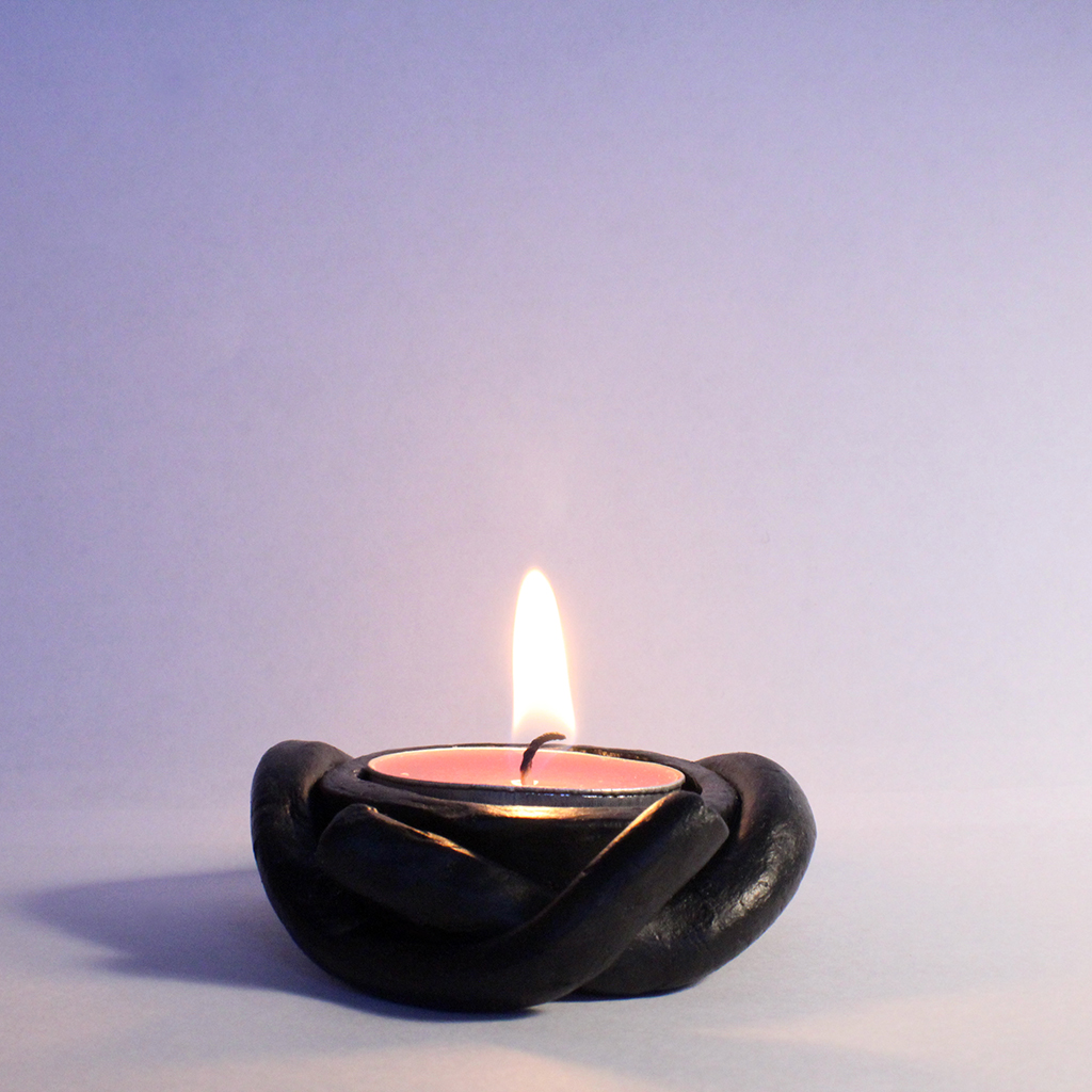 With the intention of making a tea light holder, as opposed to it being an after thought as was the case with the other pieces, I experimented further with the idea of arms cradling the flame whilst giving it room to grow. At first the 'arms' were twisted around the surrounding space above the flame but the material I was using to create these pieces (air drying, paper based clay - brand name unspecified) could not support the structure throughout the drying process. Having the arms as they are now, I think, gives a more intimate feel that works better with the concepts in mind.