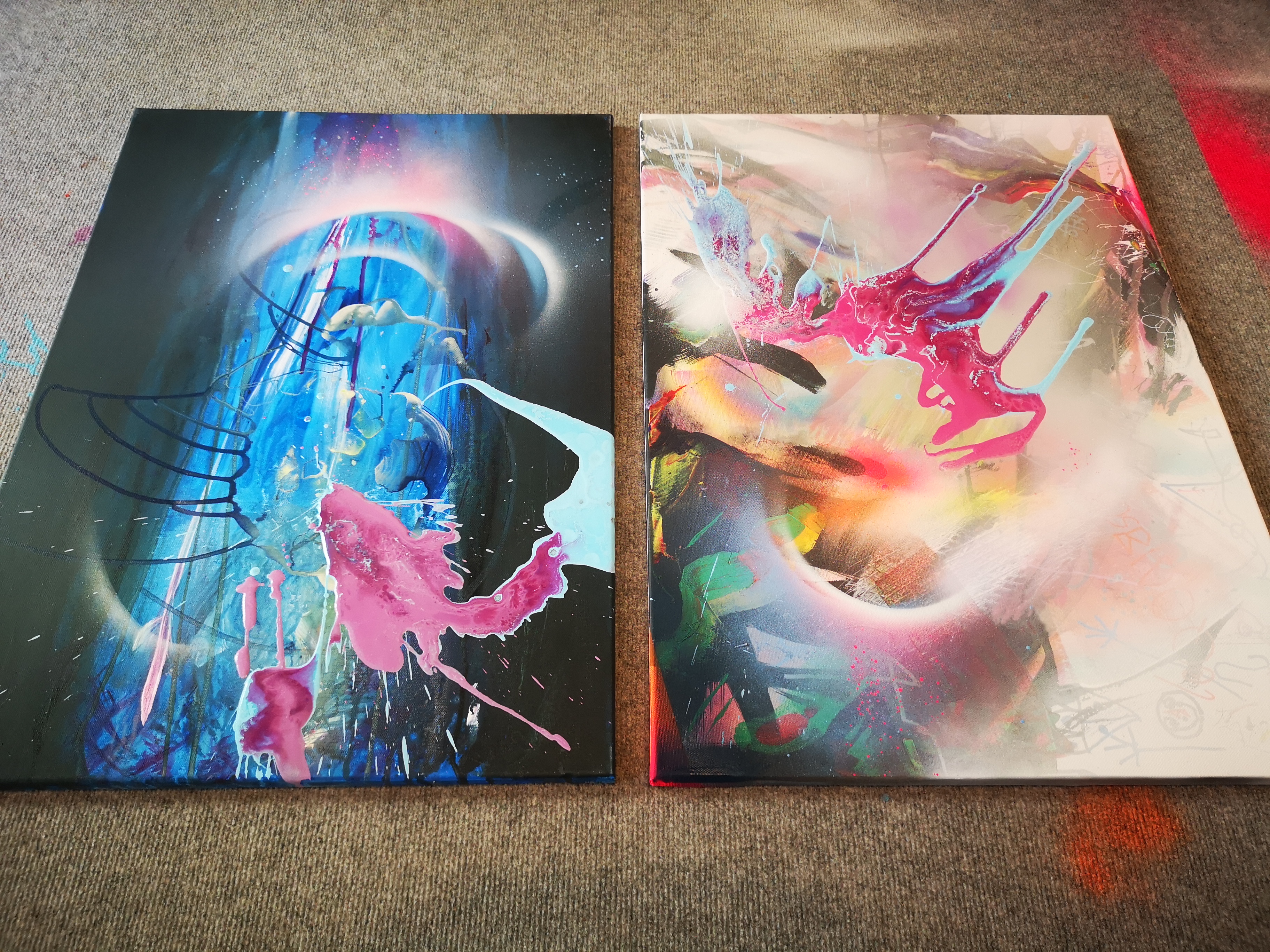 The colours are very alive on your canvas, and your compositions are interesting :D I like these~