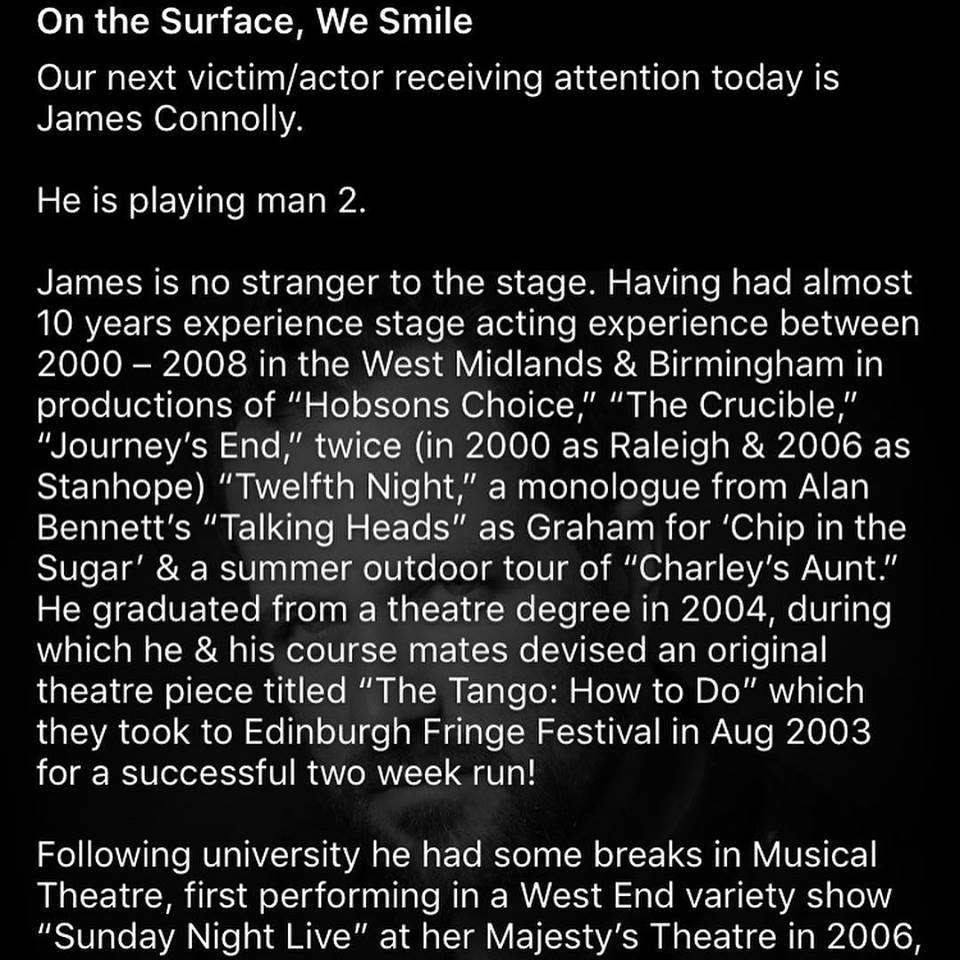 Introducing Actor - James Connolly - On the Surface we Smilediddywheldon (51)in #art • 8 years ago Tickets are available now at meltontheatre.co.uk or williamscreatives.co.uk. Like us on Facebook @OTSWS Like us on Twitter @OTSWSPLAY Thank you for your time ! Peace, Love, Life, Light and Laughter Diddy x #creative #theatre #acting #uk
