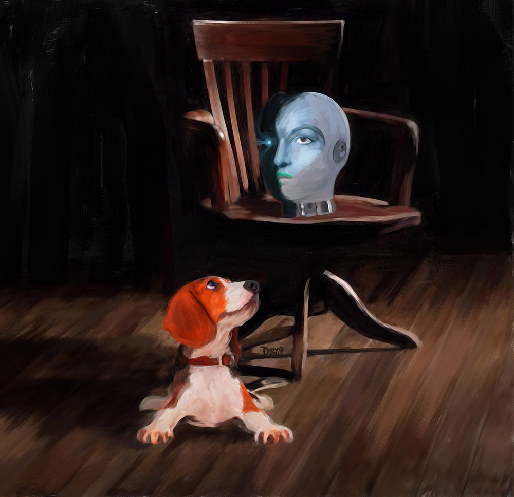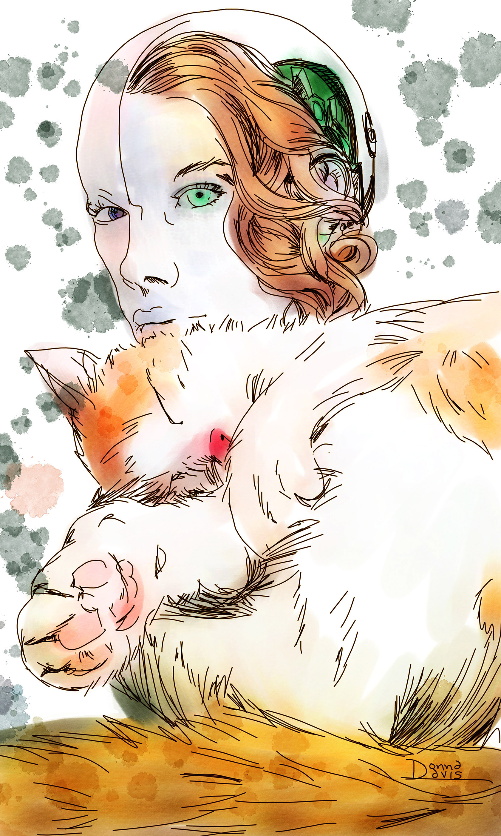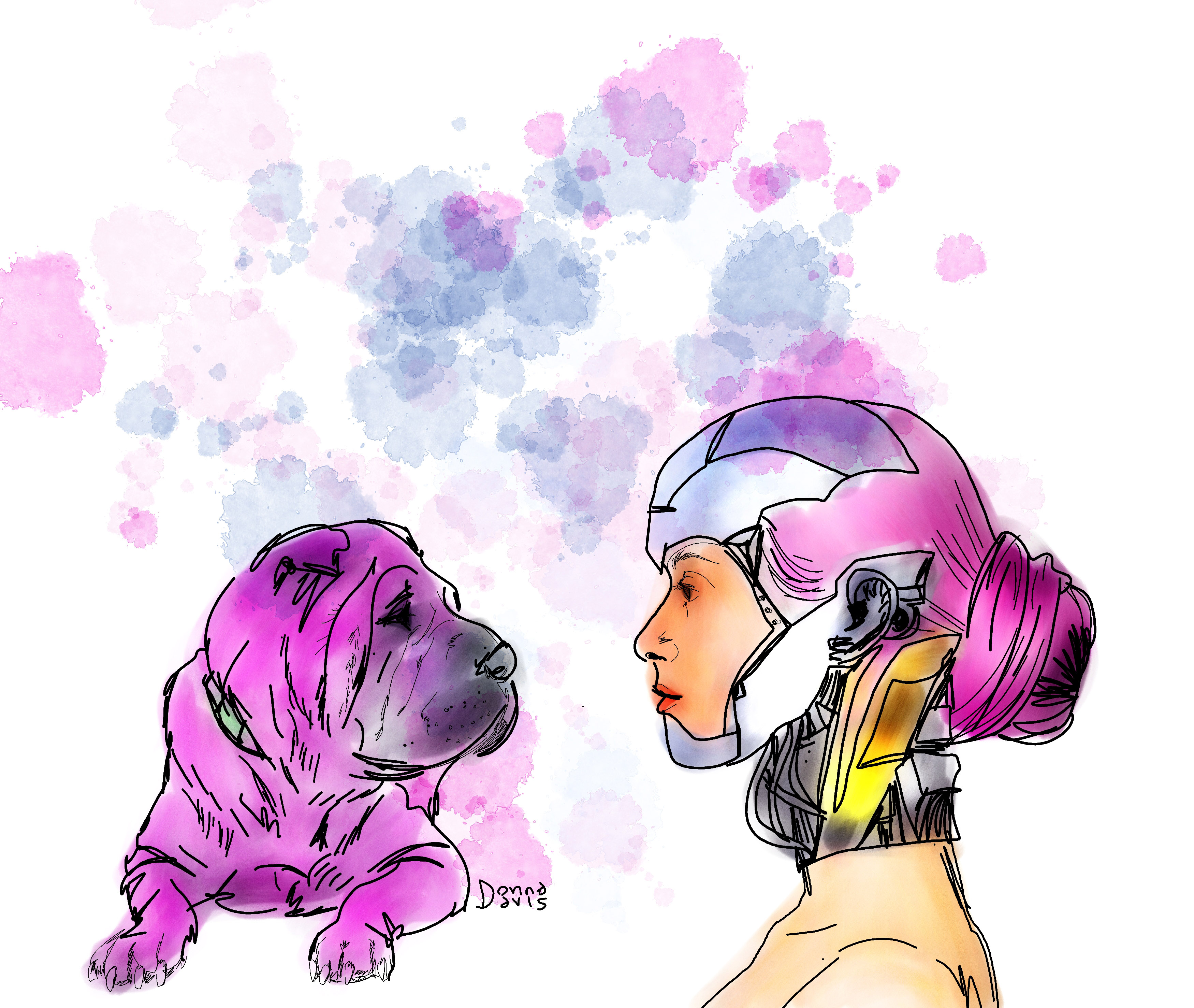 A simple sketch of a woman/hybrid and her tinted pink dog. A day in the life of post Singularity world.
