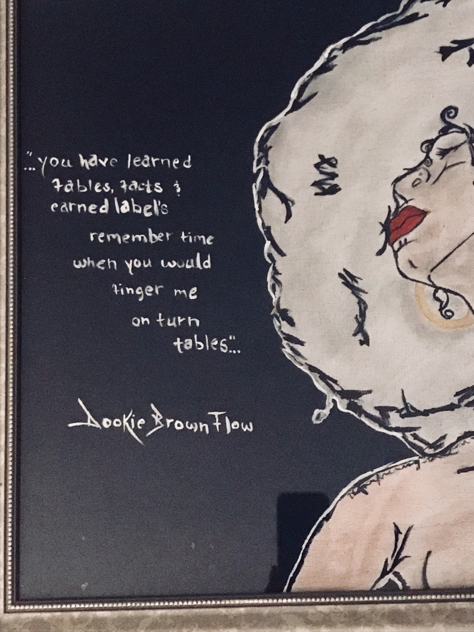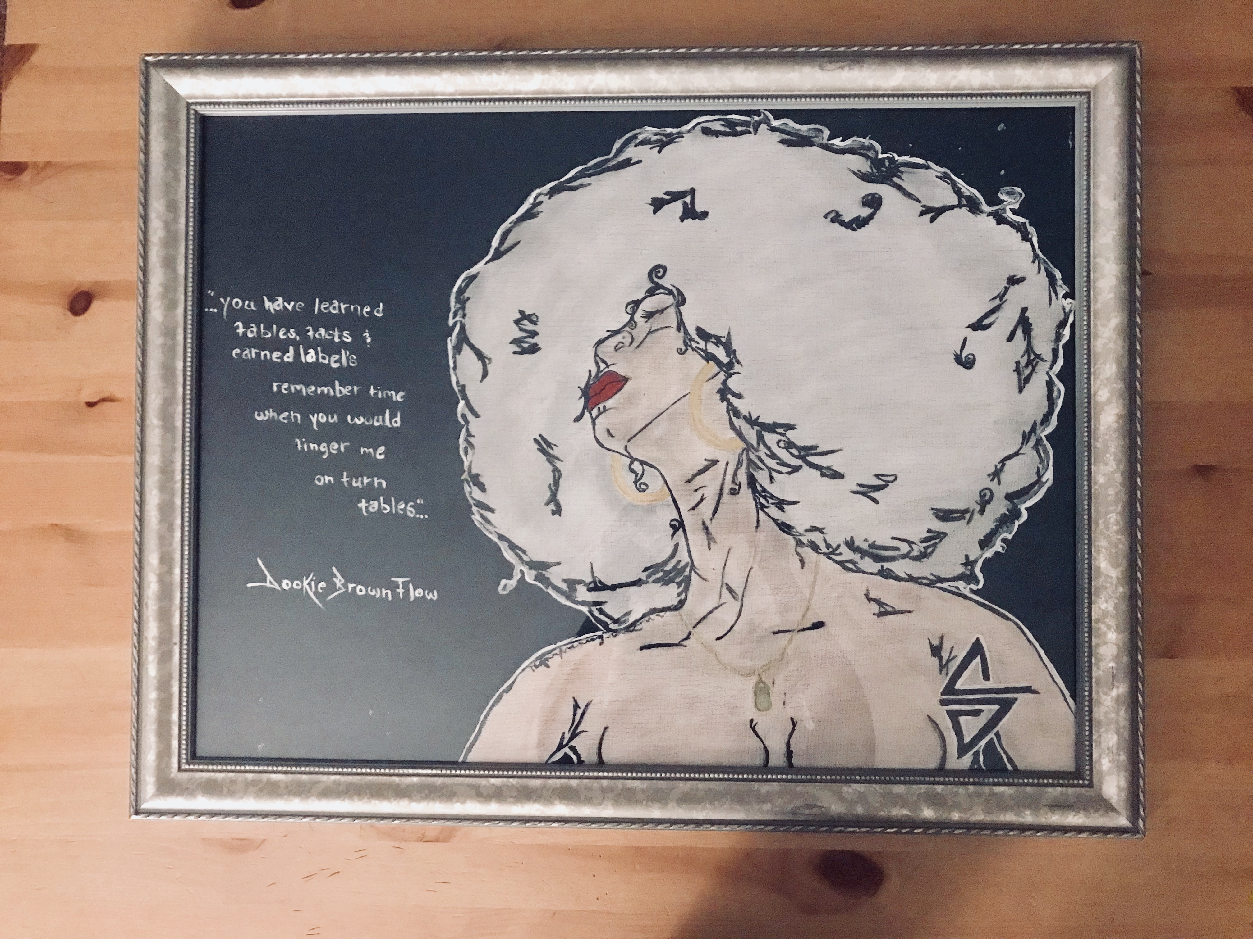 What’s up good people! Today was a great day to draw up a piece & upload due to the rain & cool temperature. So I decided to heat it up with dope lyrics & a afro on a chill chick! Plus I really wanted my own art work in my apartment hanging around so I got to work.