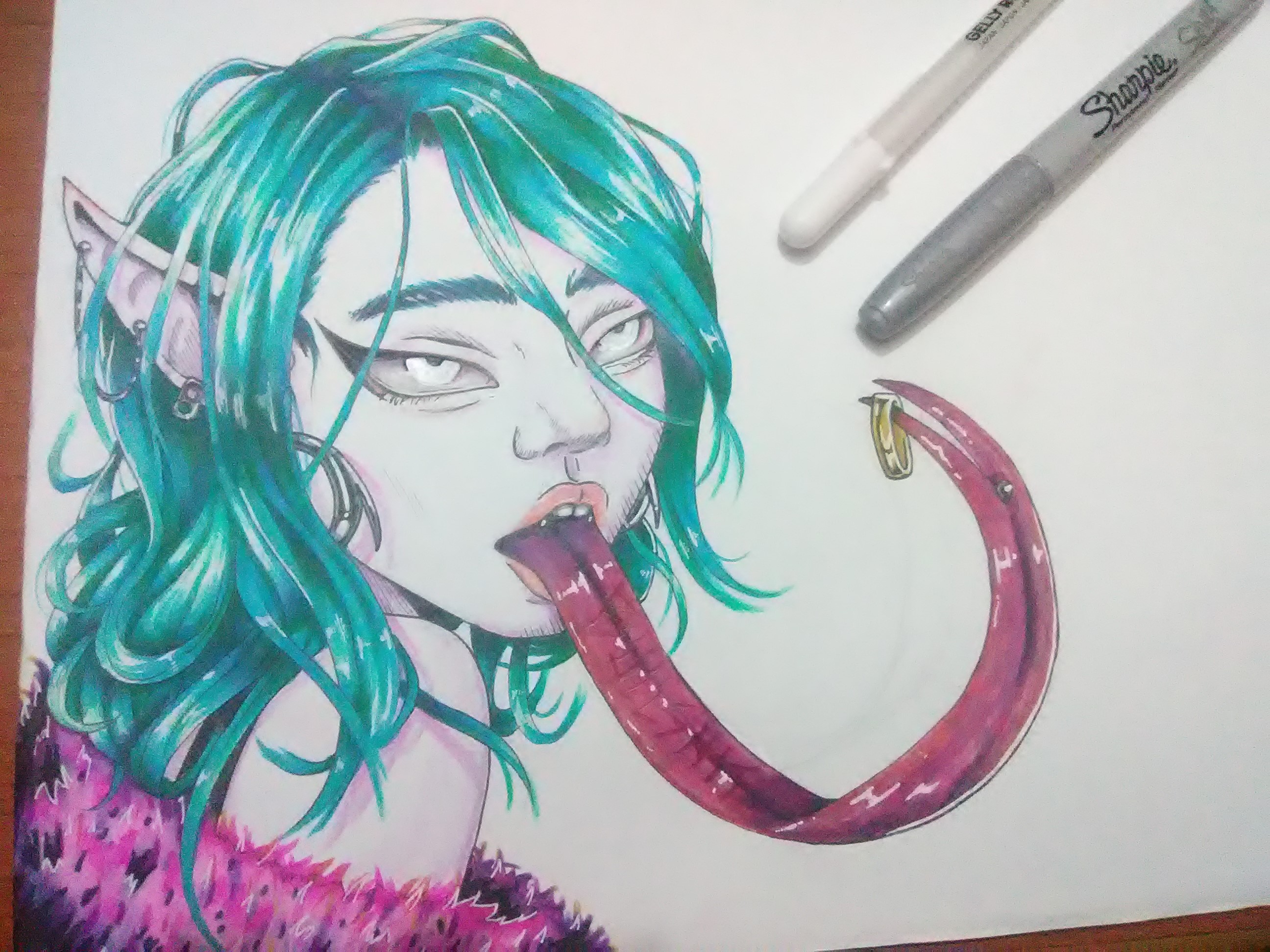 Luego le agregué color a lo demás, y todos los brillos con un lapicero blanco. En los ojos usé un marcador plateado, así que en el dibujo original se ven brillantes