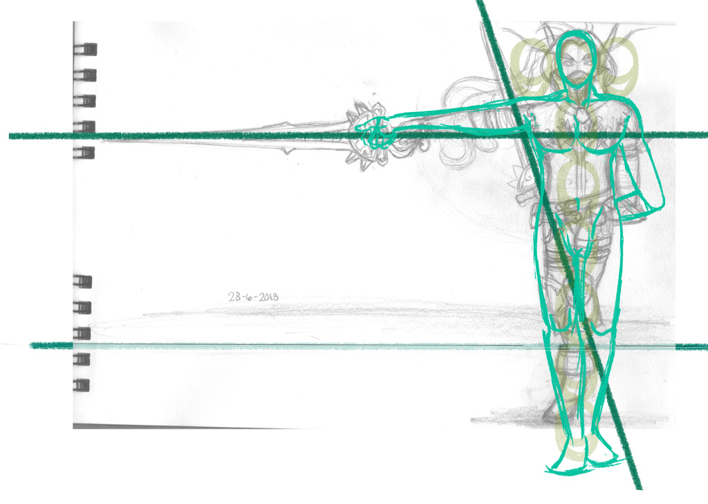 When I scanned my drawing… I do not like it at all. I only liked the pose; so, I maintained that and re do the drawing in digital. Using guide lines and references, now my character has a better skeleton and a proper structure.