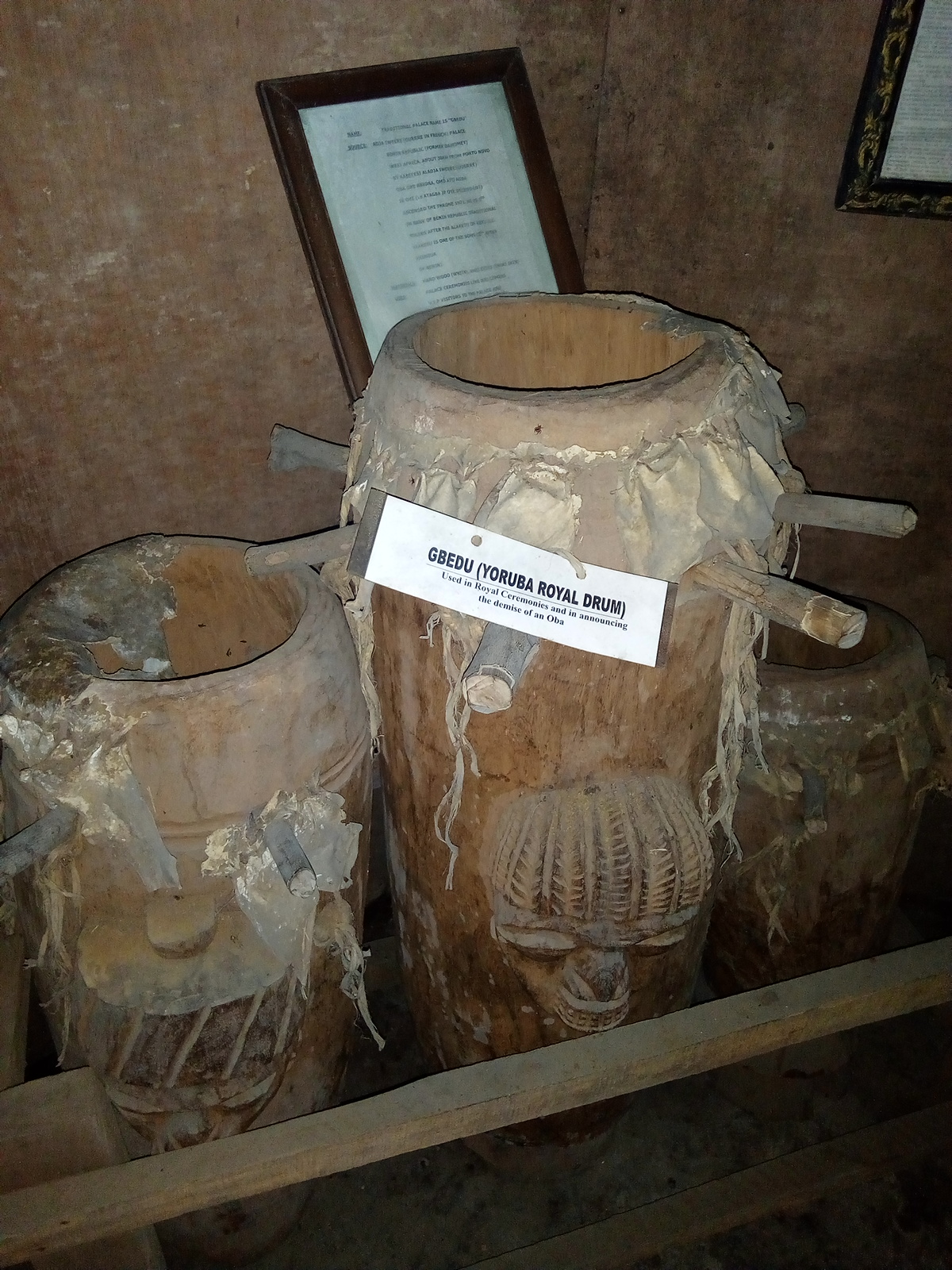 The Gbedu drum is said to have been brought to the Lagos area in the seventeenth century by Edo diplomats, symbolizing the hegemony of the Benin Empire . Among the Yoruba, the Gbedu drum signifies royalty. The largest of the Yoruba drums, it was played only in the king's service. In ceremonies such the rite of Isagun, the Oba might dance to the music of the drum. If anyone else used the drum they were arrested for sedition.