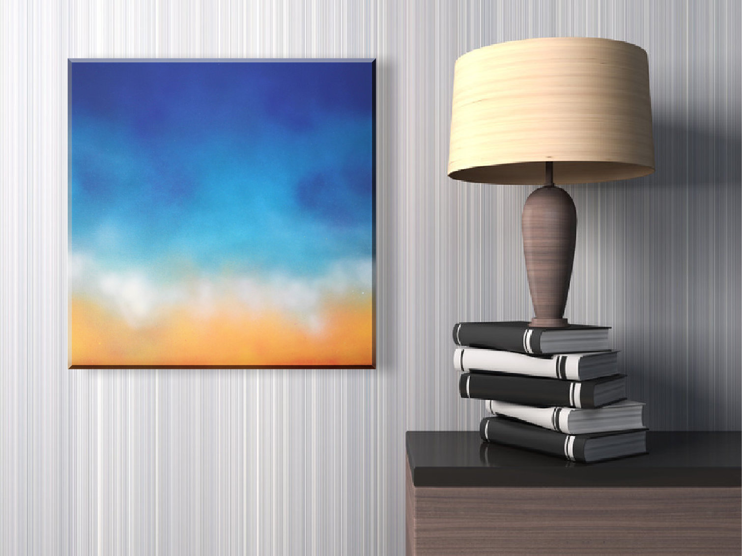 This was done with spray paint and is an abstract illustration of a beach and the ocean.