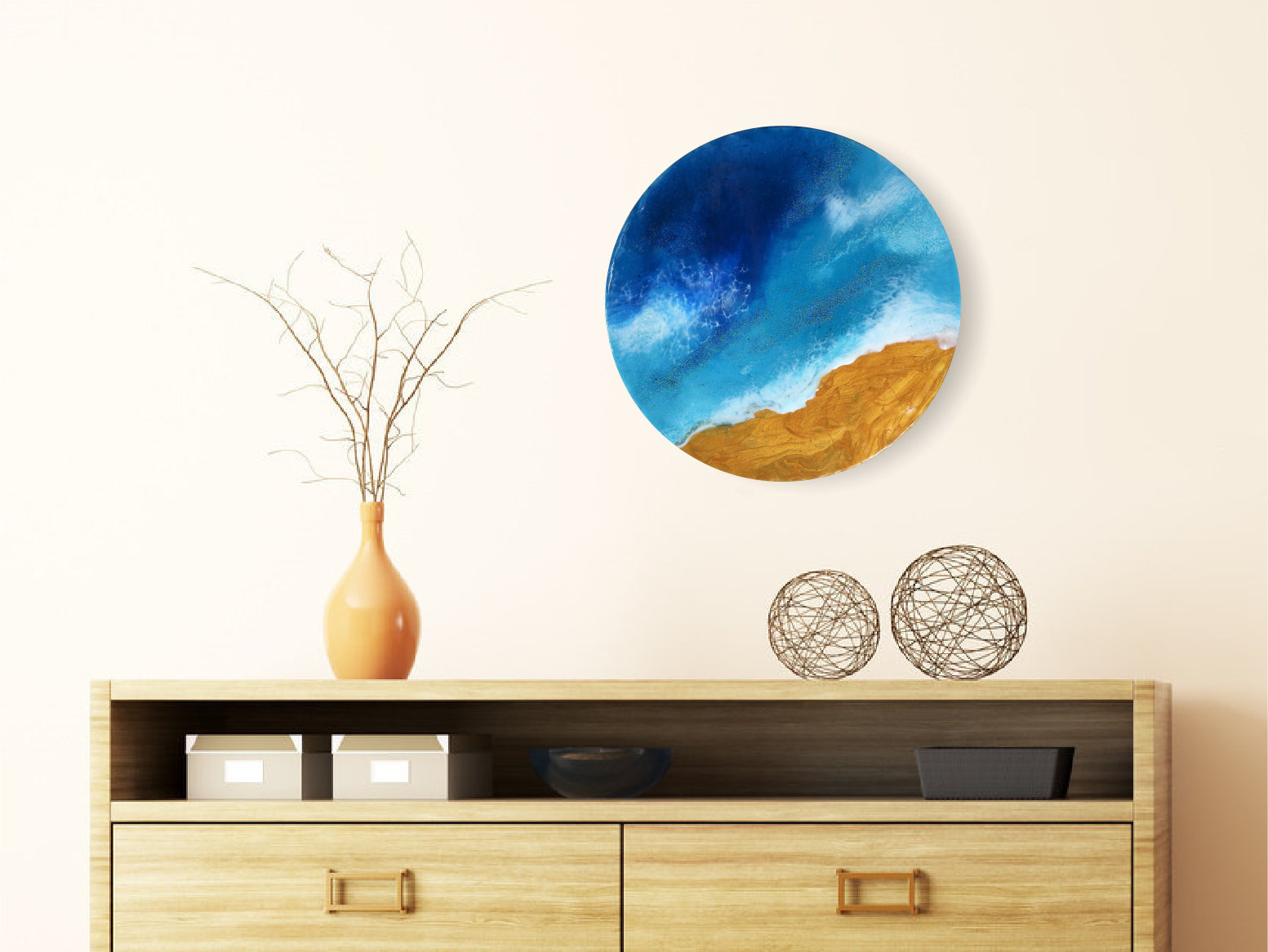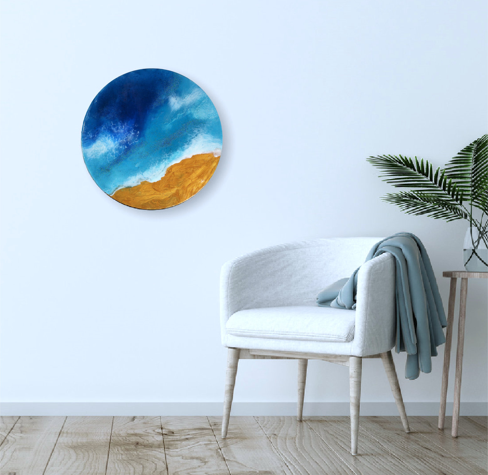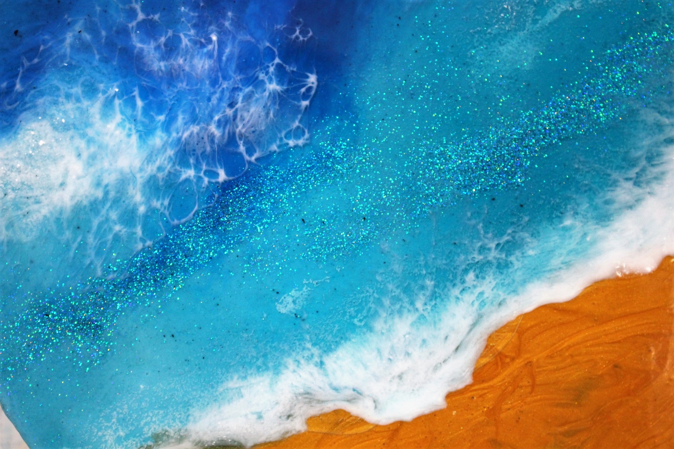 The Beach is painted with gold acrylic paints and the blue water was made with resin in several layers.