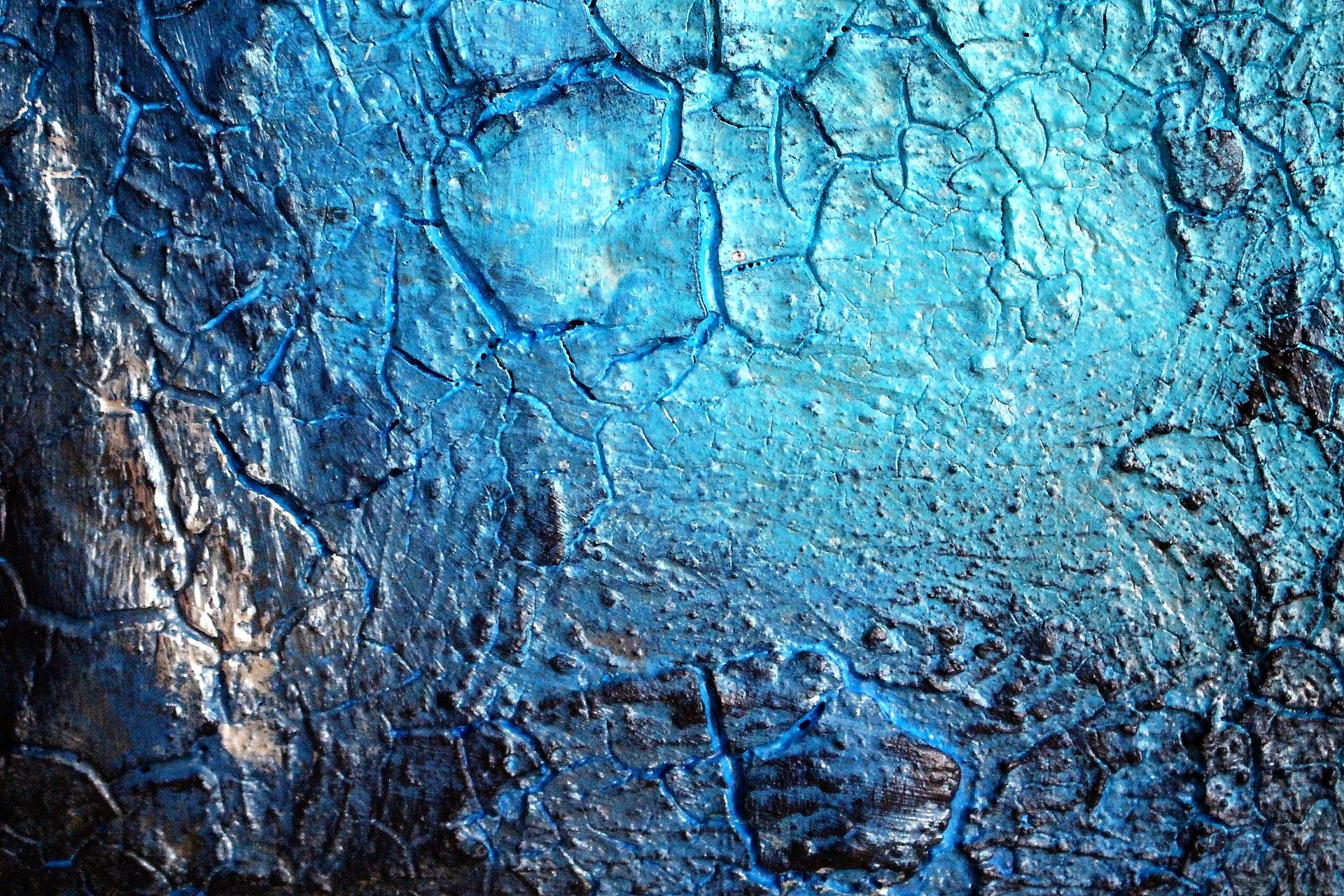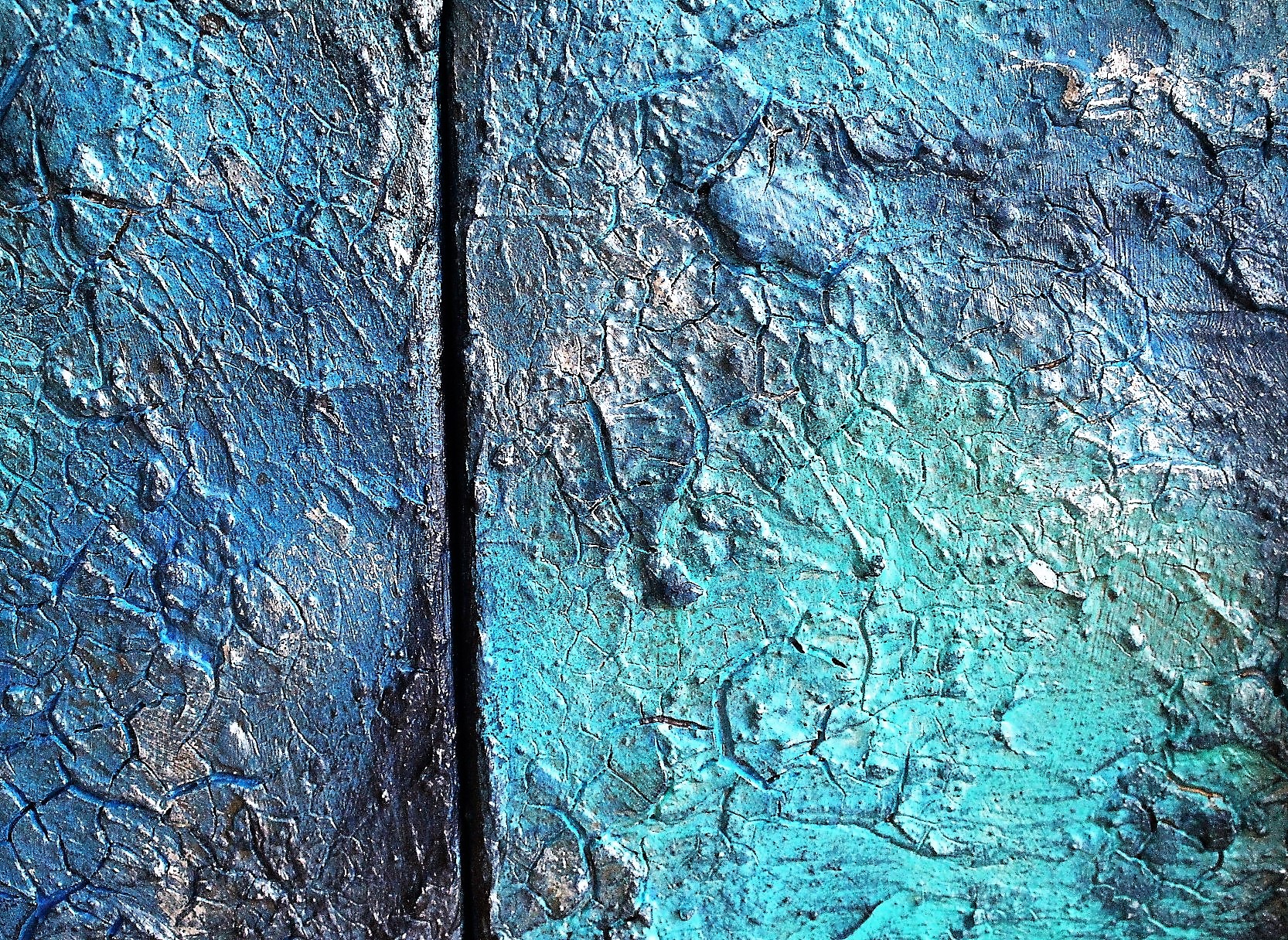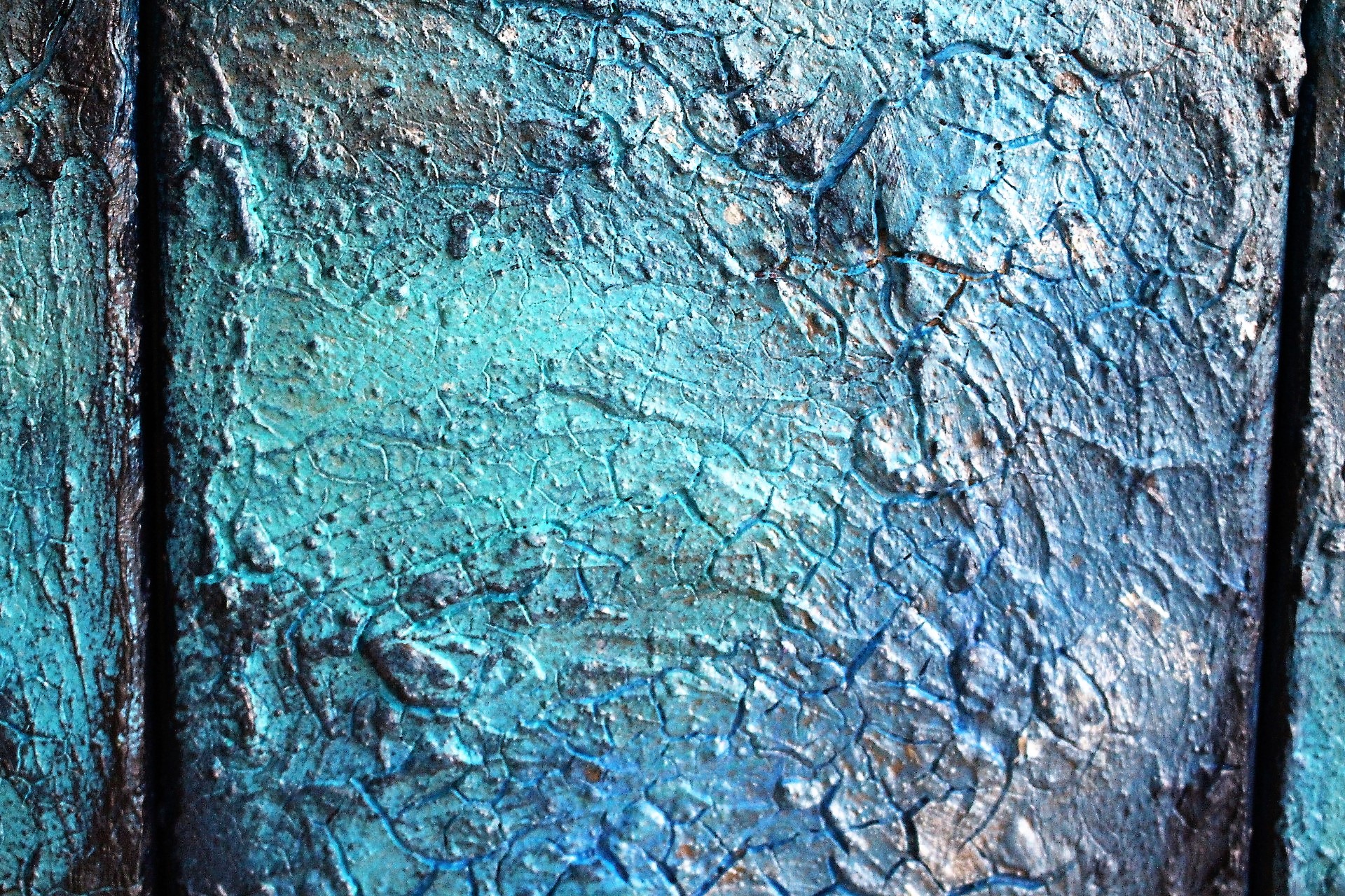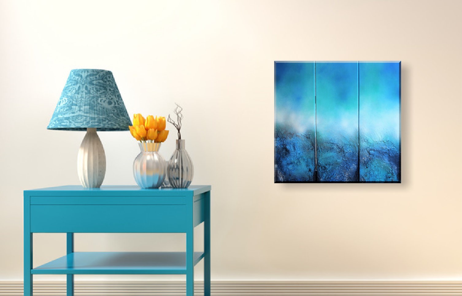"Serenity" is a blue abstract, three-part painting. The individual canvases can be hung separately or together. The interesting effects in the picture were created with the help of structure paste.