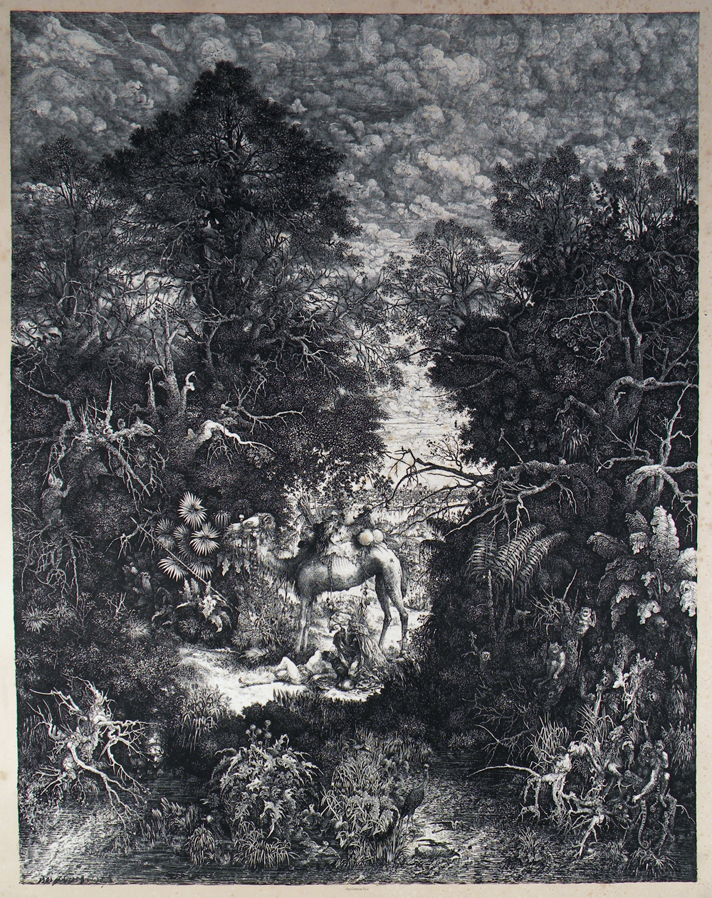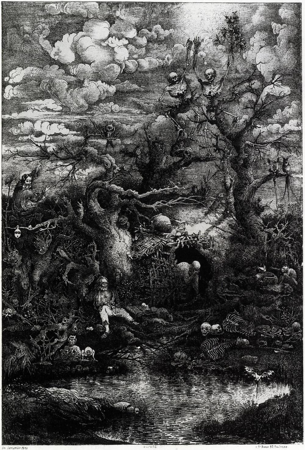 Bresdin's prints were generally tiny and executed with meticulous detail ; biblical scenes are set in fantastic landscapes, densely enclosed with vegetation, with mysterious, slightly macabre overtones.