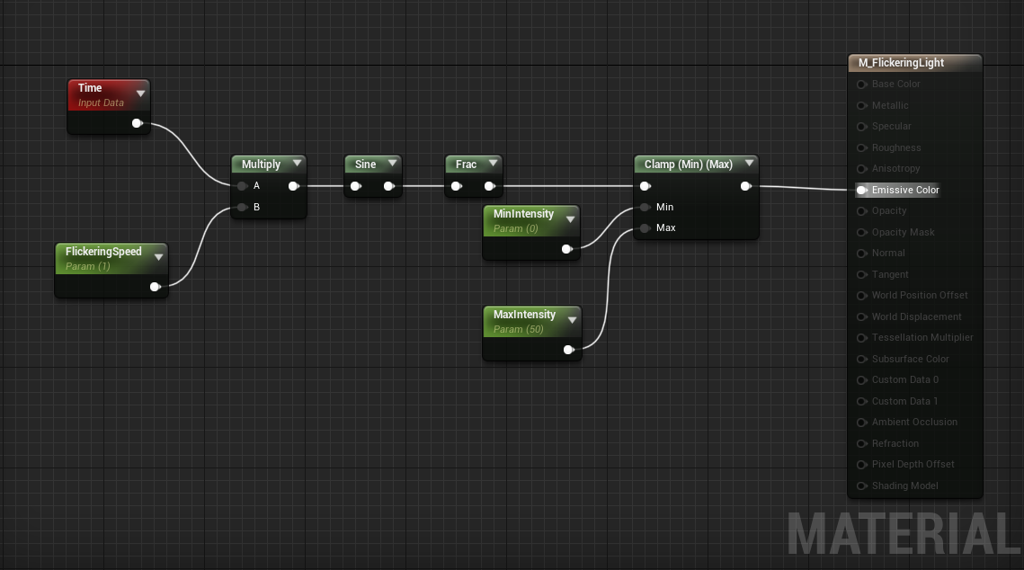 In the content browser, right click and add a new material that will serve as a master for our light function. Name it M_Flickeringlight. Open it, and in the detail panel, change the material domain to light function. This will leave only the emissive output to work with. Right click to search for a red node called time. You might have guessed, this will keep track of time to animate the flickering. Drag out the time output pin and let go to search for the multiply node. Now from the B input, drag out and search for a scalar parameter. Rename it to FlickeringSpeed. In the details panel, give it a default value of 1.