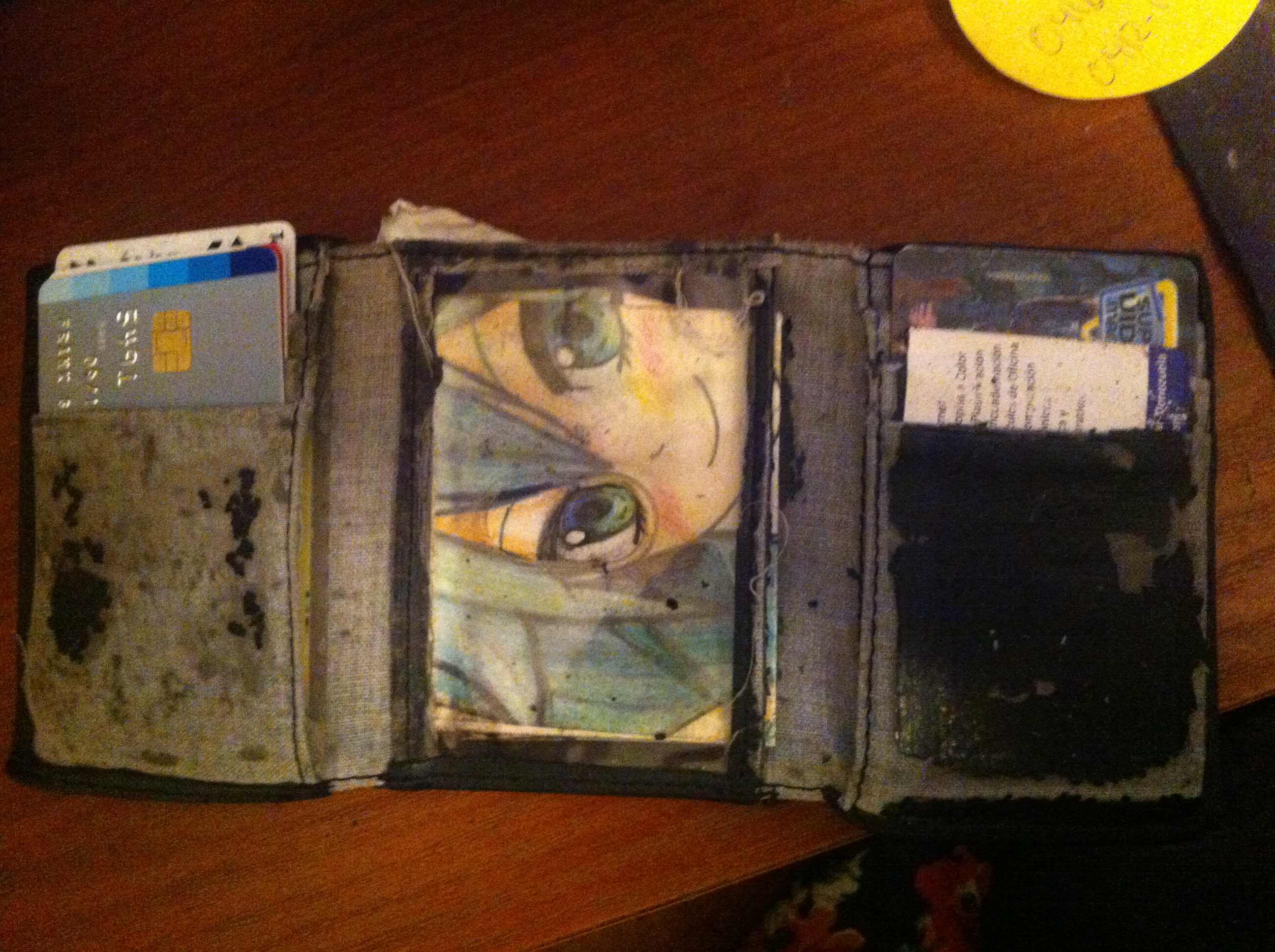 Lo doblé en varias partes para que pudiera entrar en ese... ¿bolsillito? y quedó chévere. Muchas personas al ver el dibujo reconocen al personaje y los que no, les gusta el diseño. Aunque es verdad que logré encontrar una imagen para rellenar ese espacio en la cartera como para llamar la atención, siento que el tener ese dibujo conmigo es como cargar con el recuerdo de esa niña alegre a la que solía regalarme dibujos y con la que compartí parte de su niñez cuando necesitaba de un amigo.