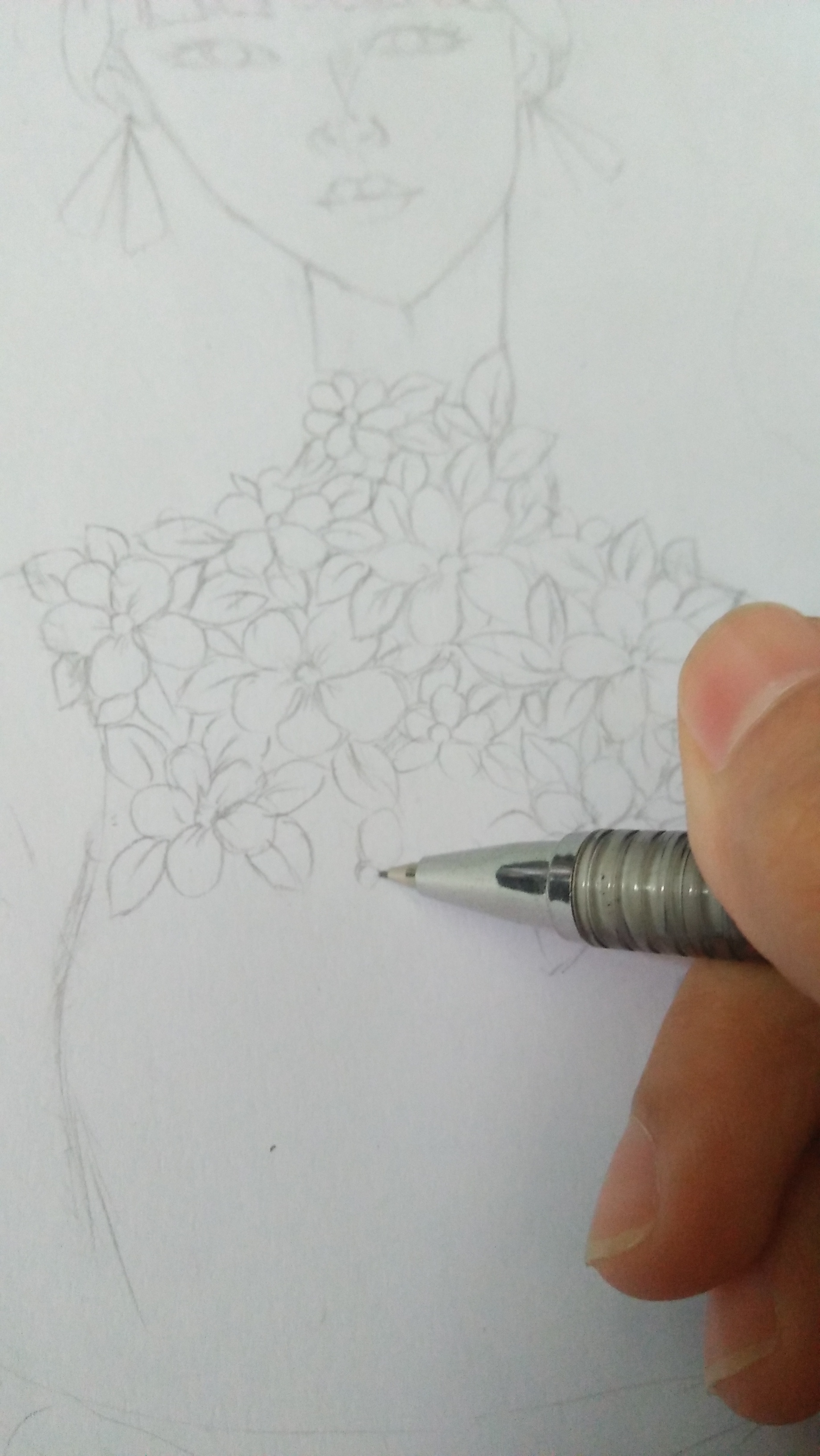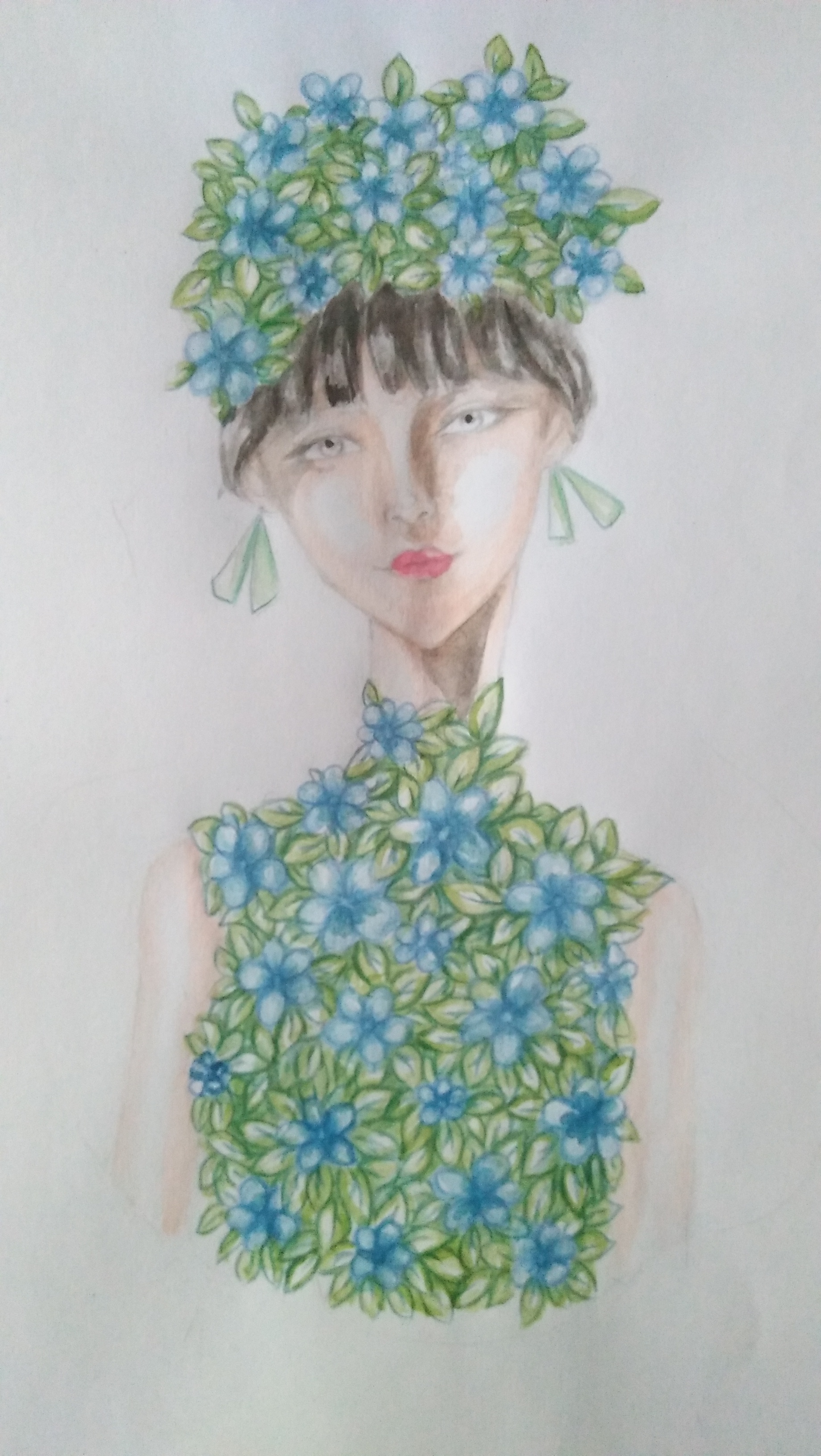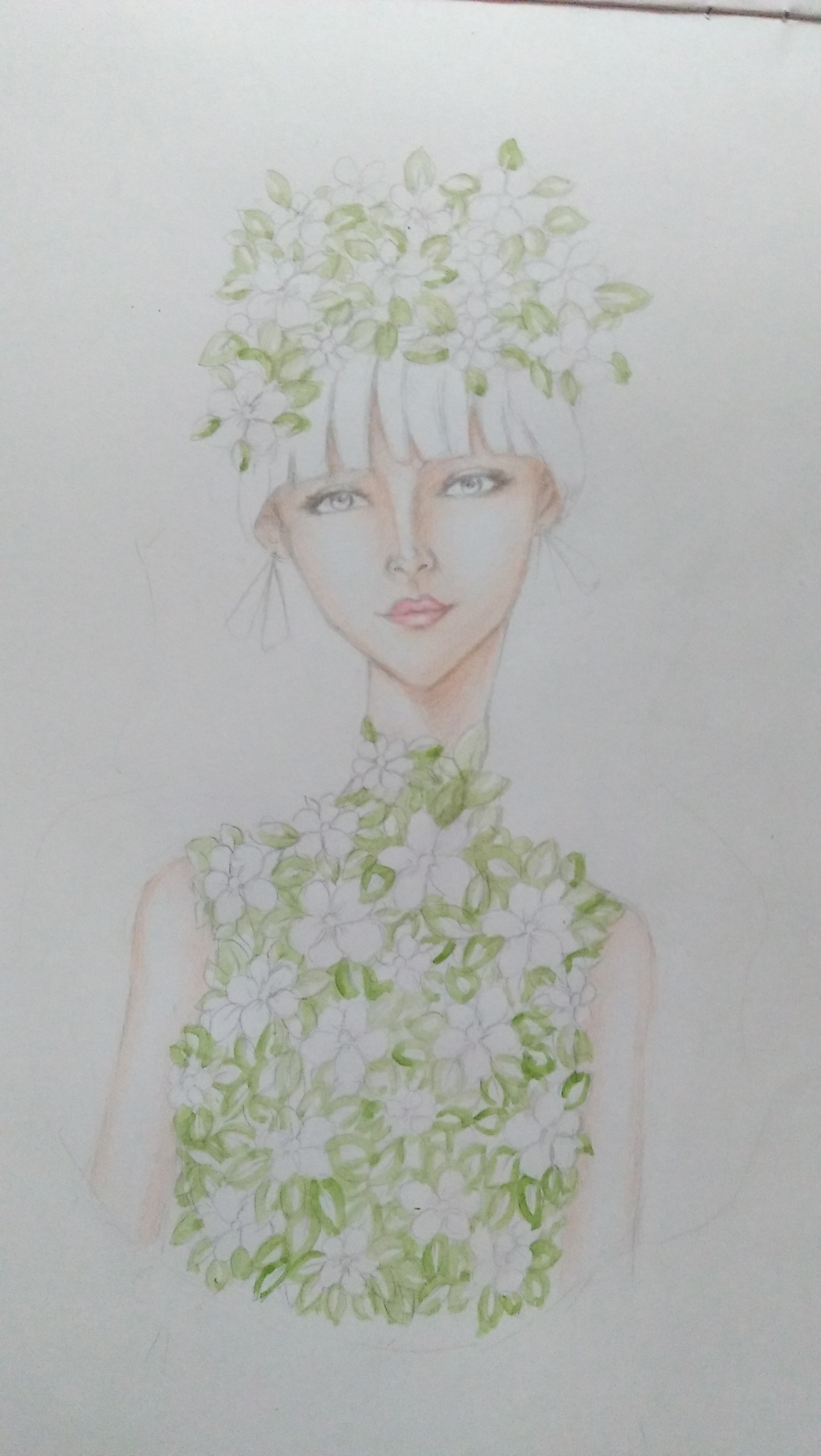 Hari ini aku mau menggambar illustrasi seorang wanita yang sedang mengenakan pakaian penuh dengan bunga. Illustrasi ini ku buat karena terinspirasi oleh dedaunan hijau yang ada di sekitar rumah.