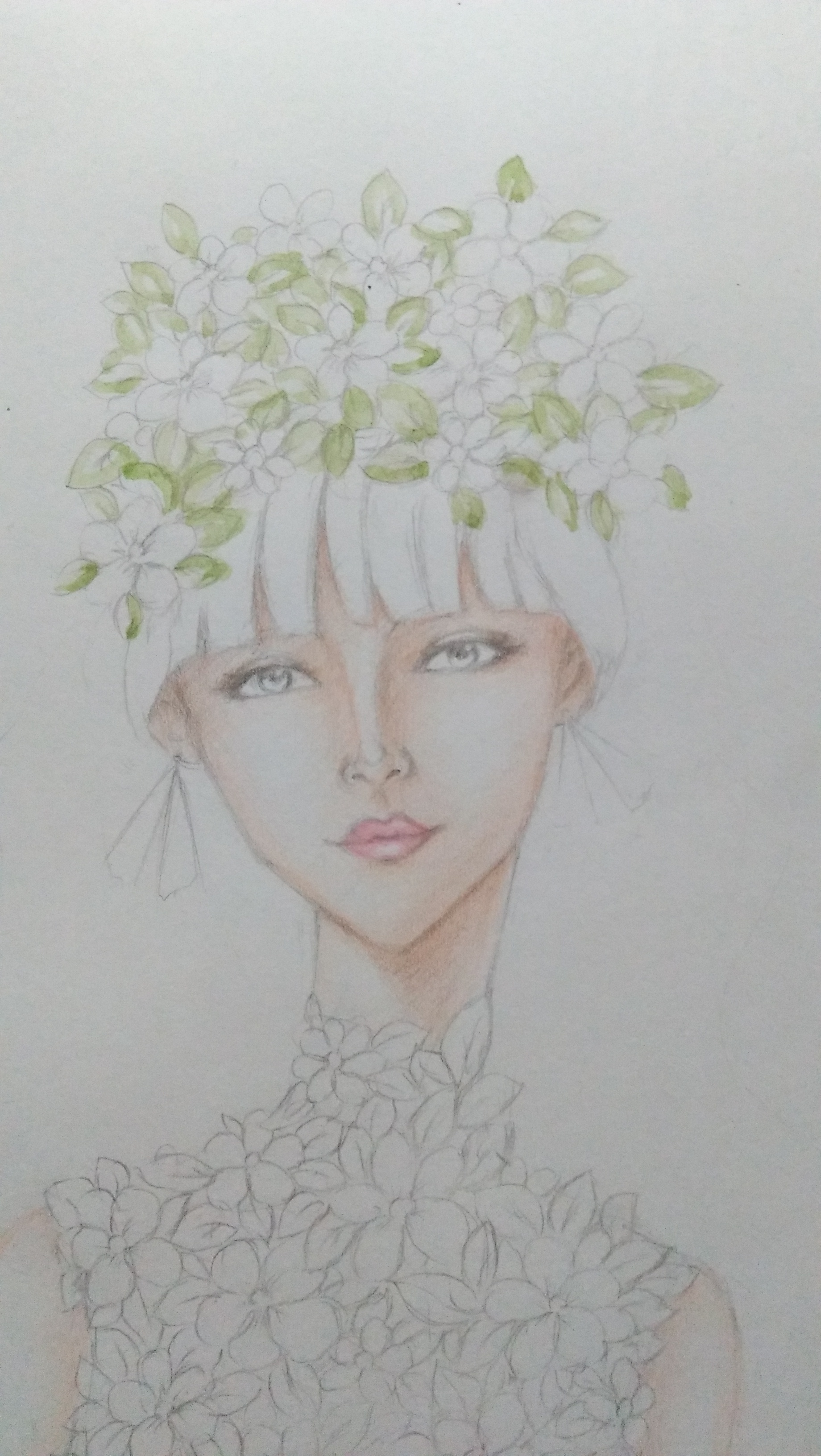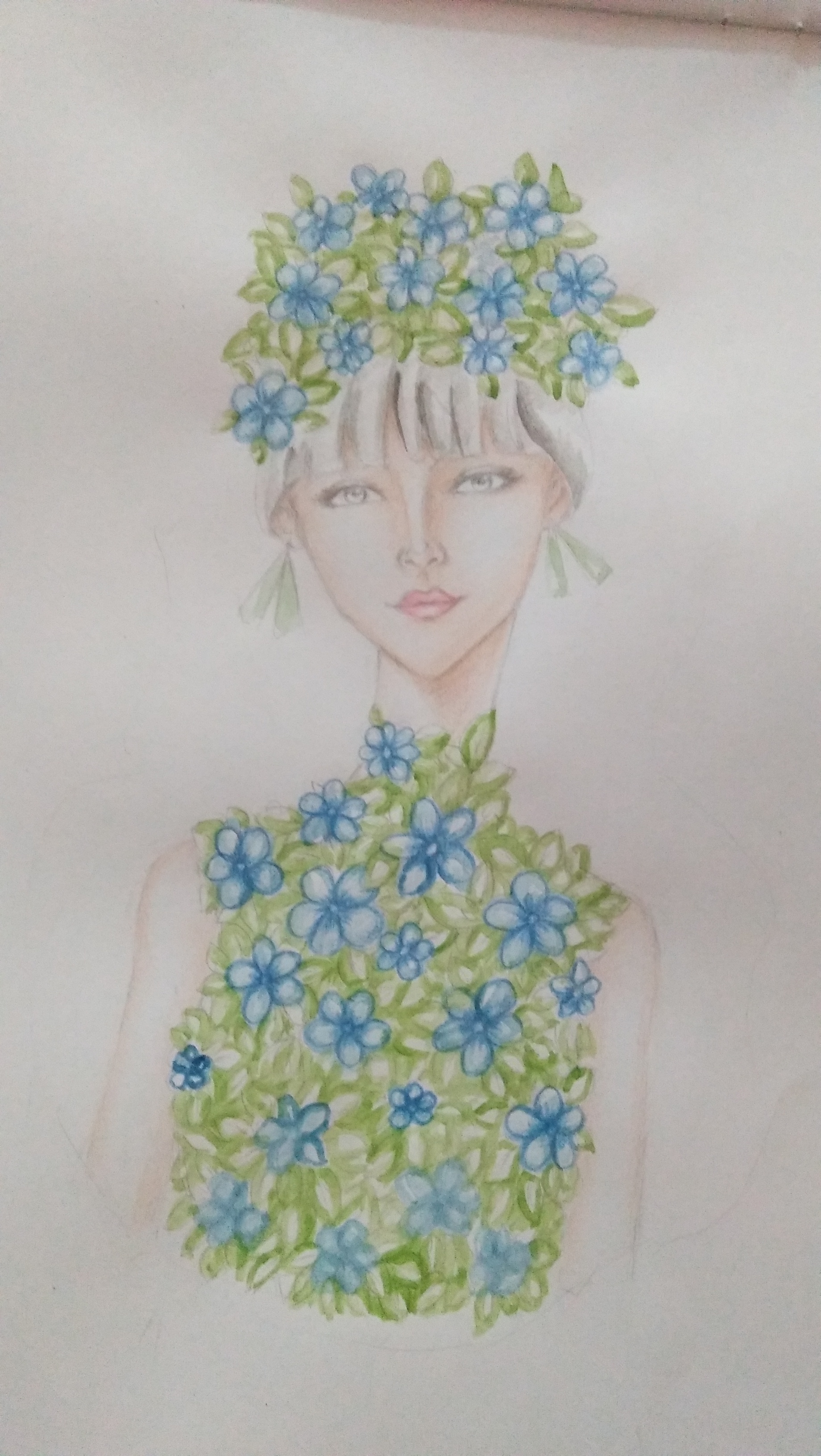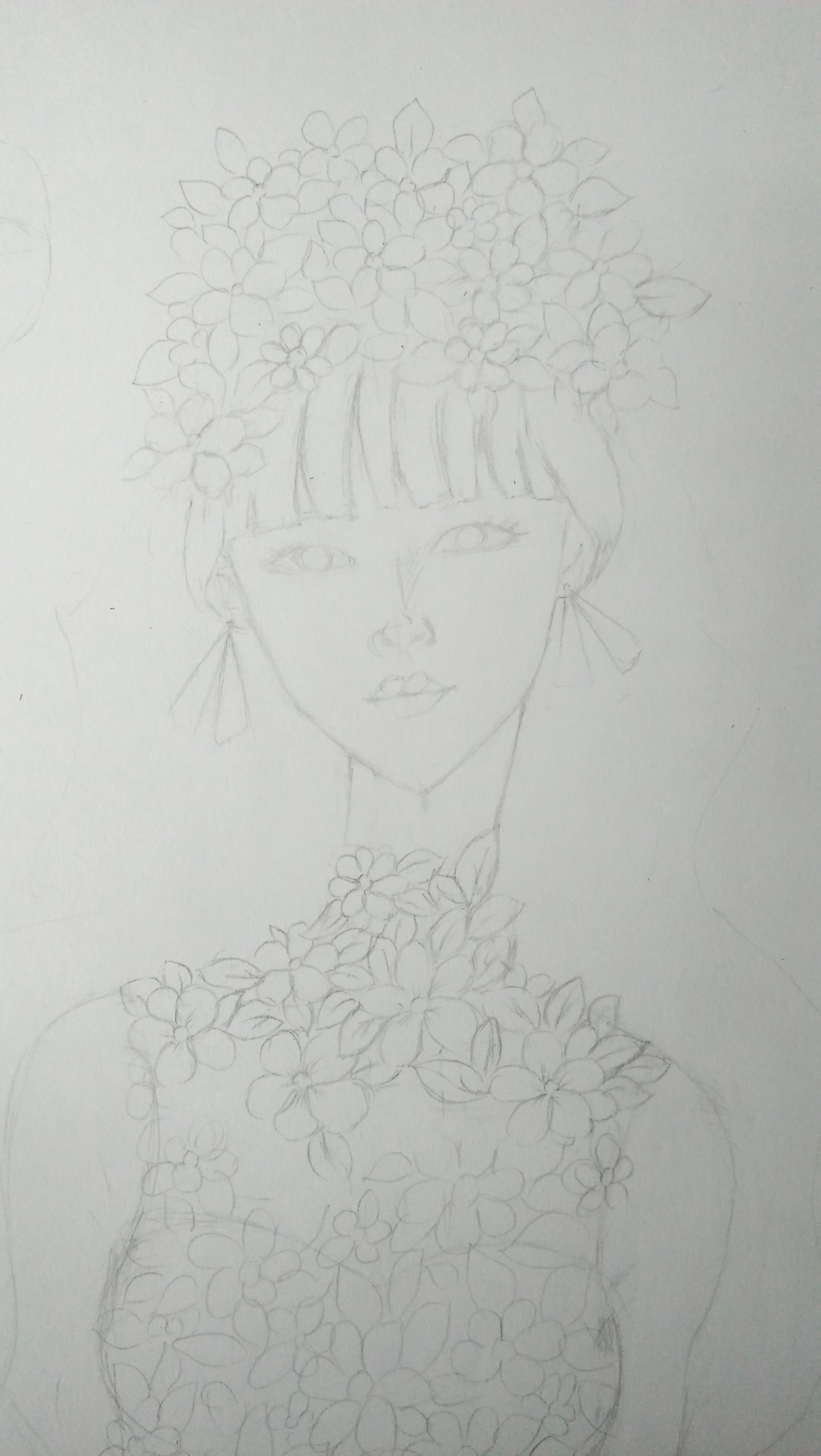 Hari ini aku mau menggambar illustrasi seorang wanita yang sedang mengenakan pakaian penuh dengan bunga. Illustrasi ini ku buat karena terinspirasi oleh dedaunan hijau yang ada di sekitar rumah.