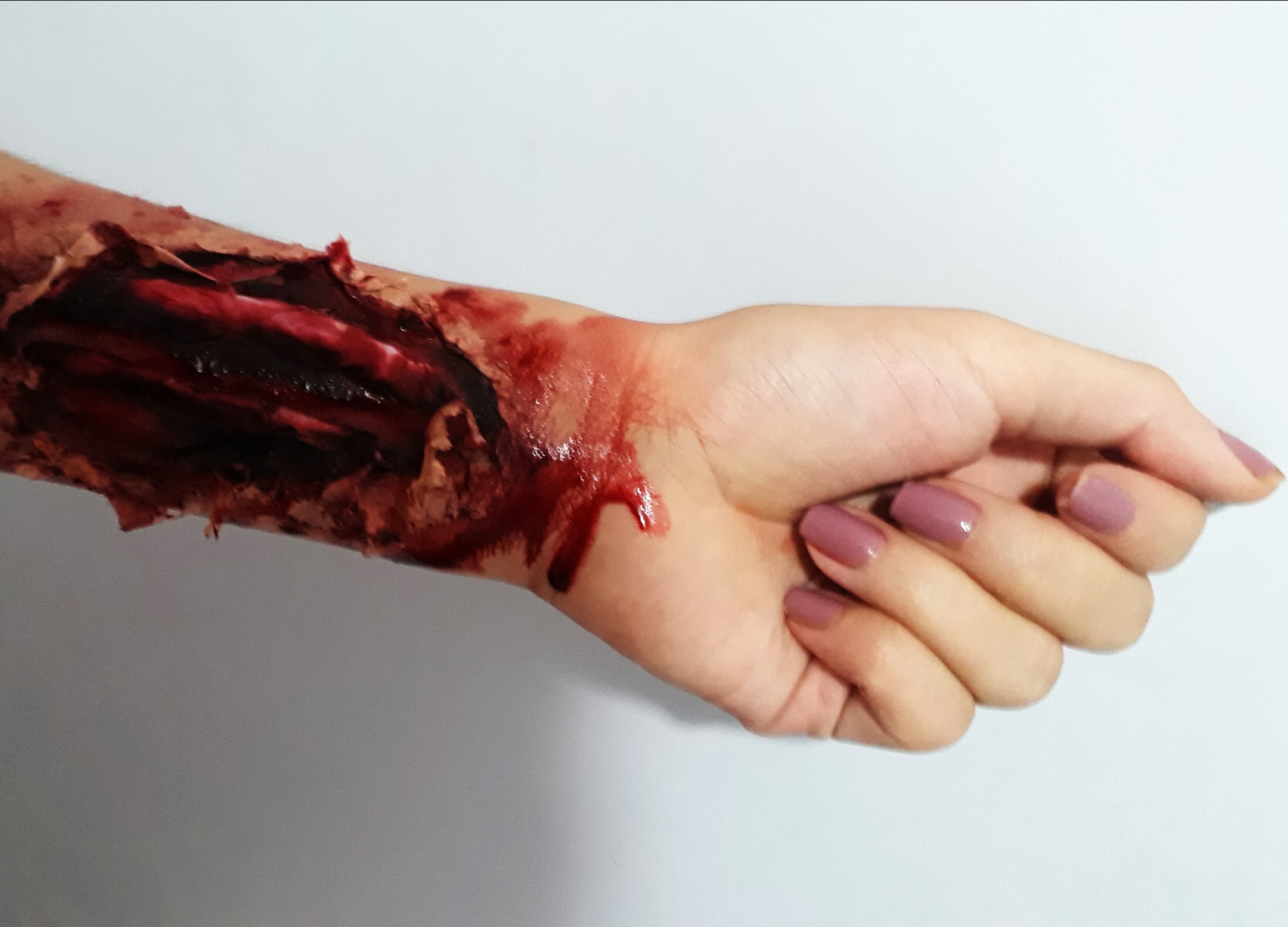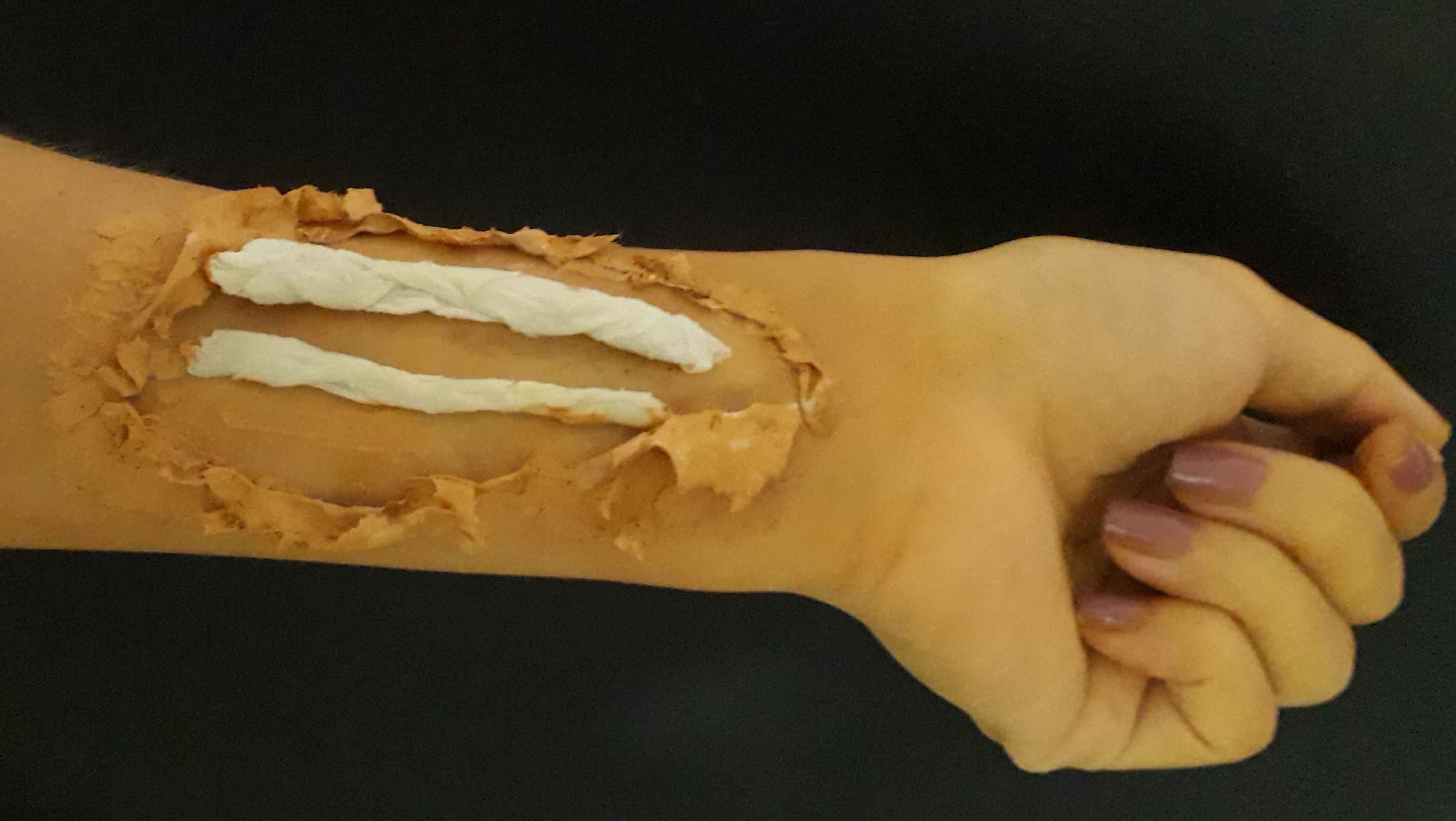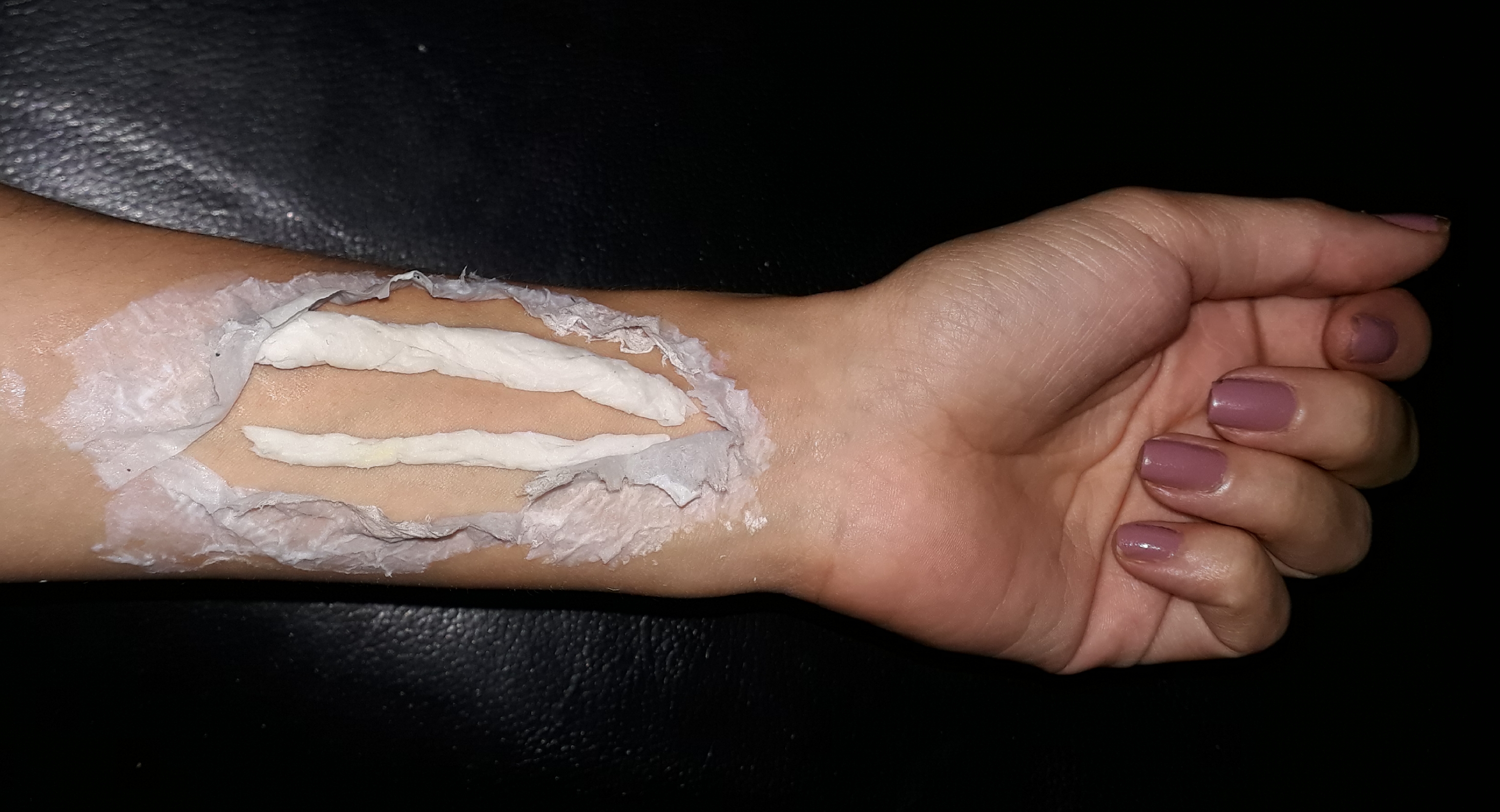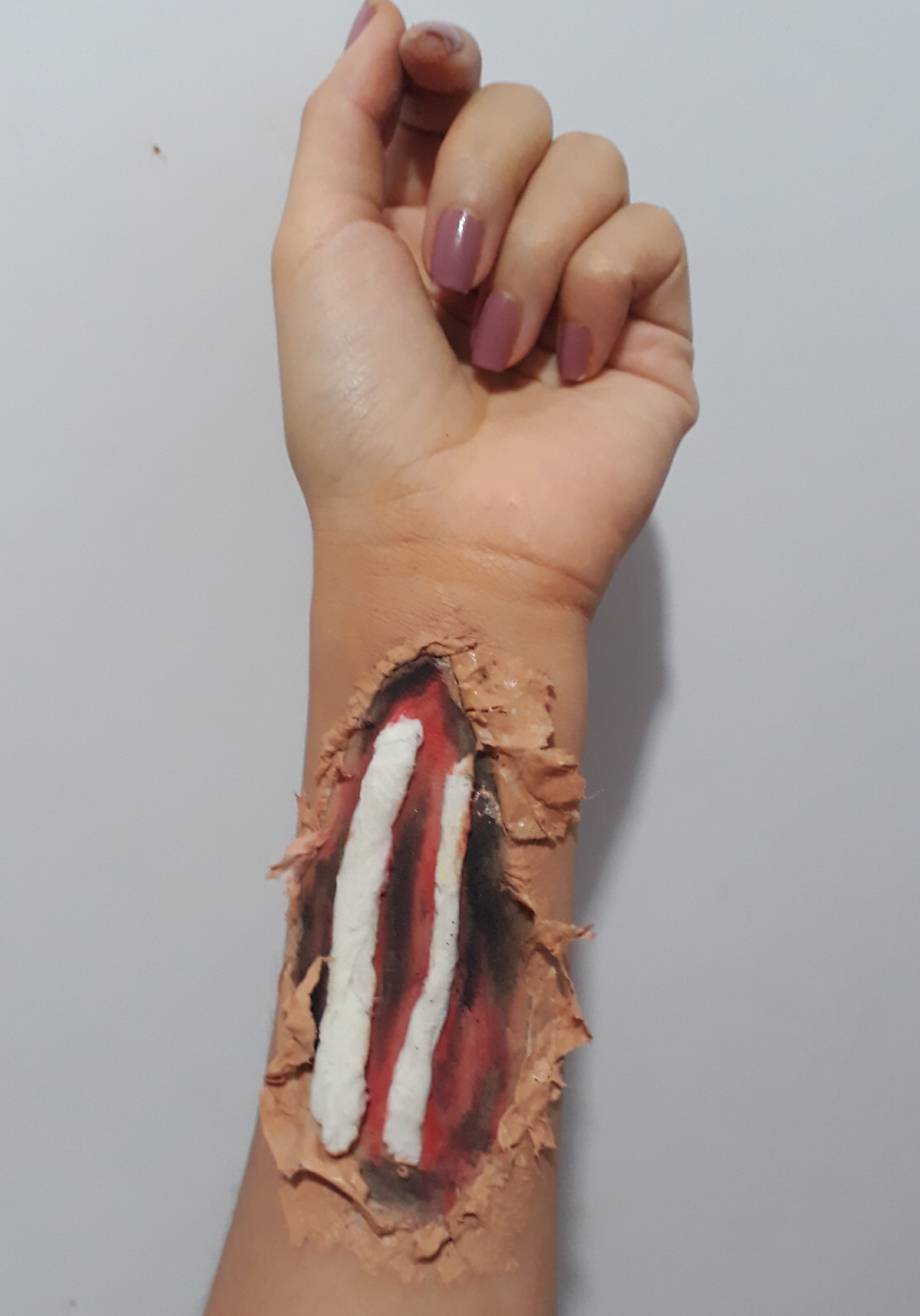 Step 1: mix the glue with a little water, dip the toilet paper or napkin in the mixture and mould it into a few sticks, and then make what looks like bone and then stick it to the skin, then to create the broken layers of skin, cut with your hands, pieces of paper and stick them all around the "bones" creating a dramatic shape like a wound.